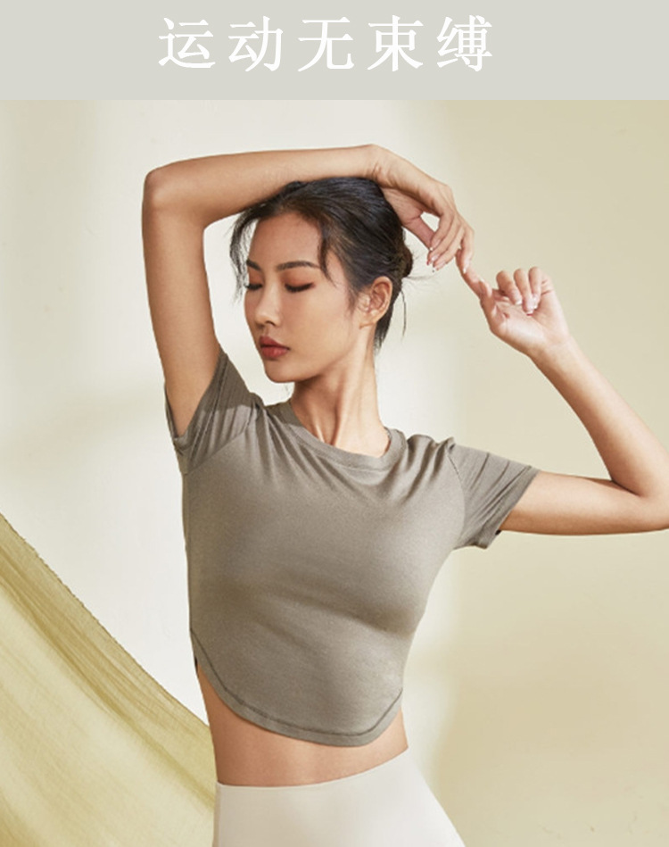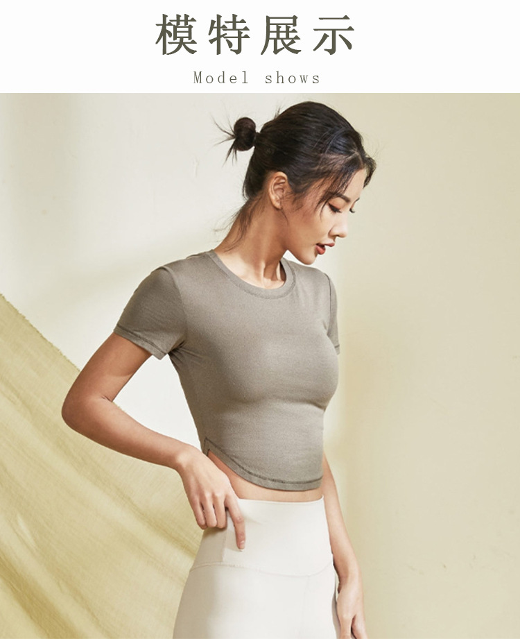 봄, 가을용 여성용 짧은 스포츠 탑, 런닝, 캐주얼, 반팔, 피트니스, 요가복, 크롭 티셔츠, 가슴 패드 포함스토어 가기