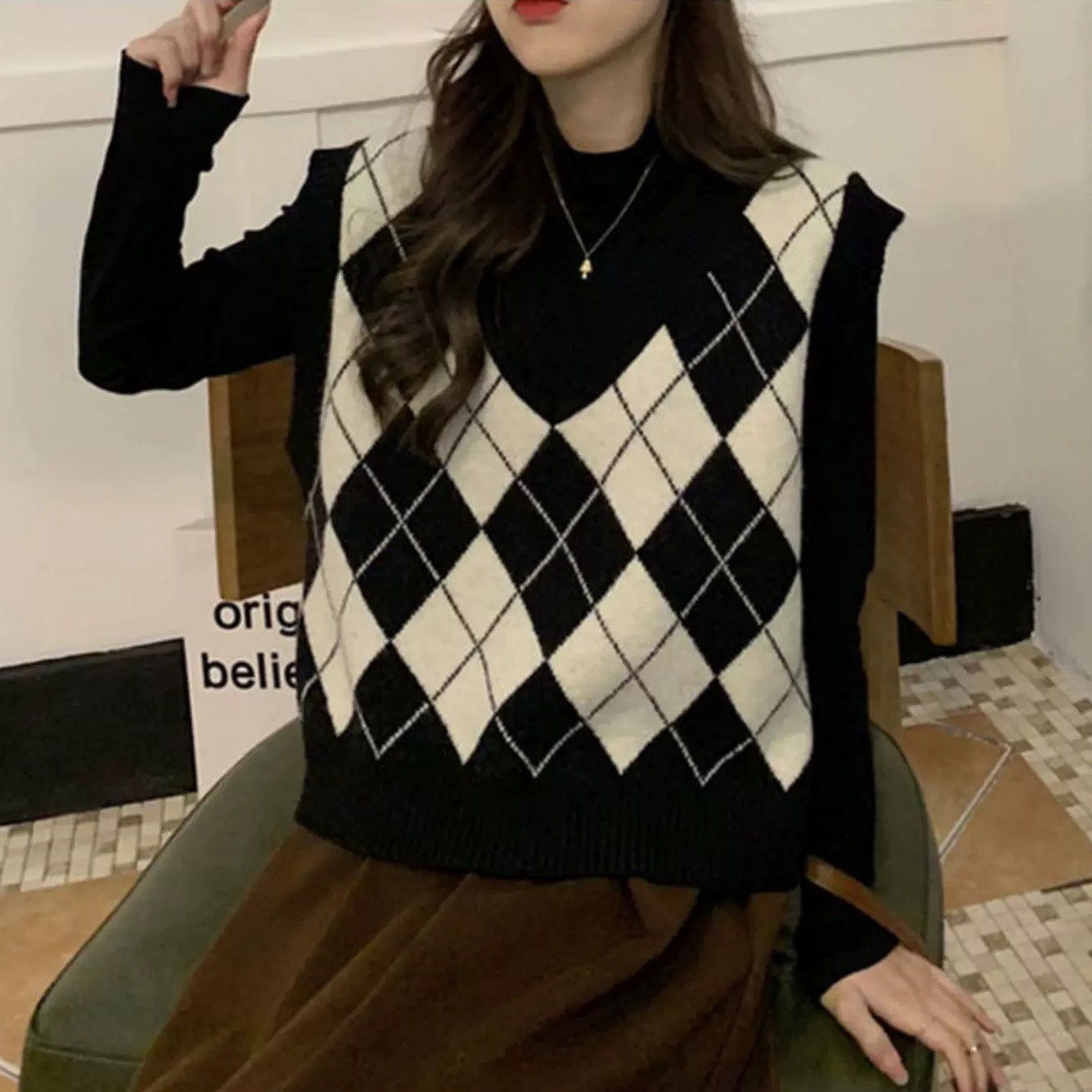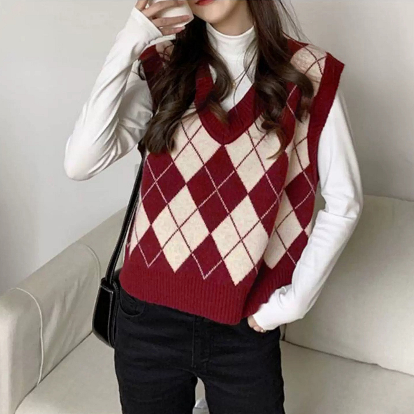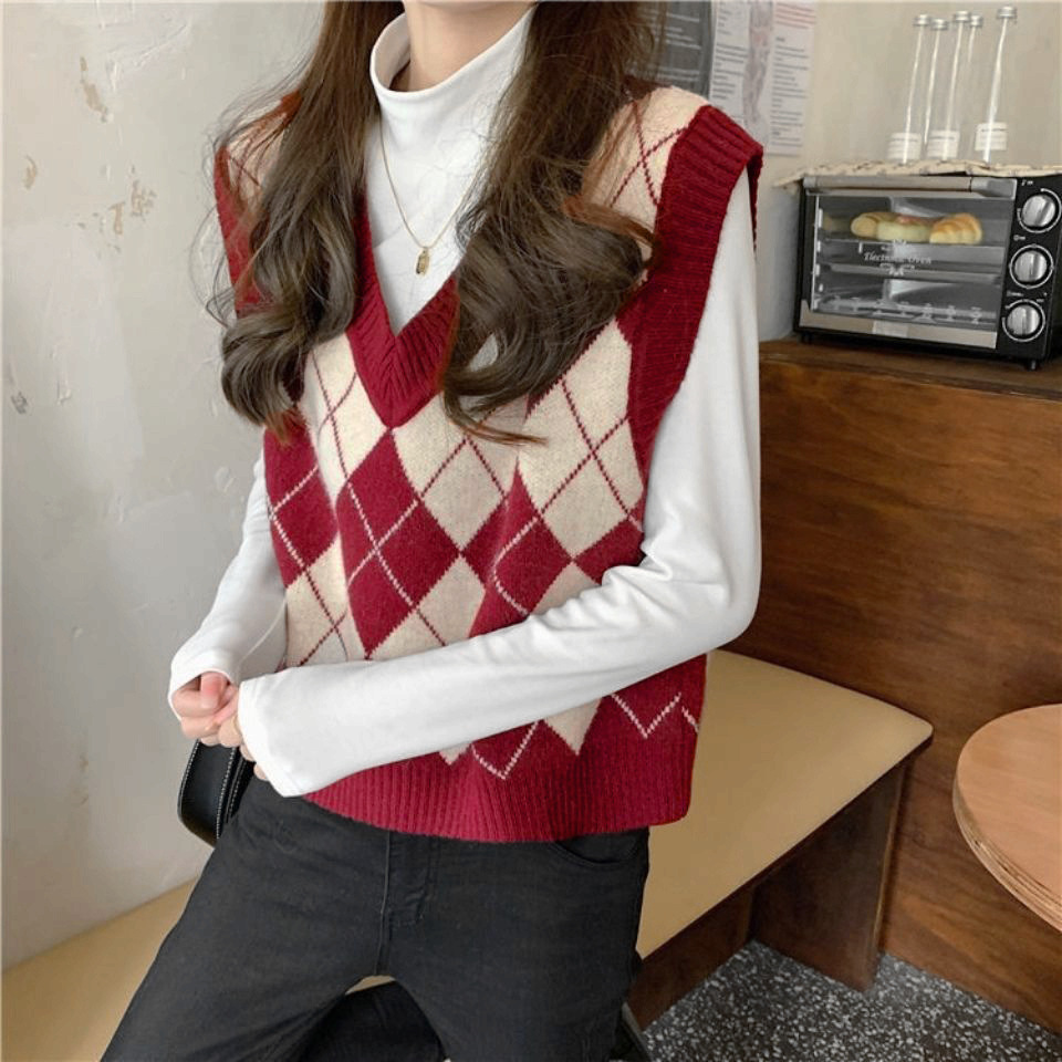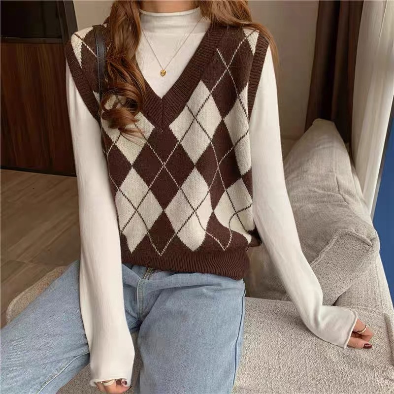레트로 체크 니트 조끼 여성용 아우터 신상 한국 스타일 스웨터 조끼 레이어드 루즈핏 상의 다용도스토어 가기