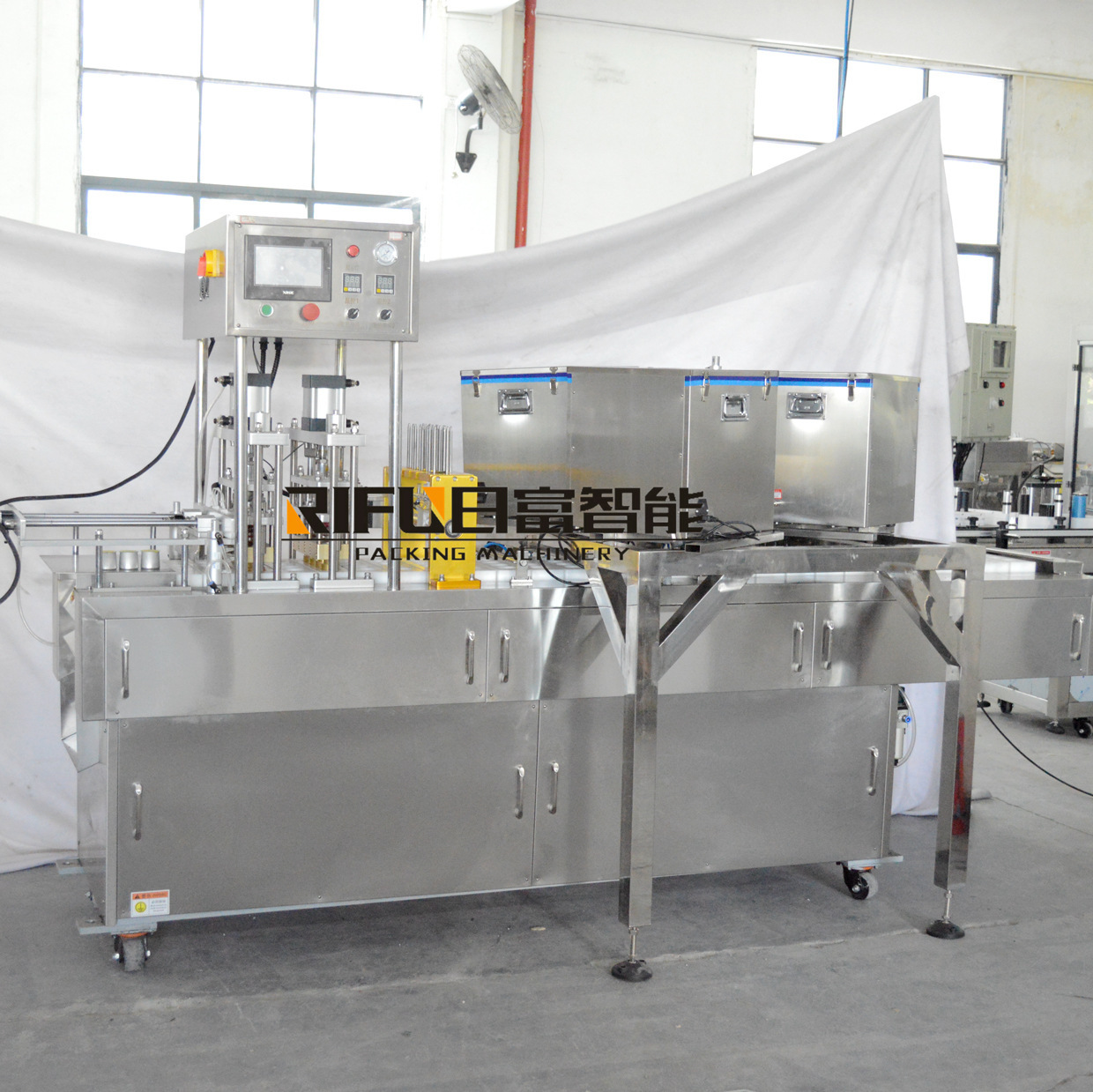 自动灌装封口机采用不锈钢机身PLC控制,自动灌装、放片膜、封口均一次完成,触摸屏式操作界面稳定可靠严格符合食品卫生的要求。该机适用大产能生产企业,主要用杯、盒、碗装牛奶、酸奶、果冻、方便面、藕粉、米线等食品、饮料的灌装封口,也可以用于其它异型杯的封口。自动灌装,自动下片面,自动封口、自动出杯;采用进口无级变速系统,可调节生产速度;采用凸轮分度器,使下膜定位精确,机器运转平稳;吸盖与封口同时完成,下膜移动对盖膜定位精度无影响;准确的二次封口、封口压力可调整,封口强度好;操作简便、安全。