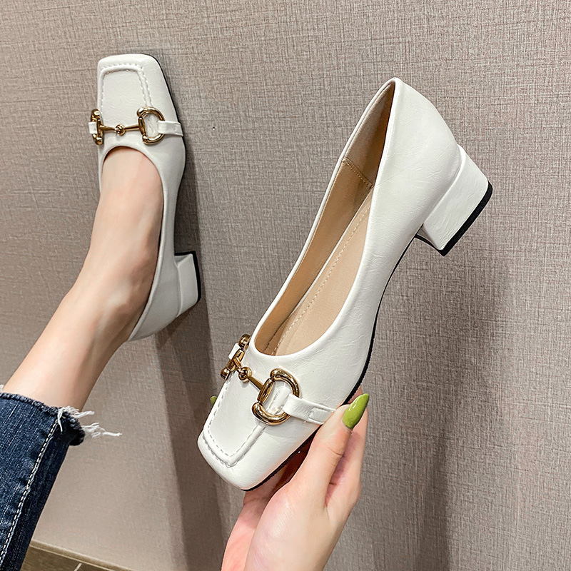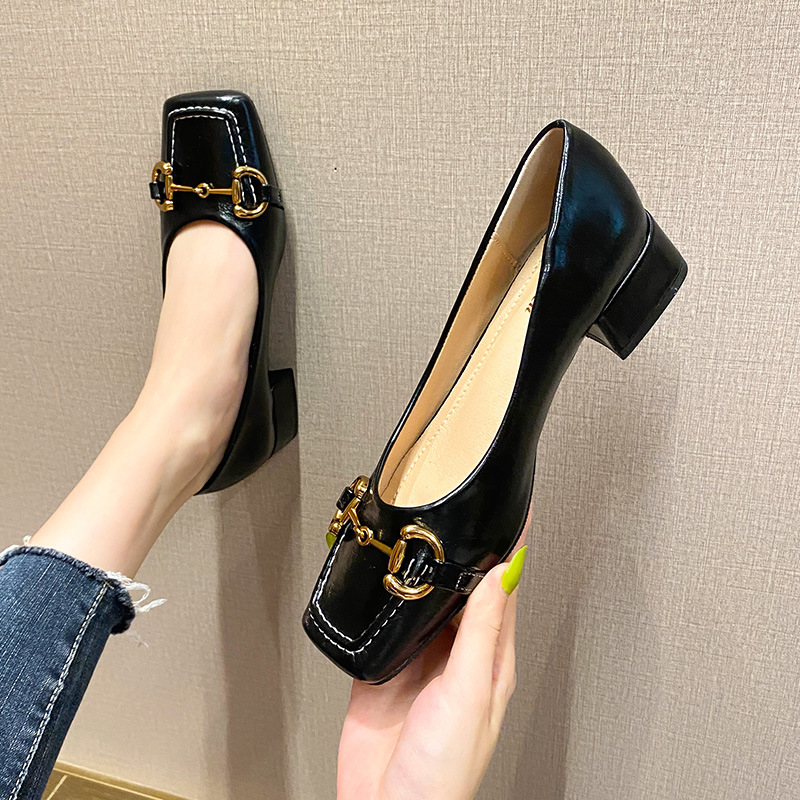2024 프렌치 스타일 말버클 슈즈, 패셔너블한 두꺼운 굽, 스퀘어 토, 메탈 장식, 얕은 굽의 메리제인 여성화, 대형 사이즈, 한국 스타일 여성화스토어 가기
