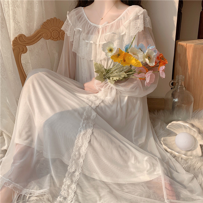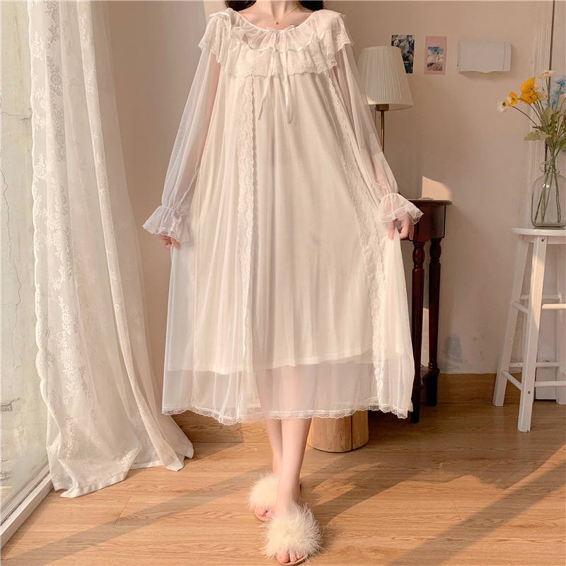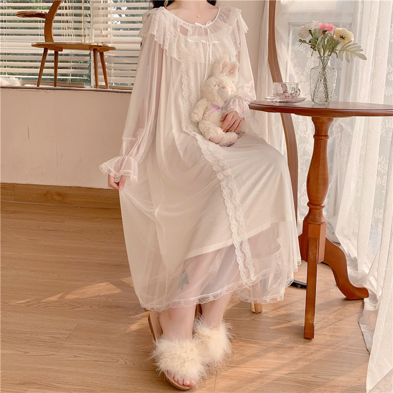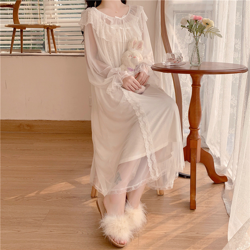 2026년 봄 신상 한국 스타일의 달콤한 메쉬 리본 레이스 패치워크 긴팔 잠옷 여성용스토어 가기