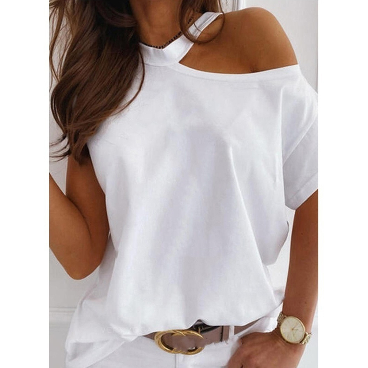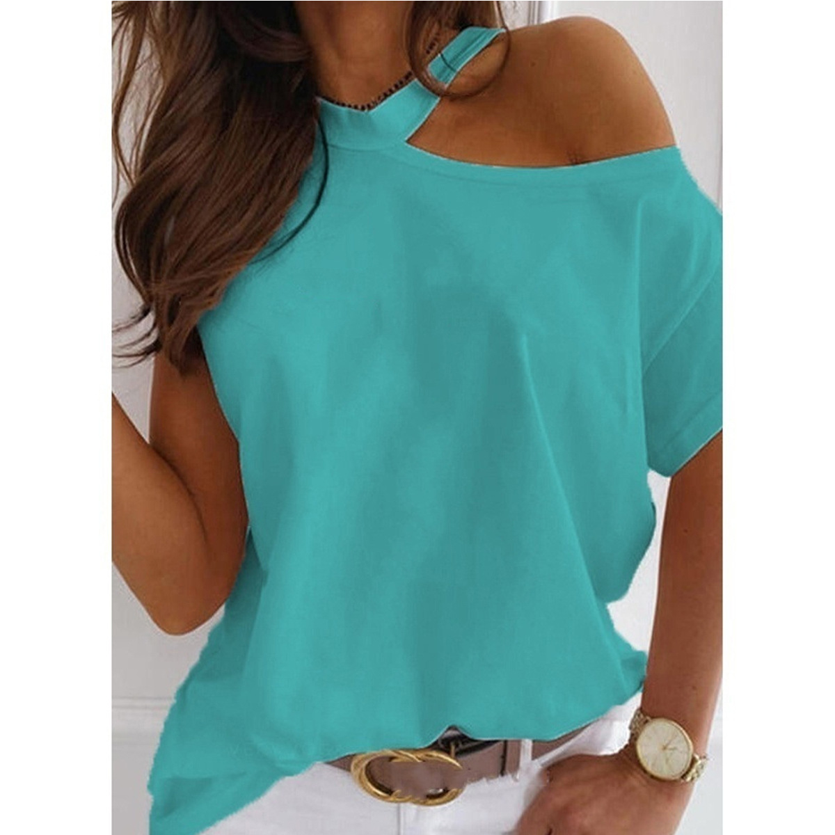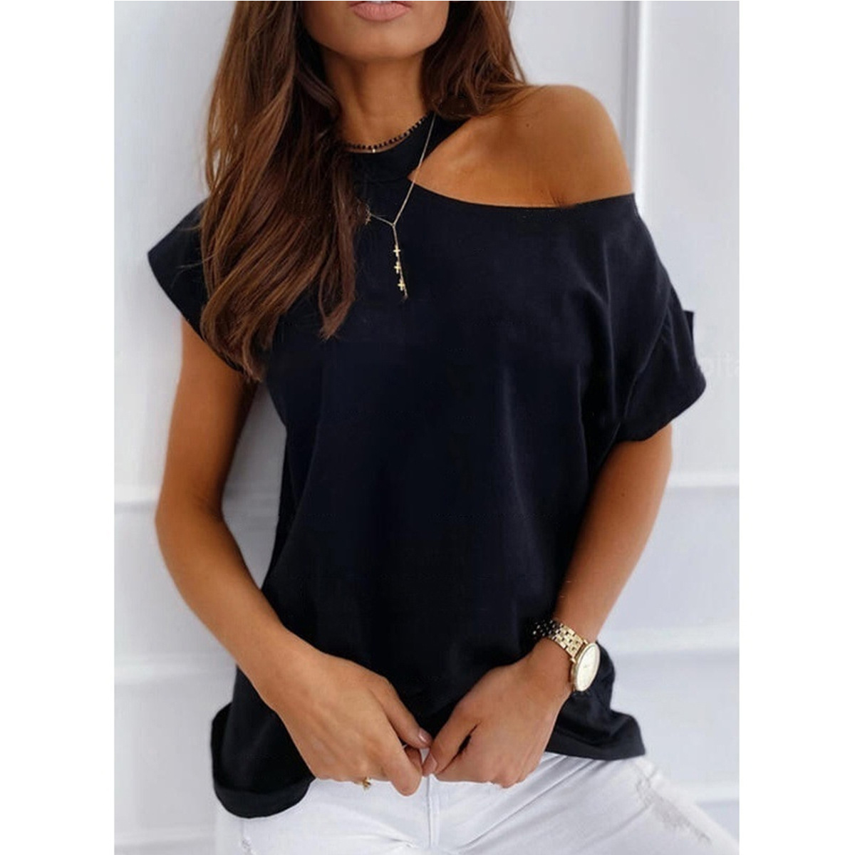 재고 국경 간 대외 무역 2023 봄과 여름 아마존 새로운 유럽과 미국 콜드 숄더 티셔츠 칼라 단색 여성용 티셔츠