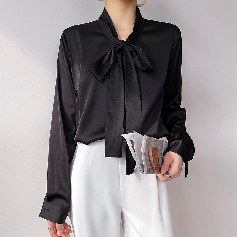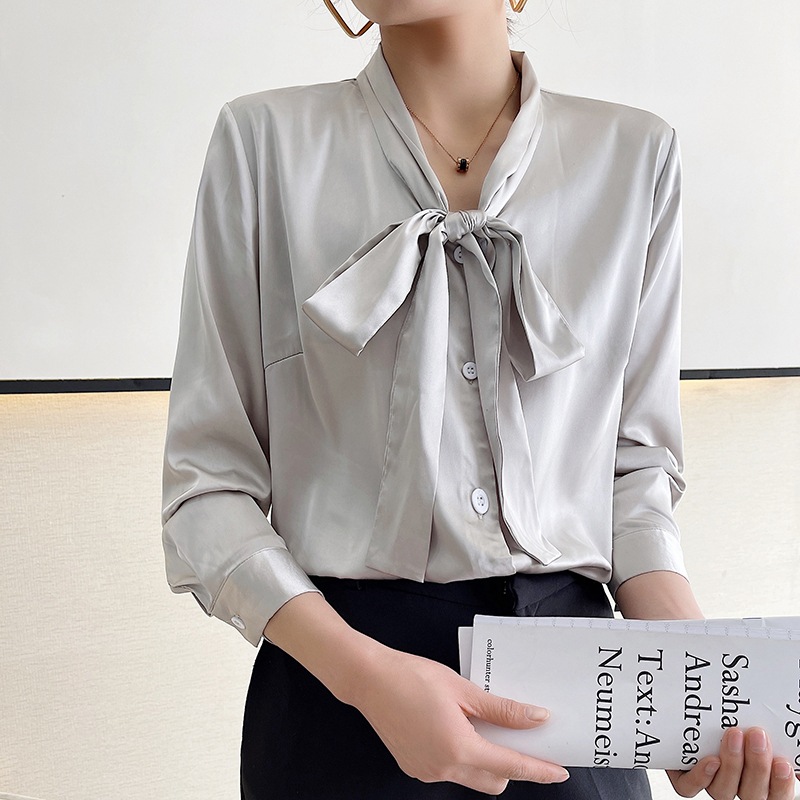 봄과 여름 새로운 리본 V-넥 새틴 데이프 실크 셔츠 여성 패션 세련된 무거운 셔츠 Triacetate 탑스토어 가기