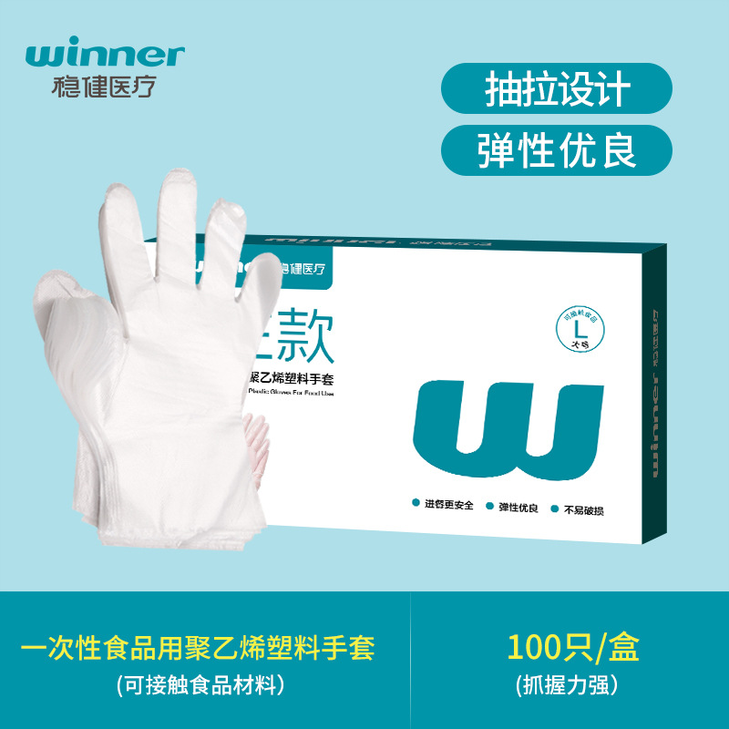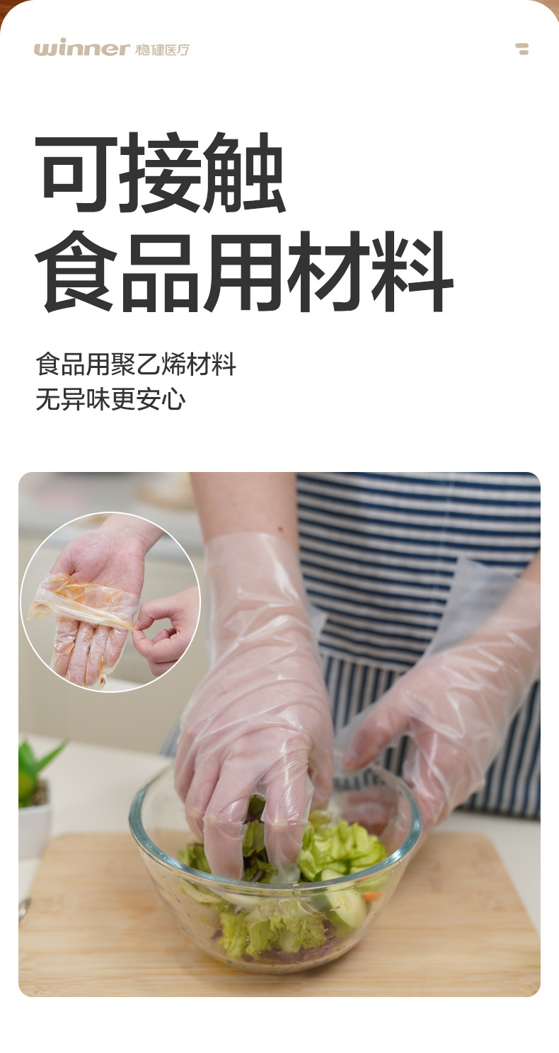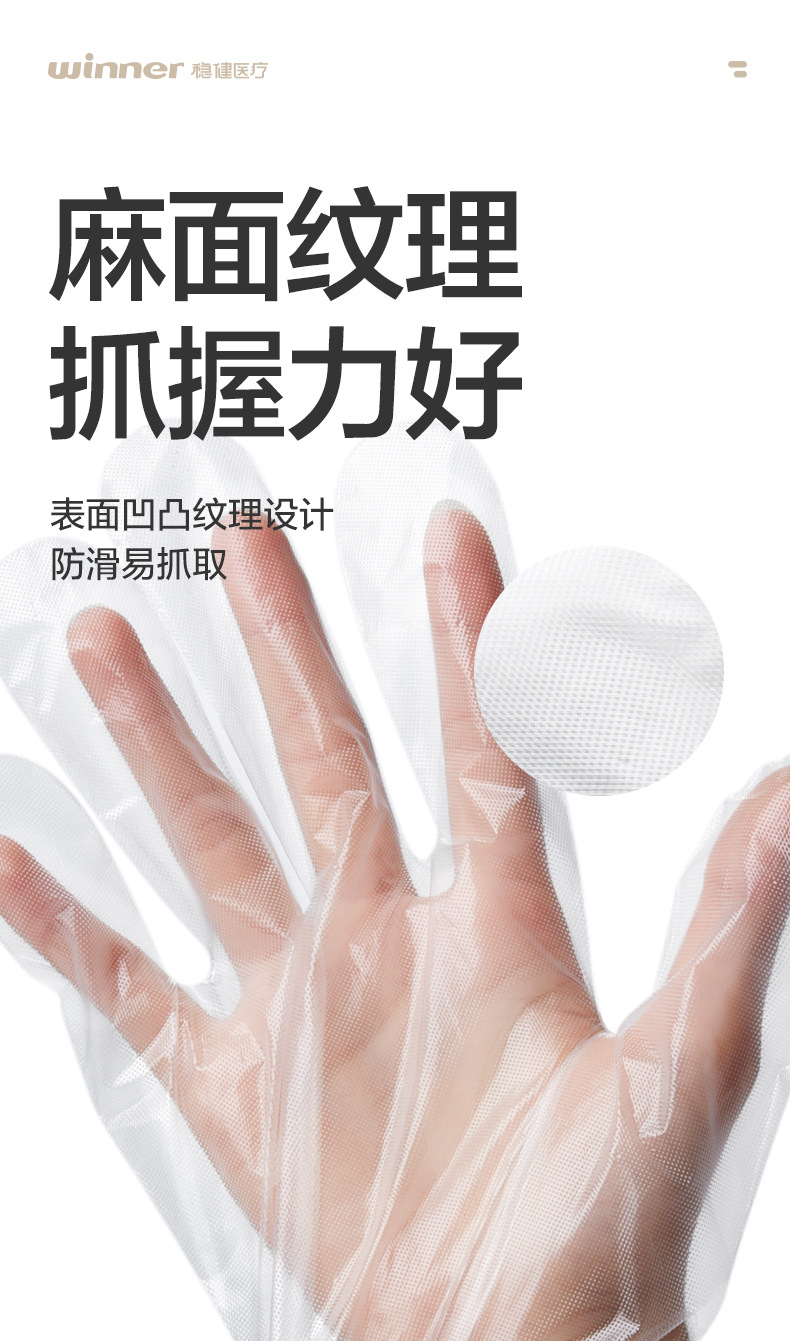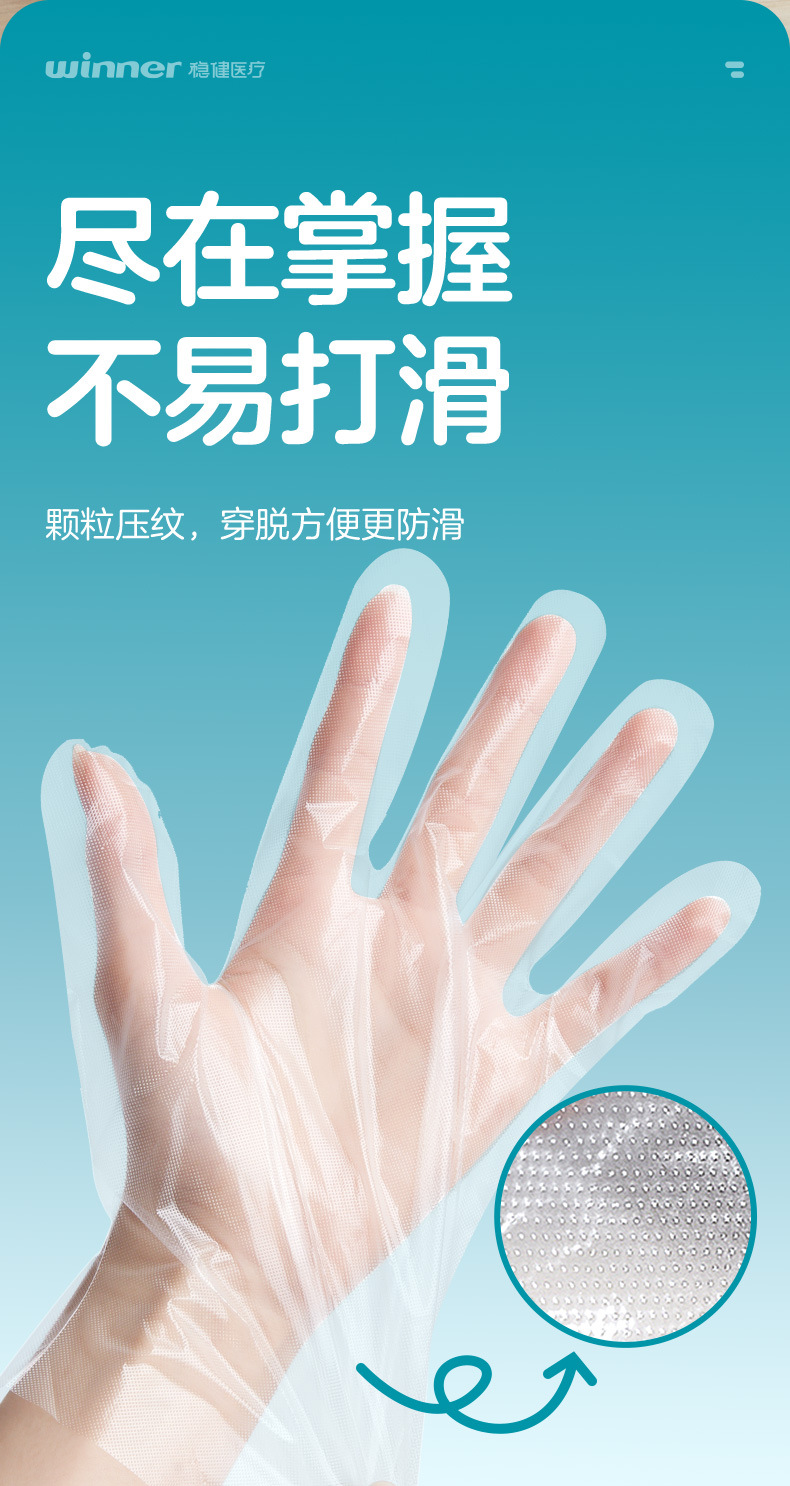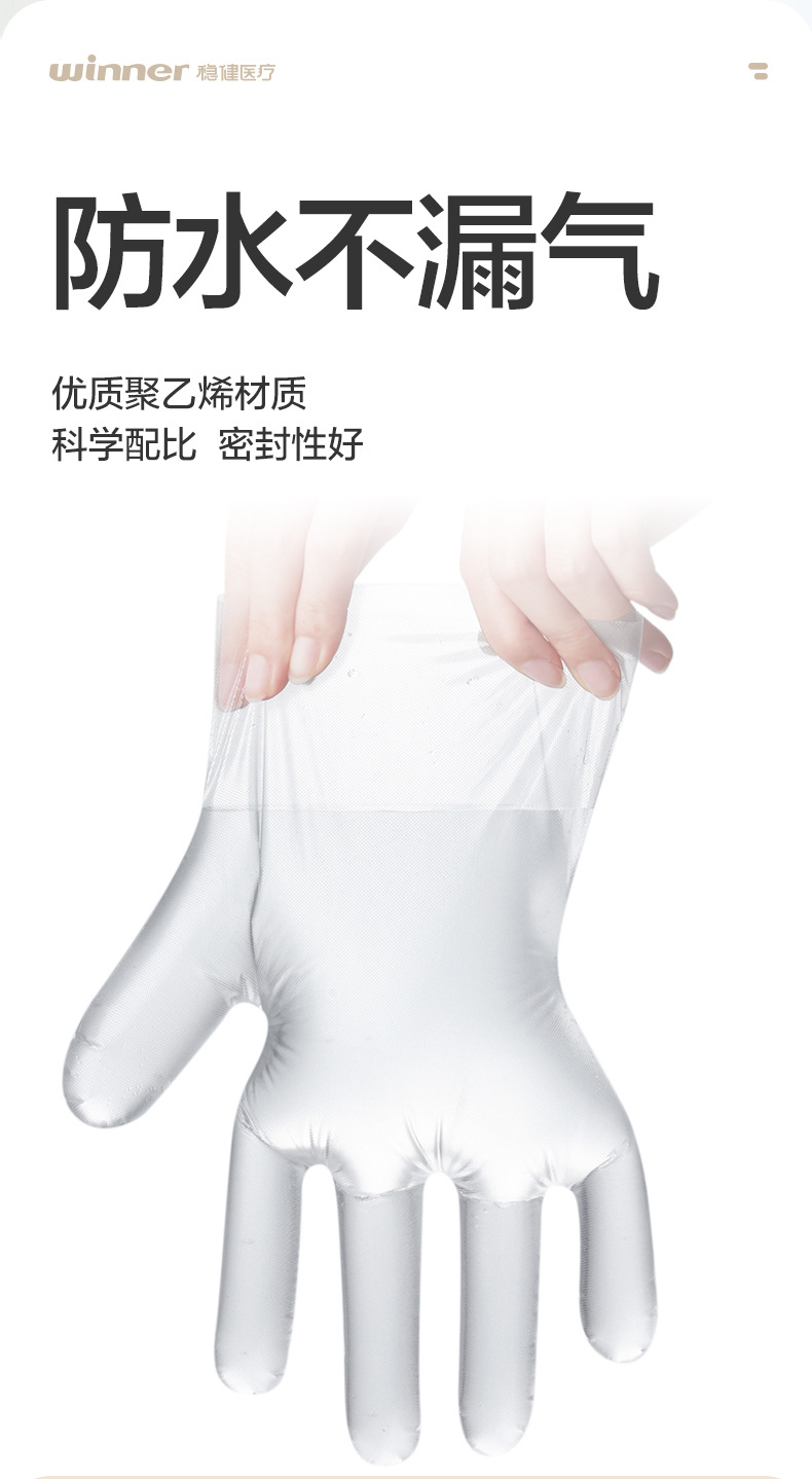 우승자 강력한 의료 일회용 검사 장갑 PE 플라스틱 투명 미끄럼 방지 얇은 100/상자
