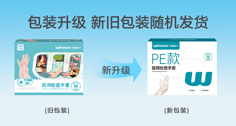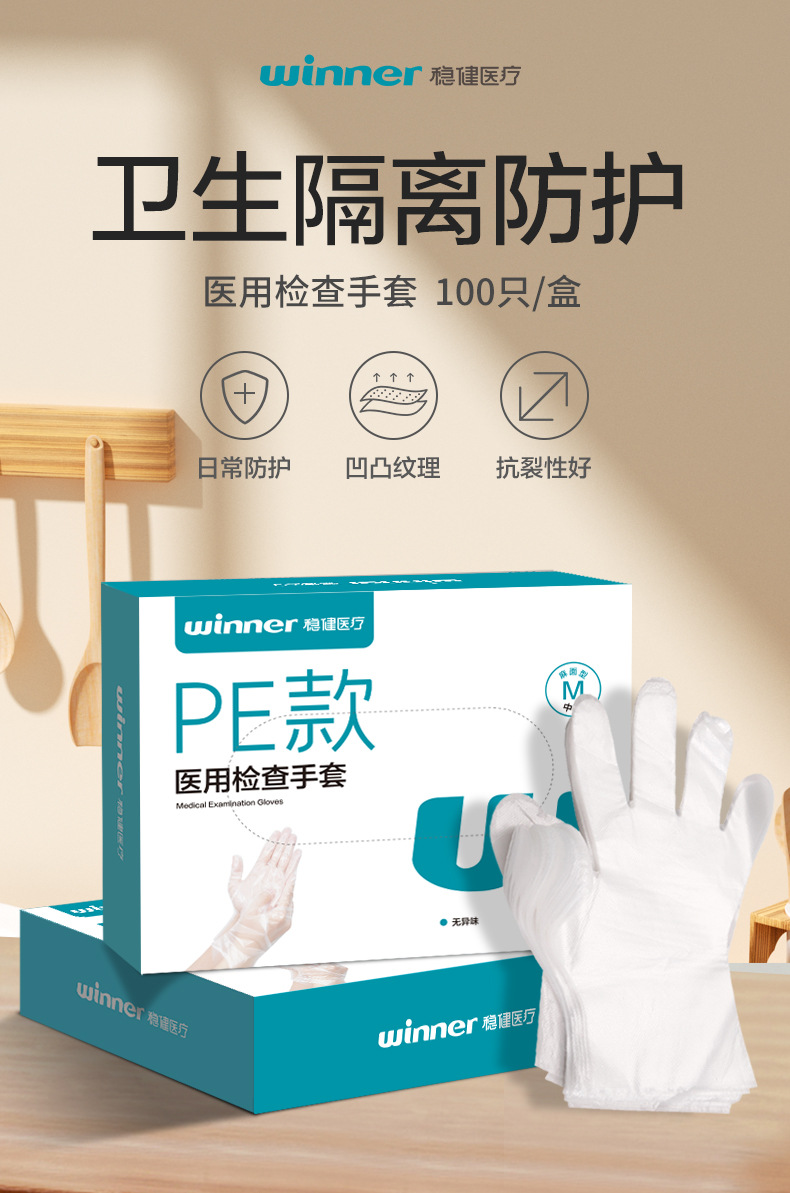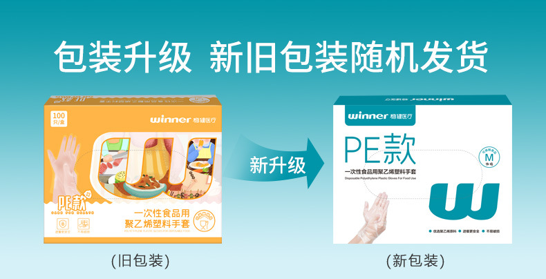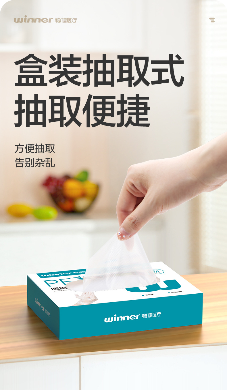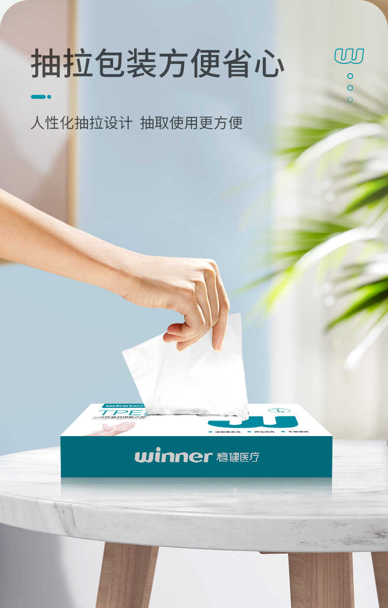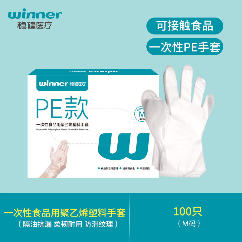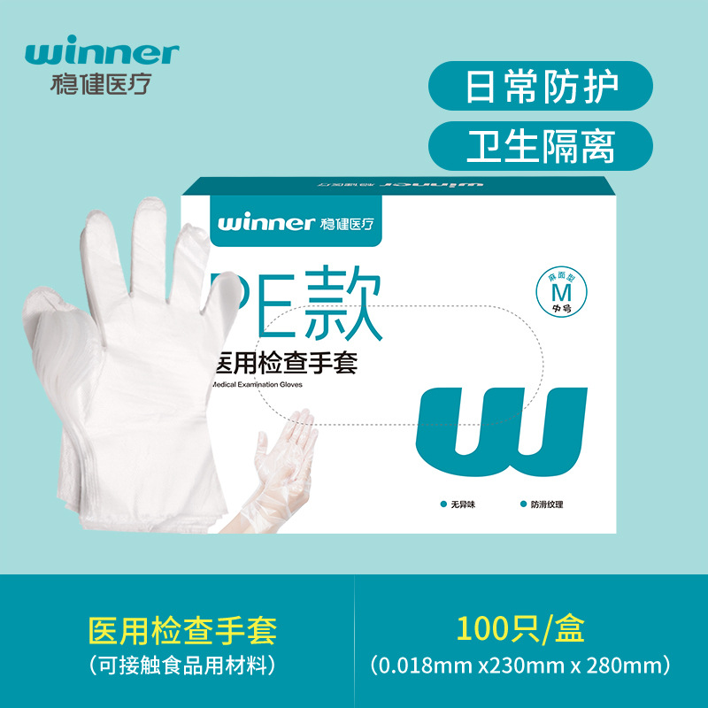 우승자 강력한 의료 일회용 검사 장갑 PE 플라스틱 투명 미끄럼 방지 얇은 100/상자