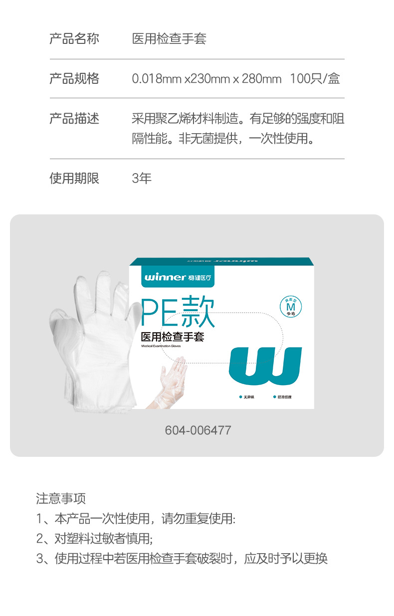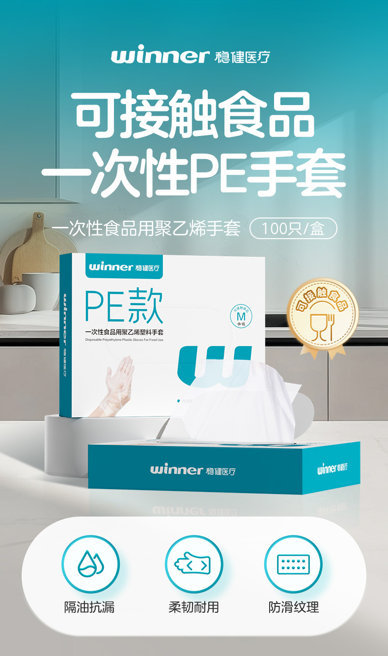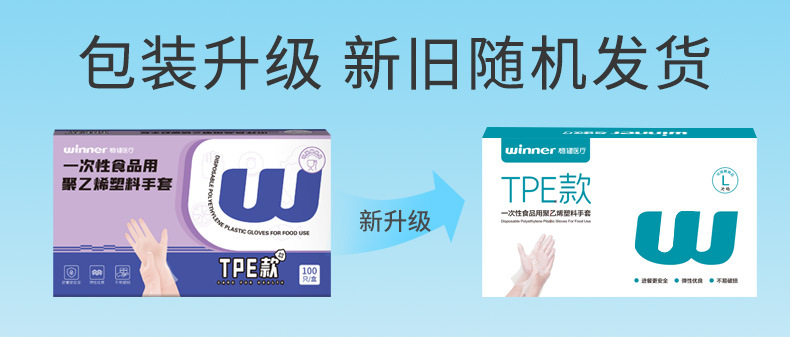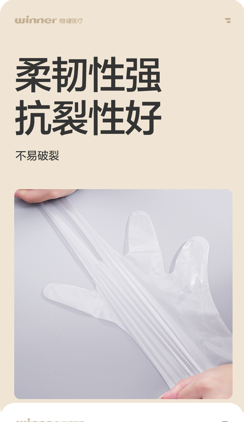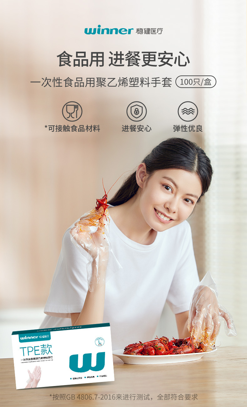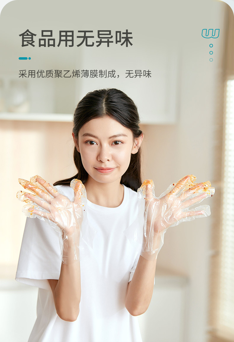 우승자 강력한 의료 일회용 검사 장갑 PE 플라스틱 투명 미끄럼 방지 얇은 100/상자