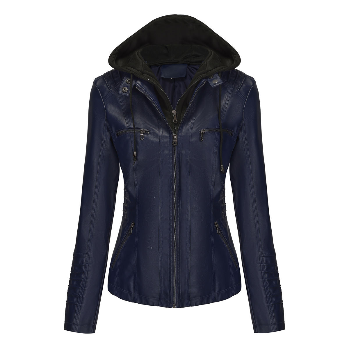 23 유럽과 미국 크로스 보더 후드 가죽 자켓 투피스 세트 이동식 플러스 사이즈 가죽 자켓 여성용 봄과 가을 코트 여성용 PU 워시 가죽