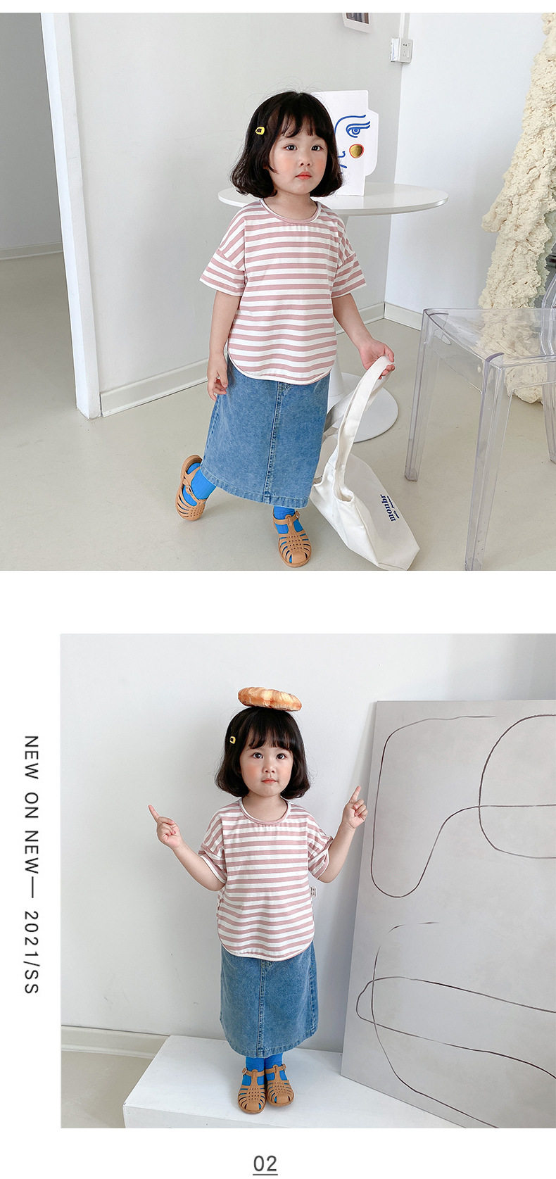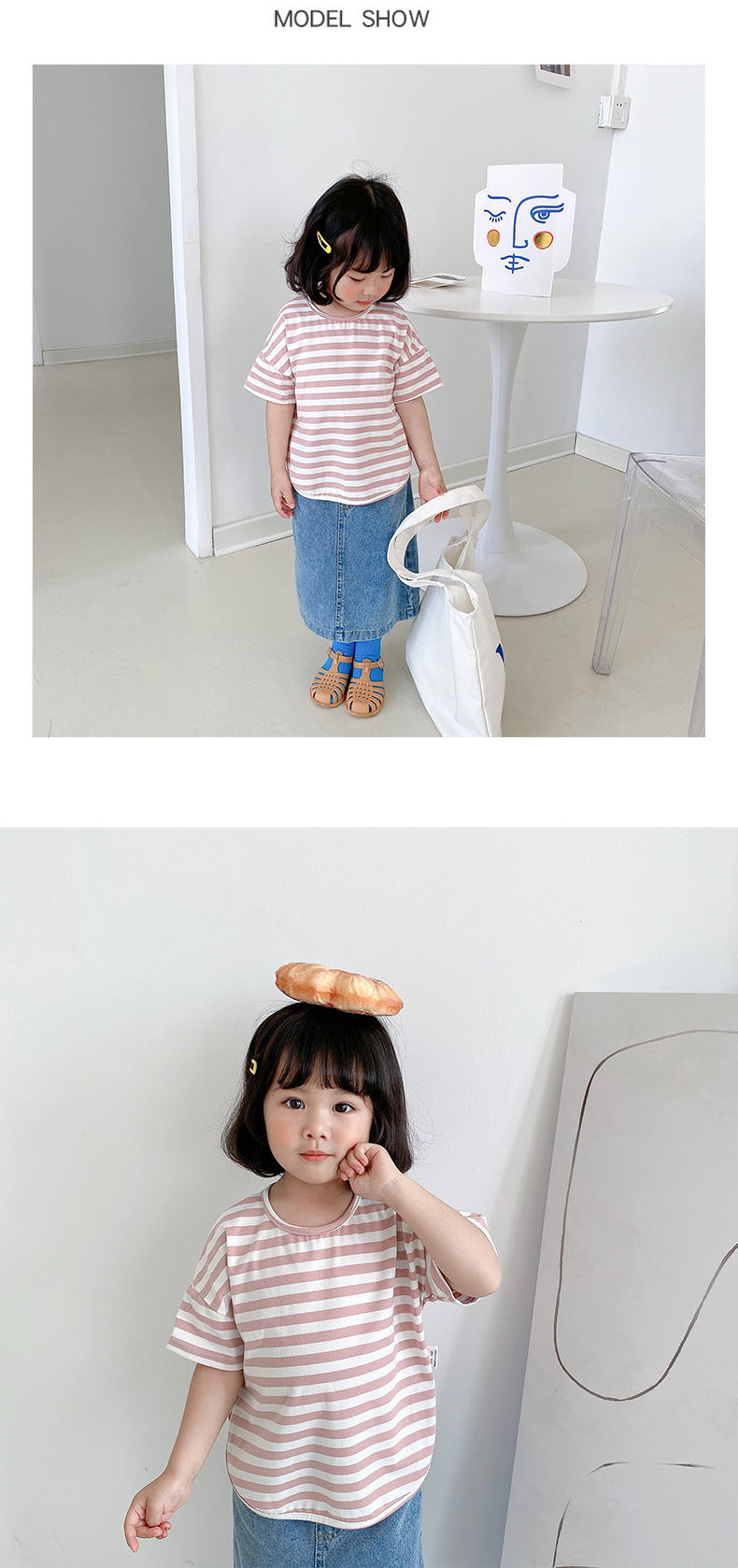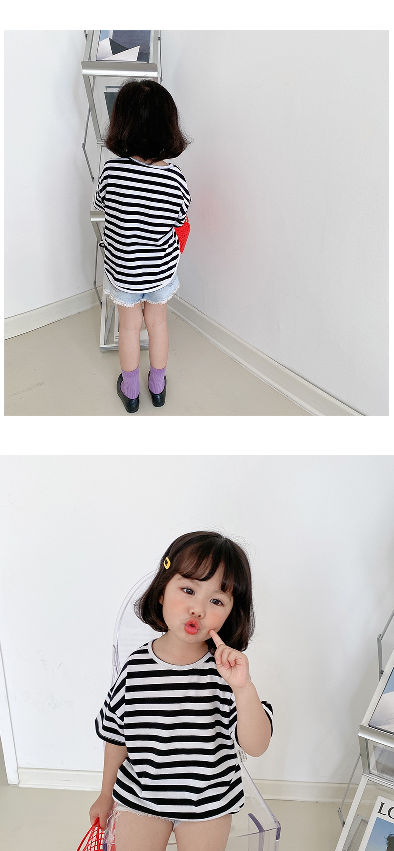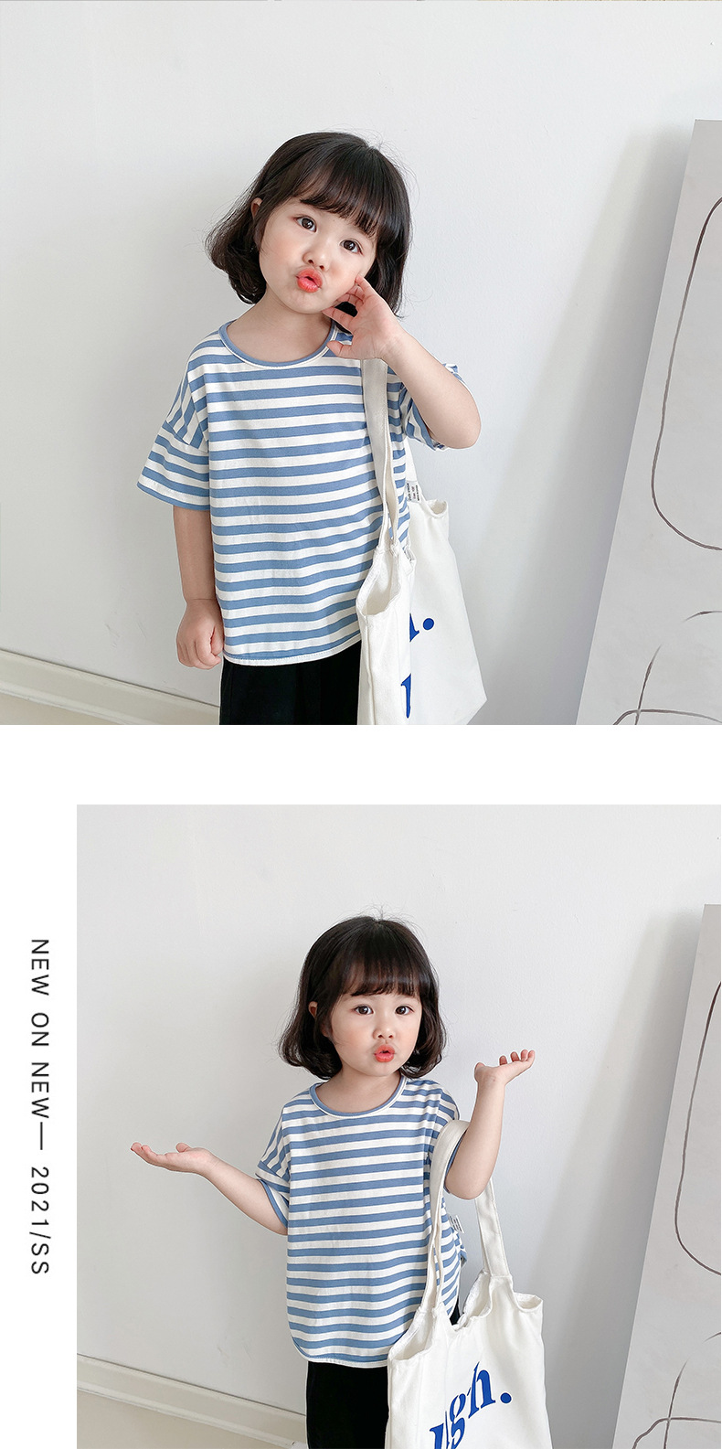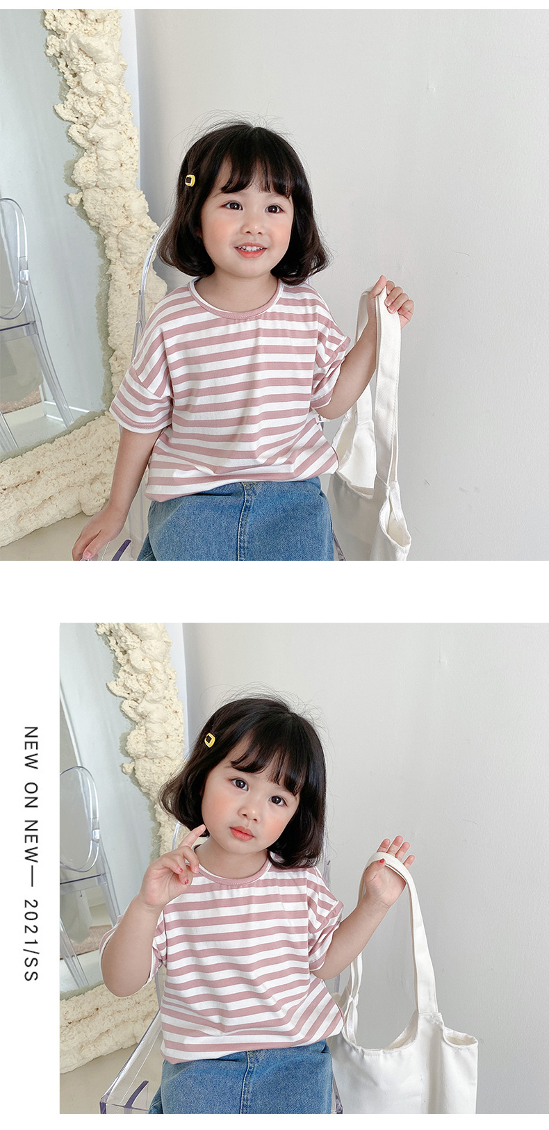 기본 아동 스트라이프 반팔 티셔츠 여아 라운드 넥 스플릿 배트 탑 코튼 한국 아동복 도매스토어 가기