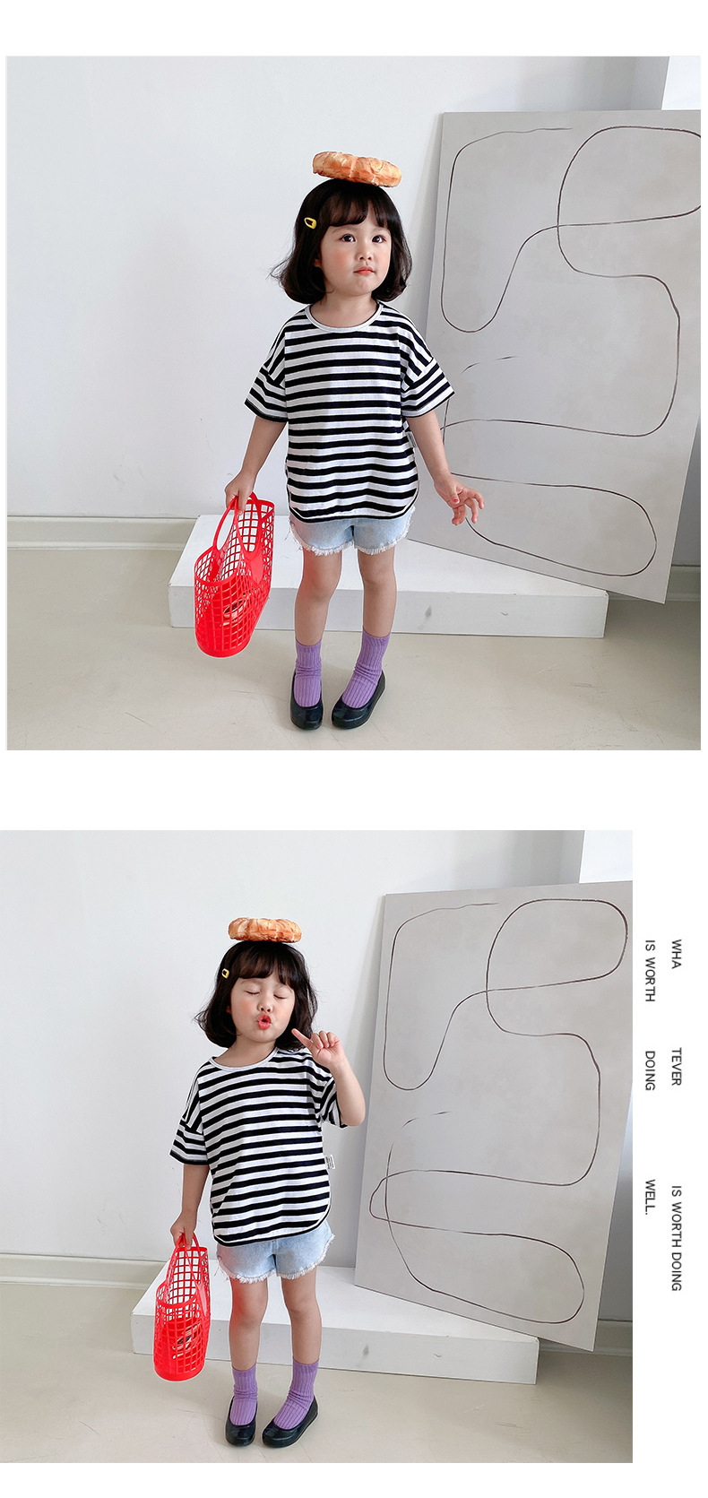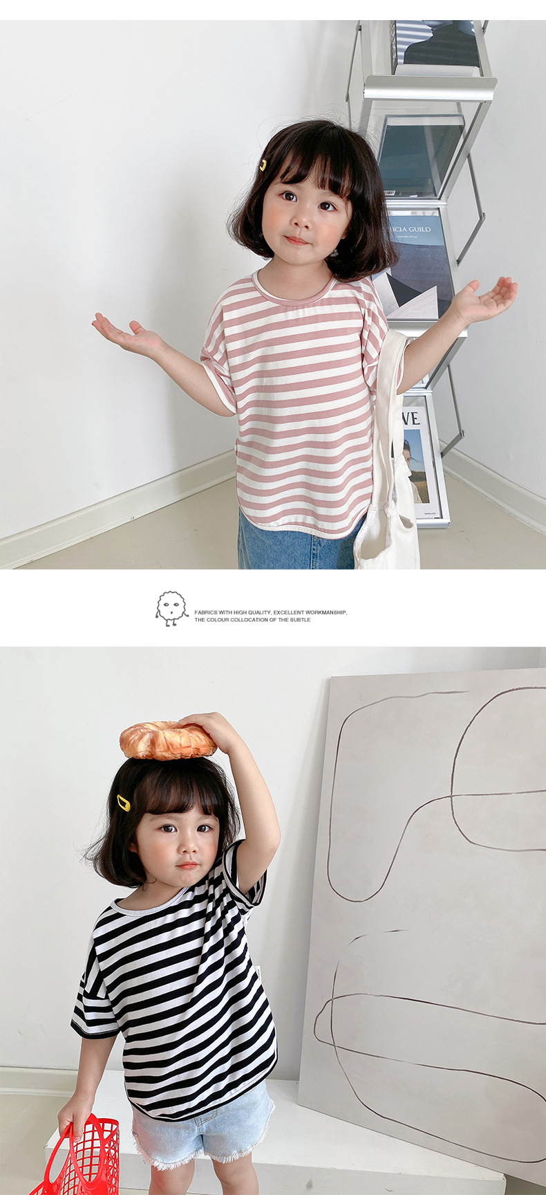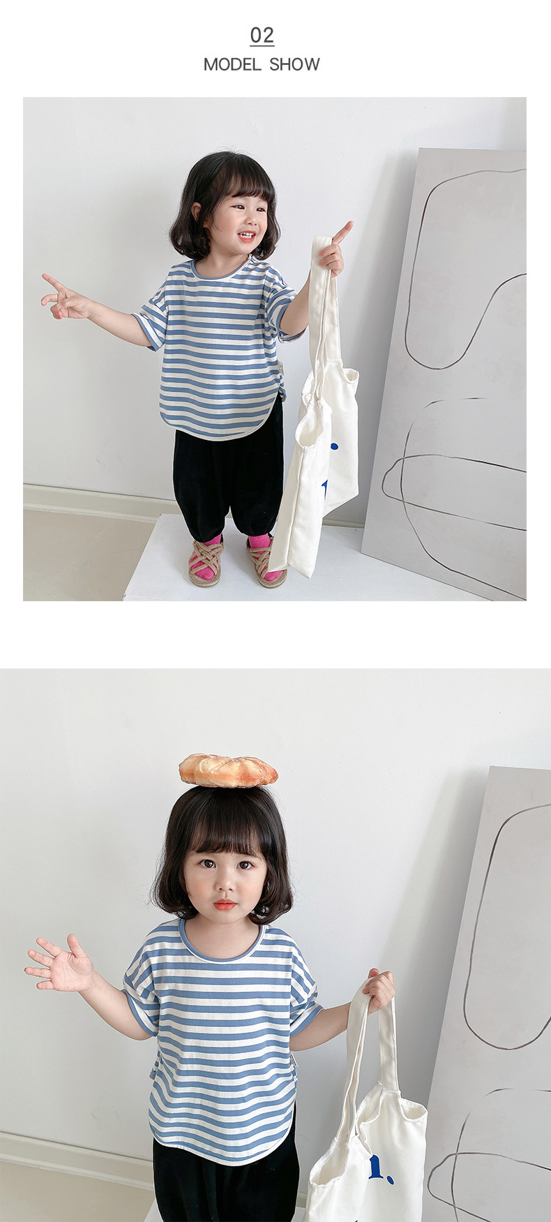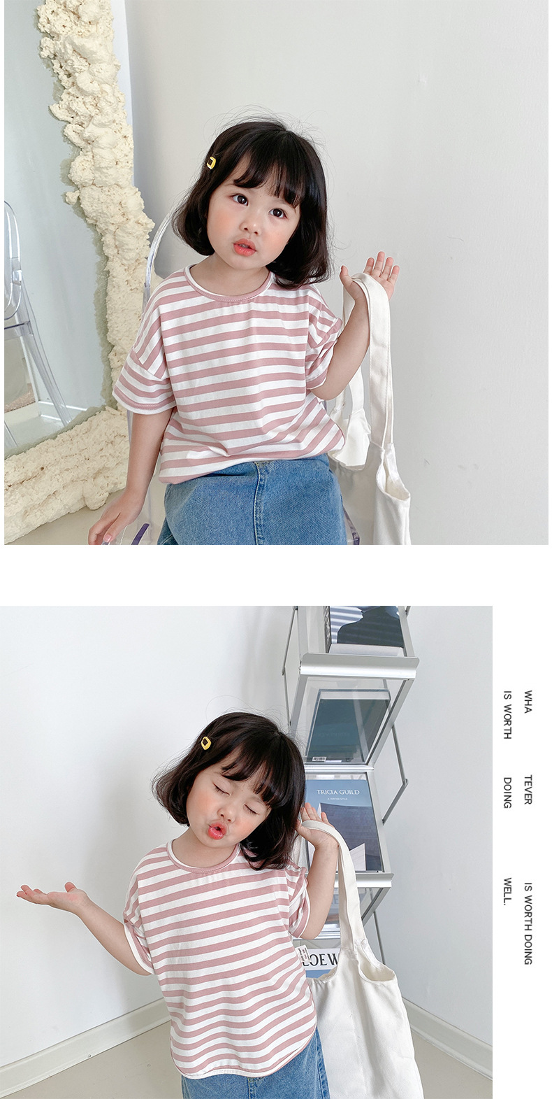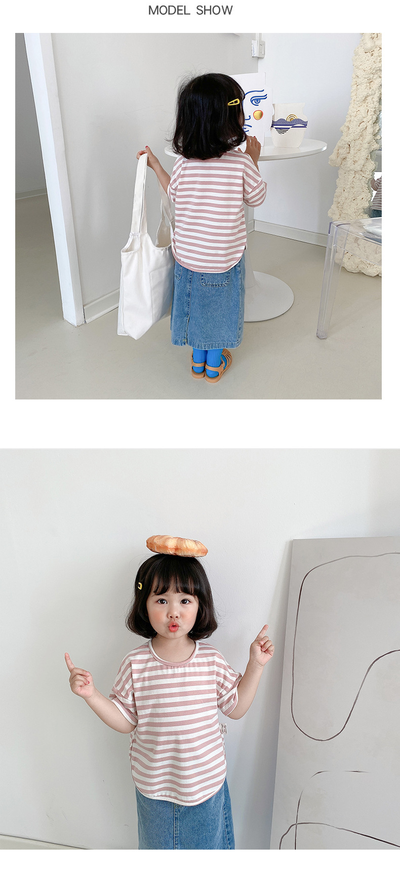 기본 아동 스트라이프 반팔 티셔츠 여아 라운드 넥 스플릿 배트 탑 코튼 한국 아동복 도매스토어 가기