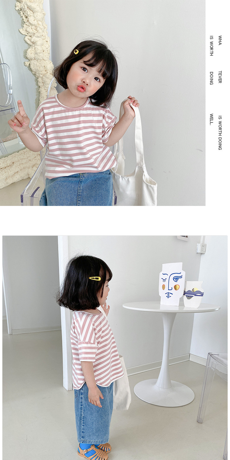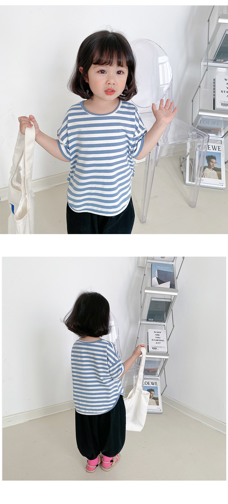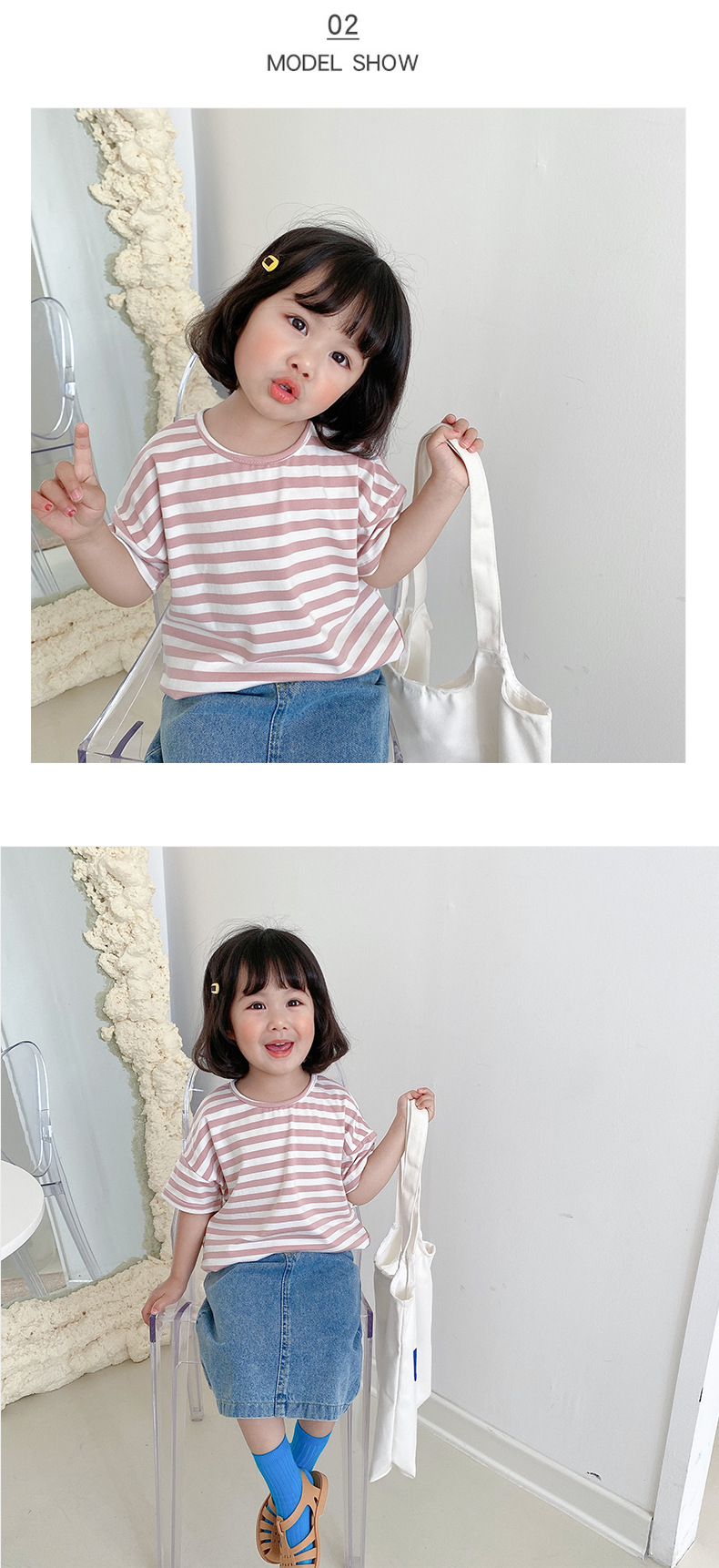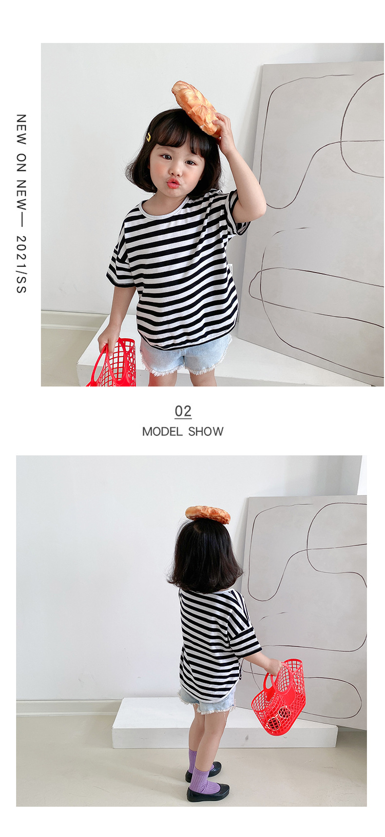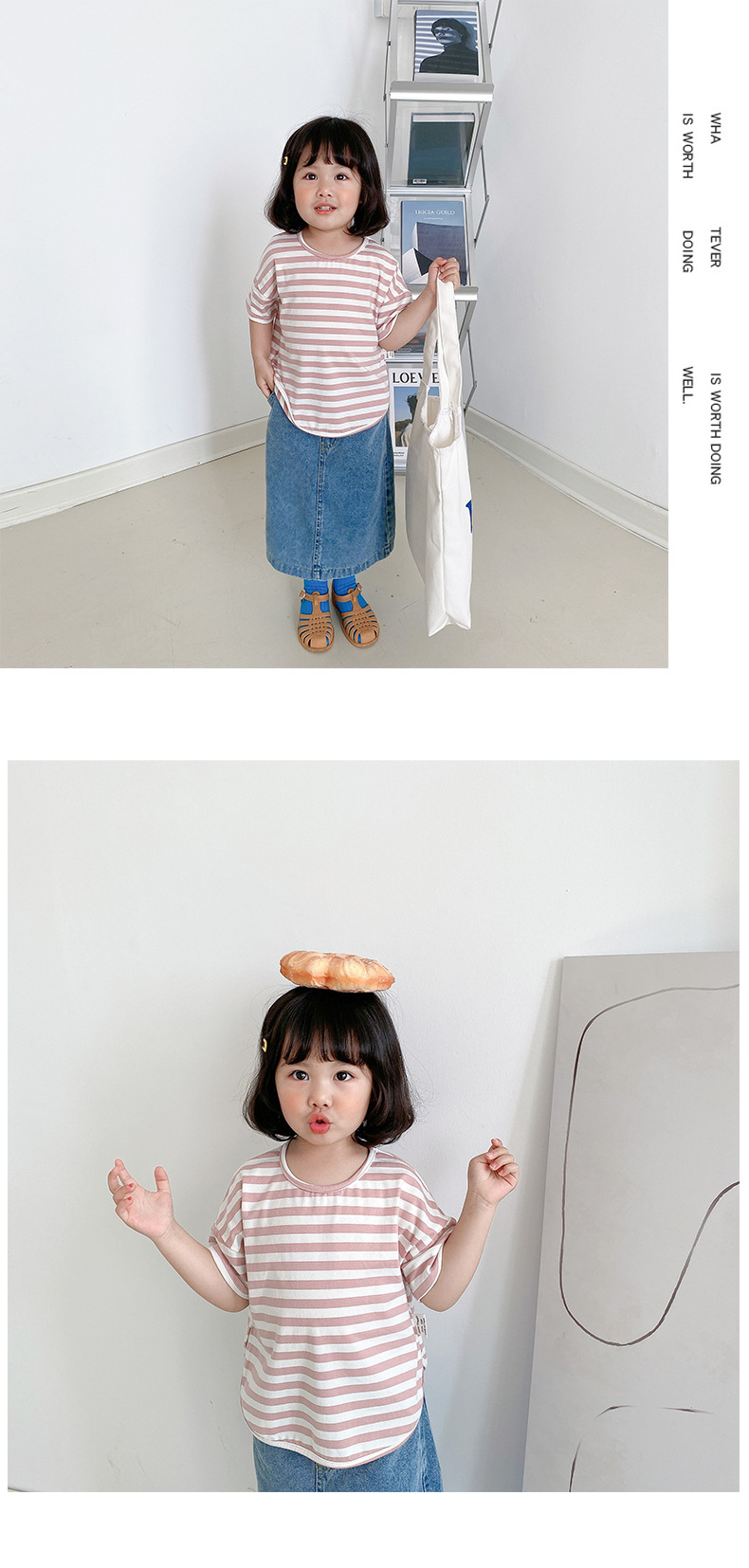 기본 아동 스트라이프 반팔 티셔츠 여아 라운드 넥 스플릿 배트 탑 코튼 한국 아동복 도매스토어 가기