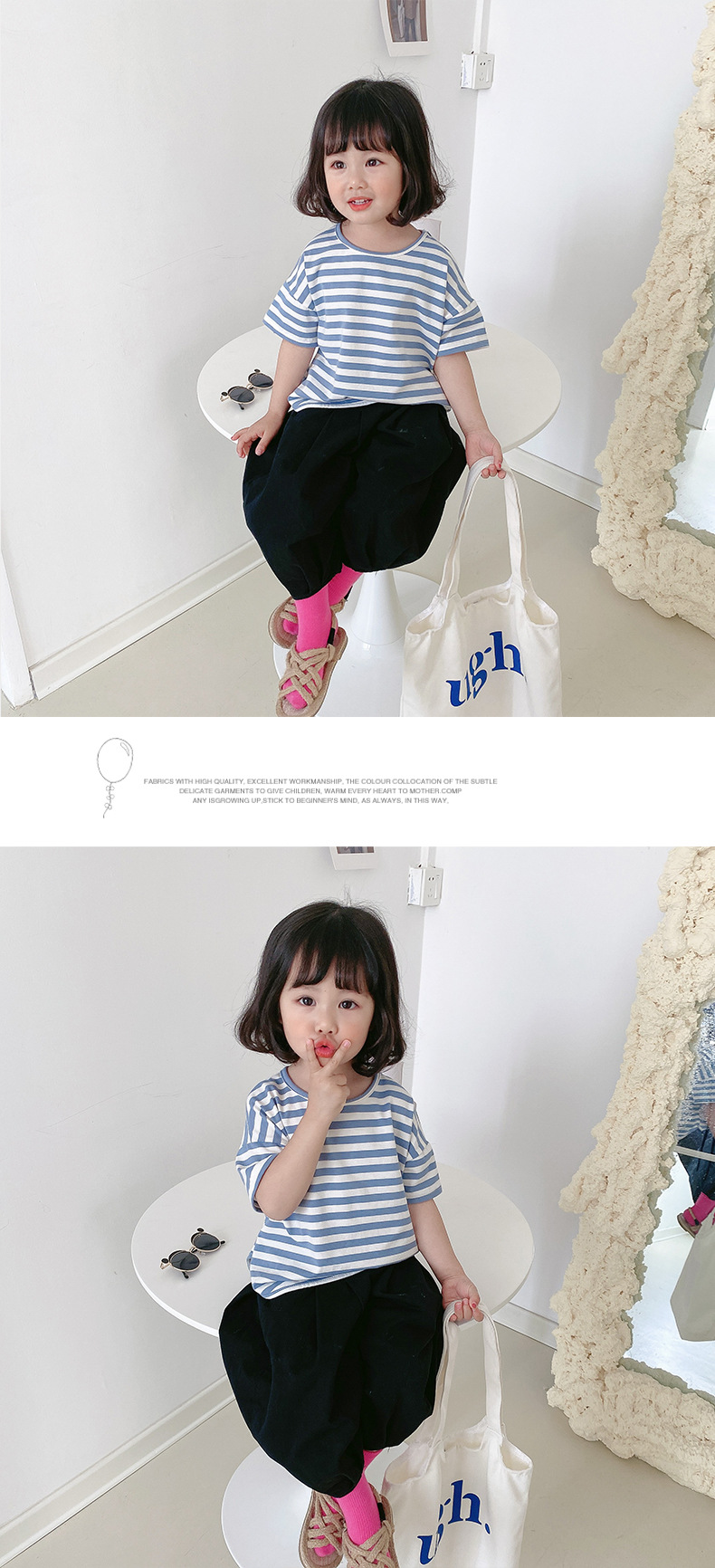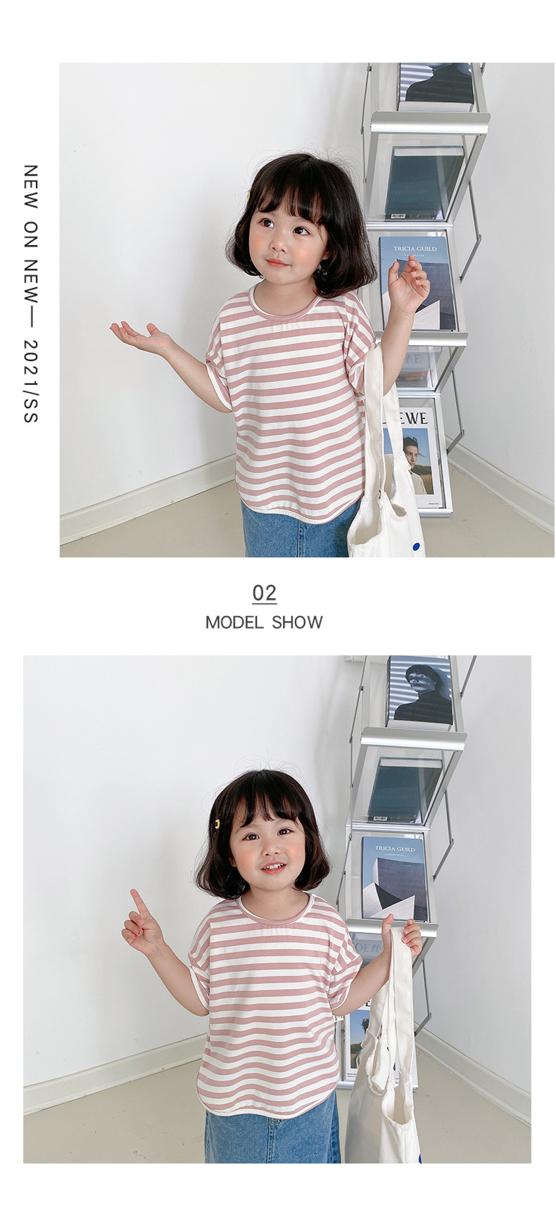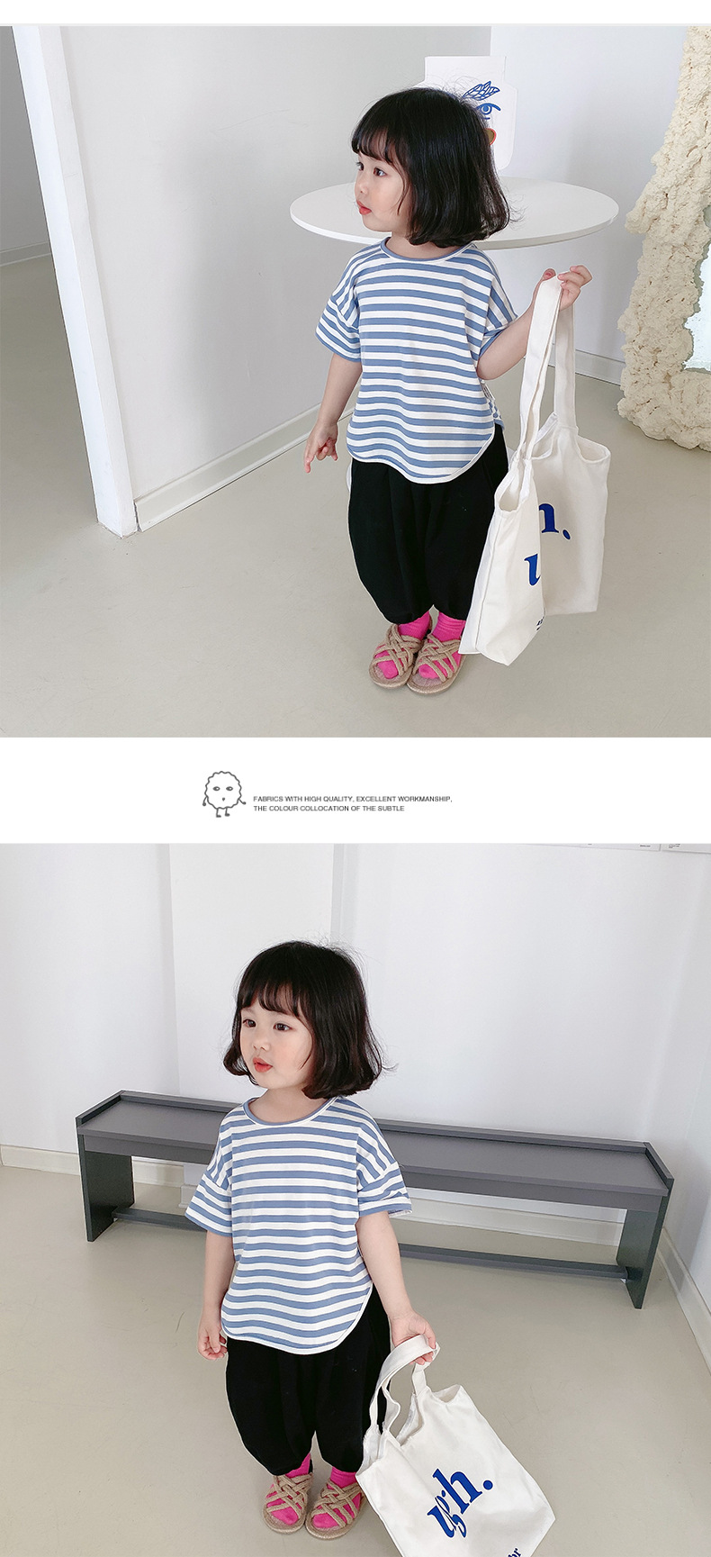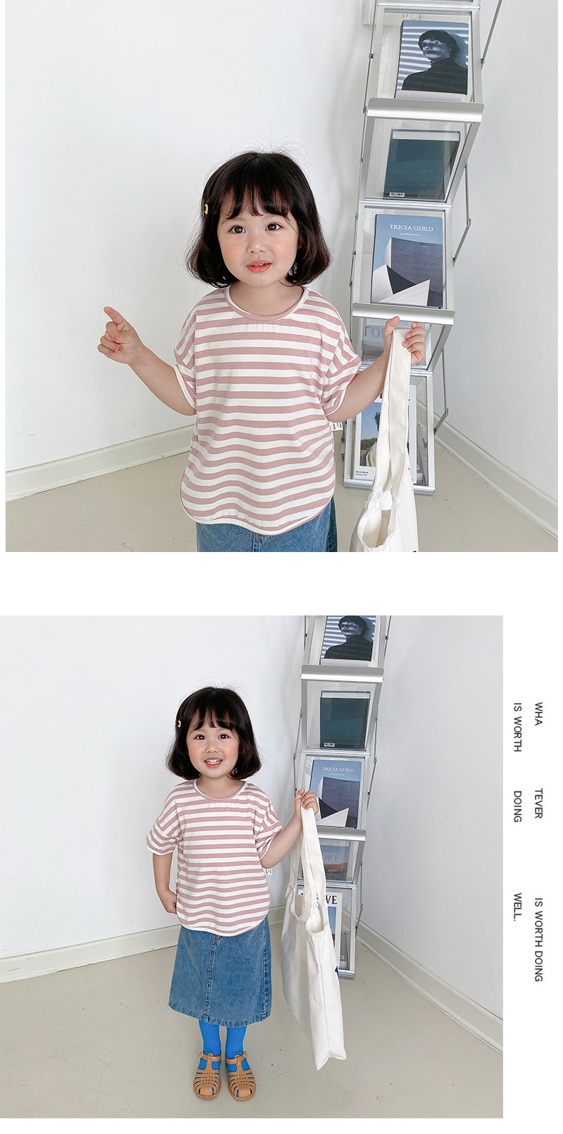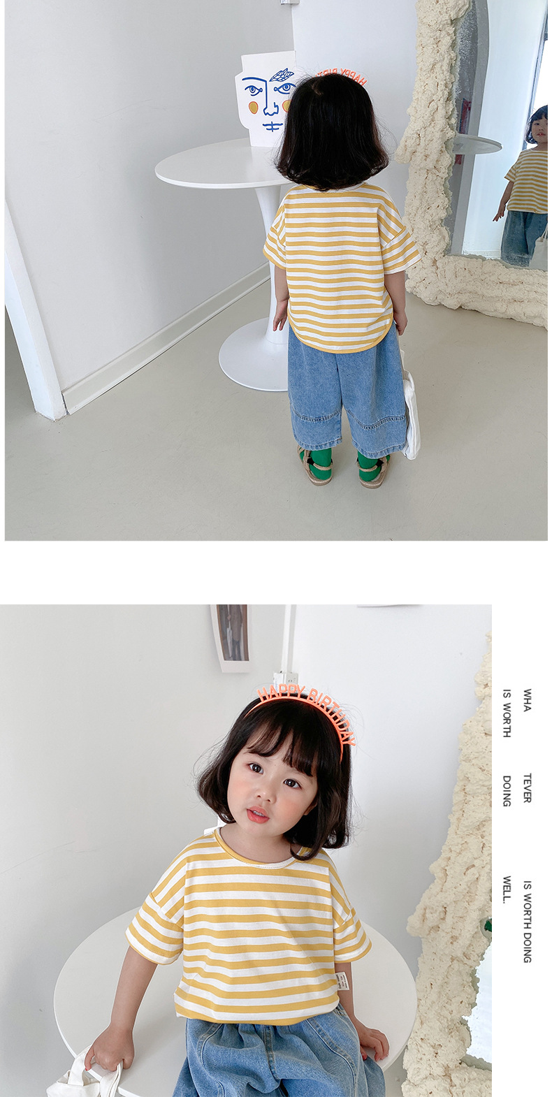 기본 아동 스트라이프 반팔 티셔츠 여아 라운드 넥 스플릿 배트 탑 코튼 한국 아동복 도매스토어 가기