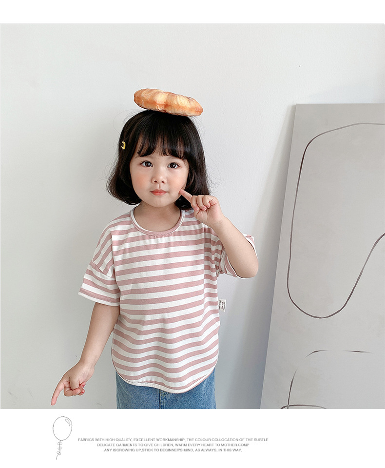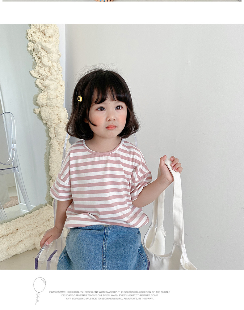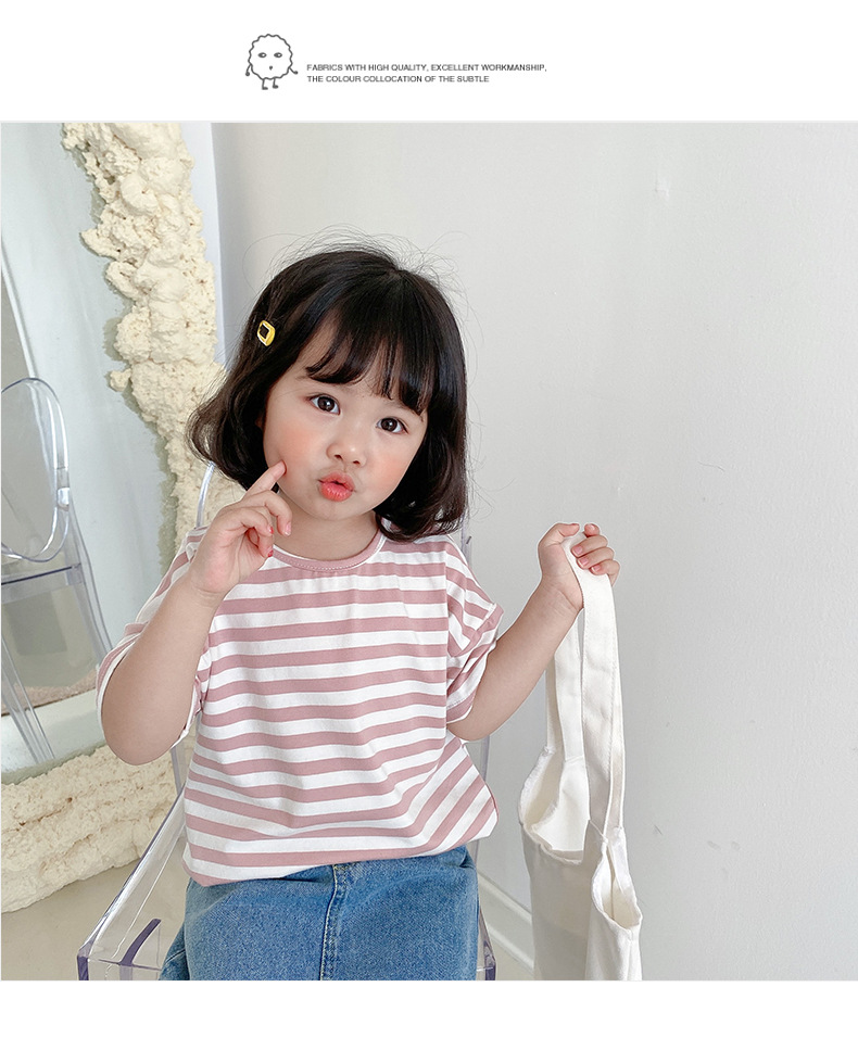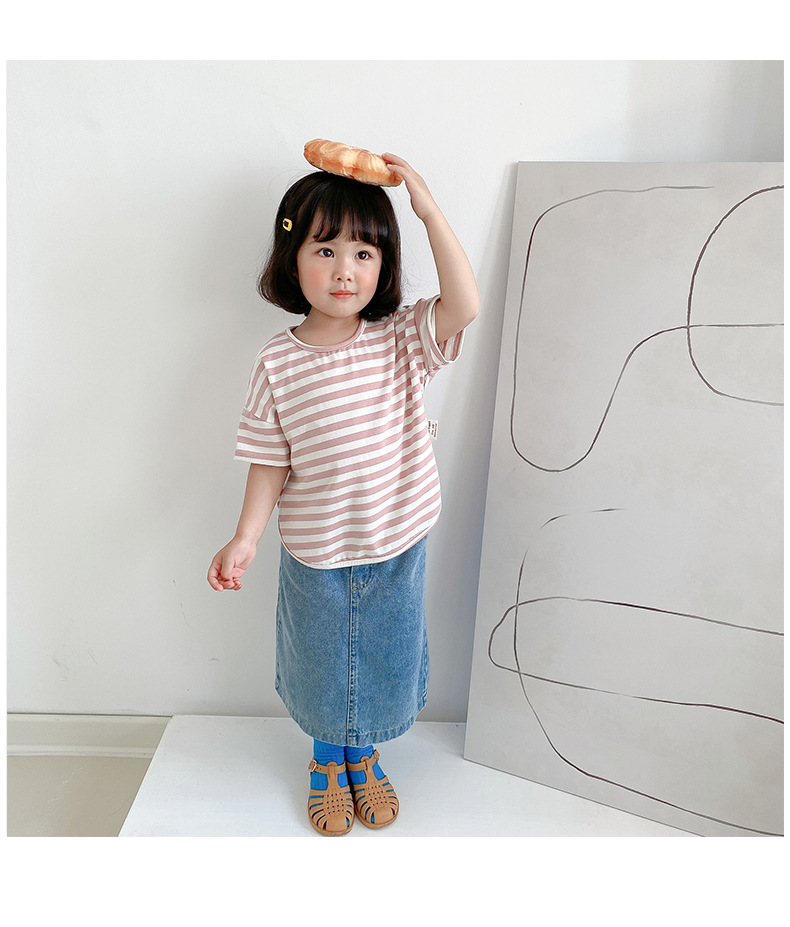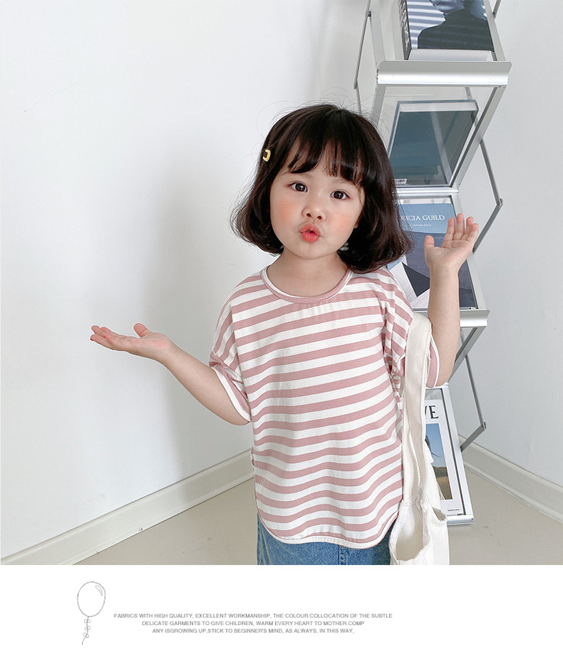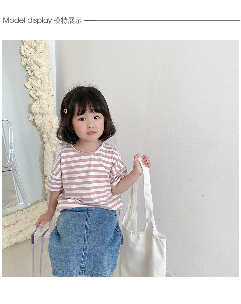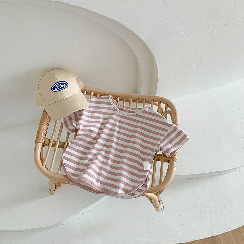 기본 아동 스트라이프 반팔 티셔츠 여아 라운드 넥 스플릿 배트 탑 코튼 한국 아동복 도매