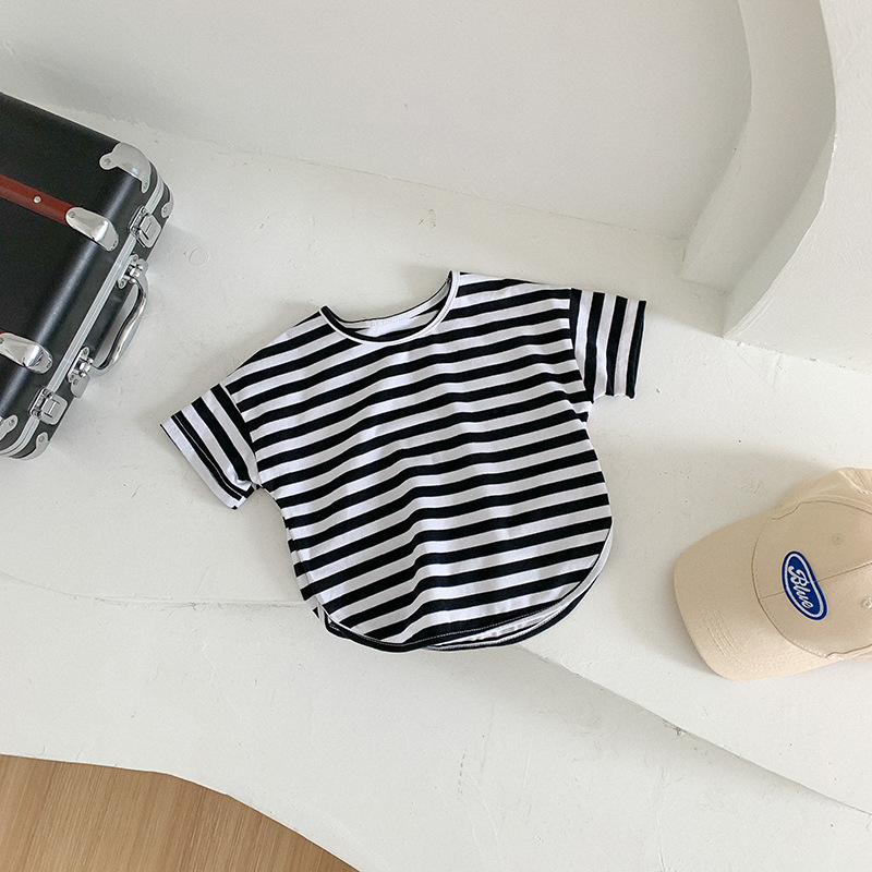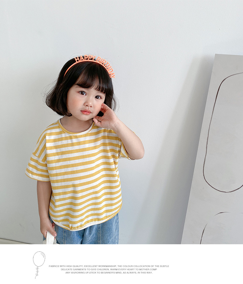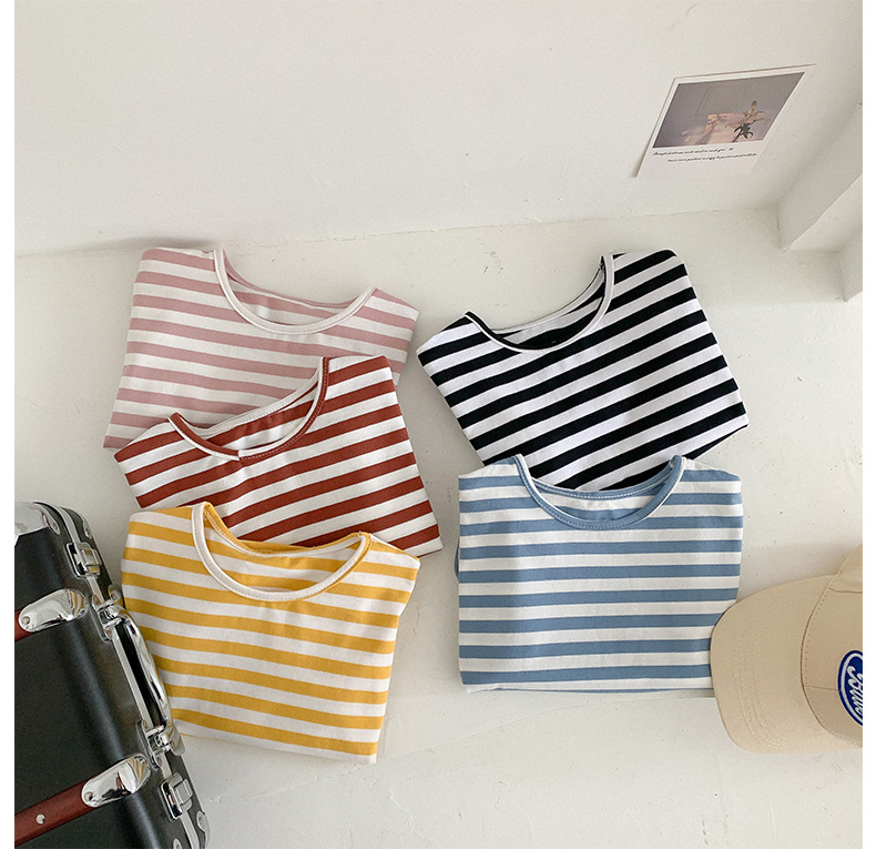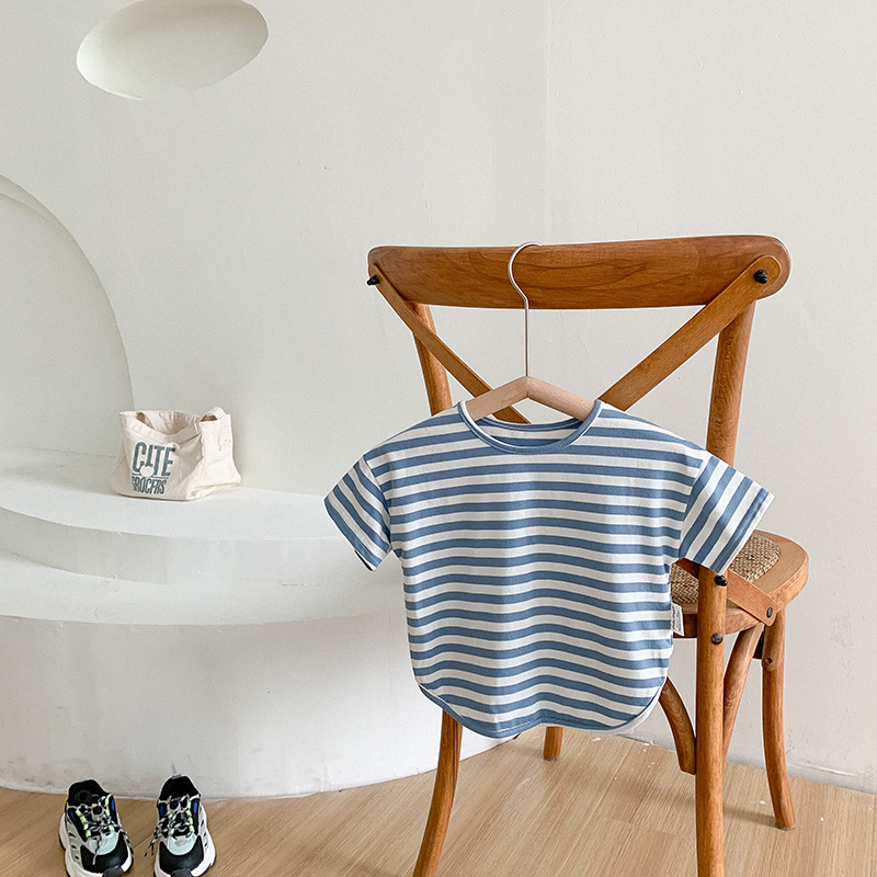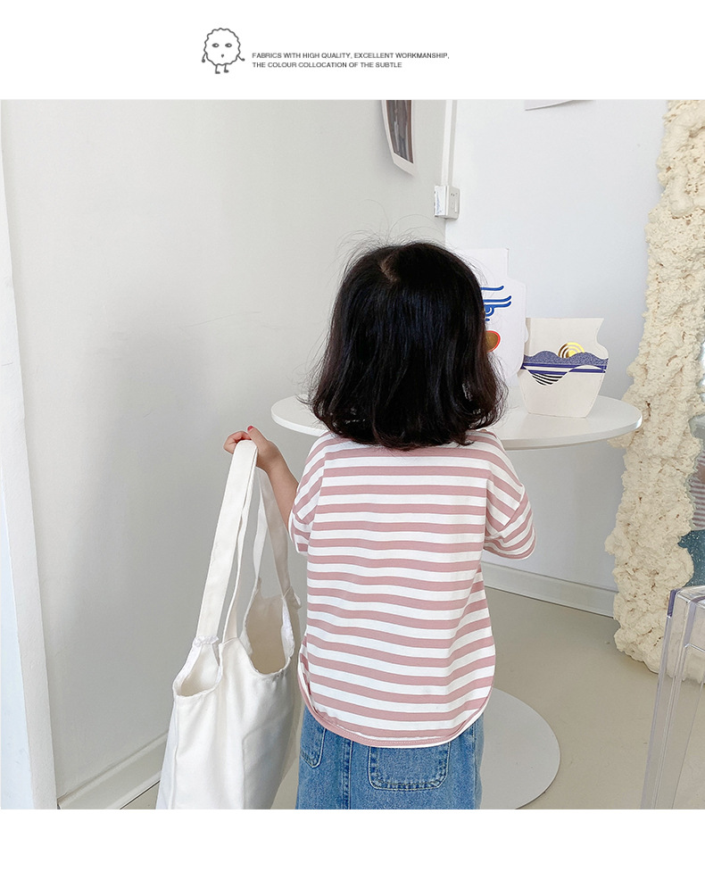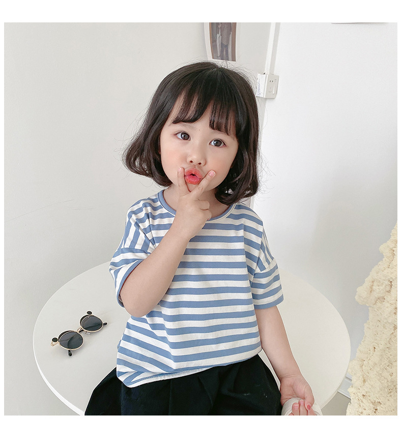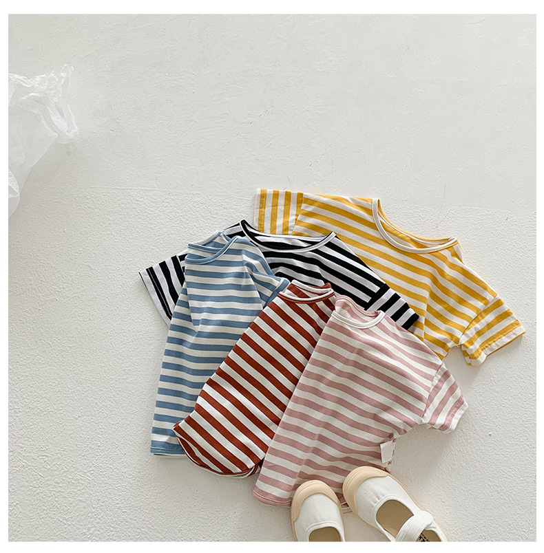 기본 아동 스트라이프 반팔 티셔츠 여아 라운드 넥 스플릿 배트 탑 코튼 한국 아동복 도매