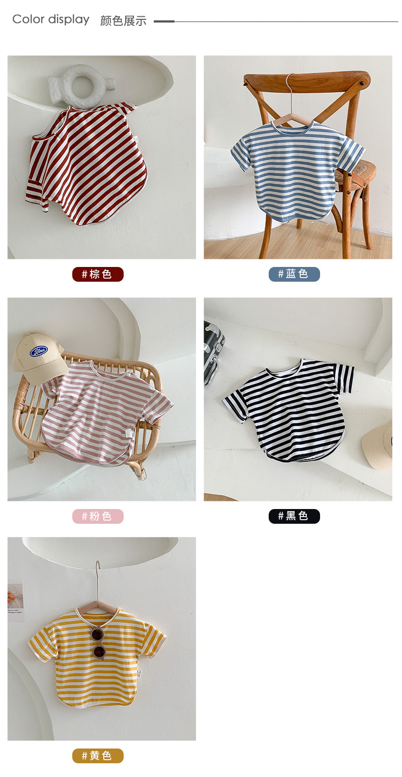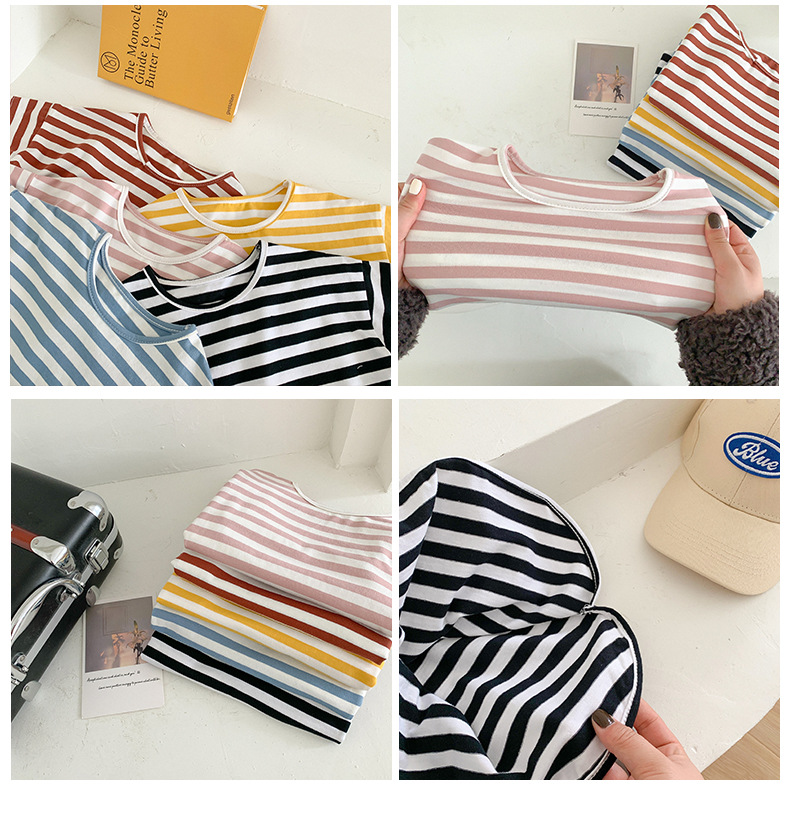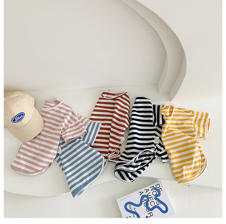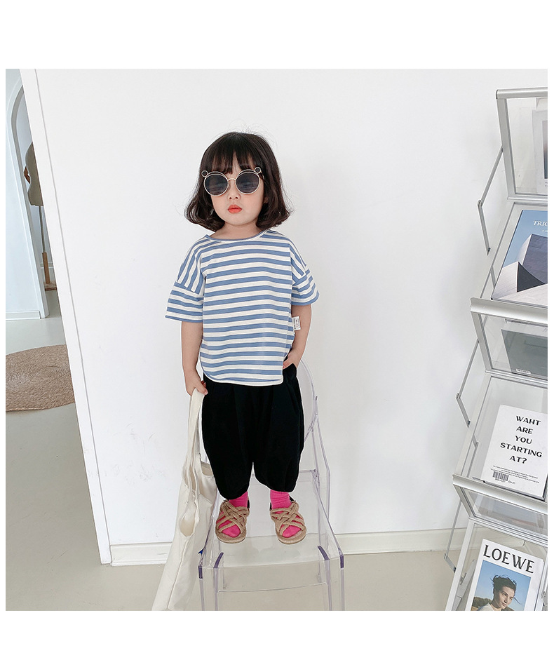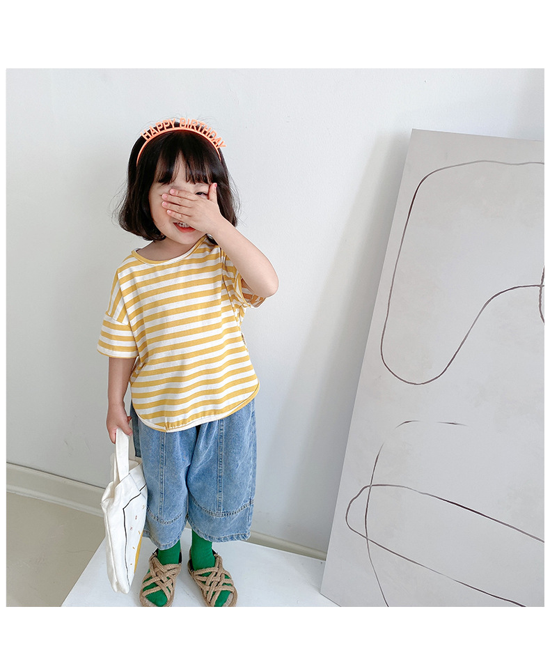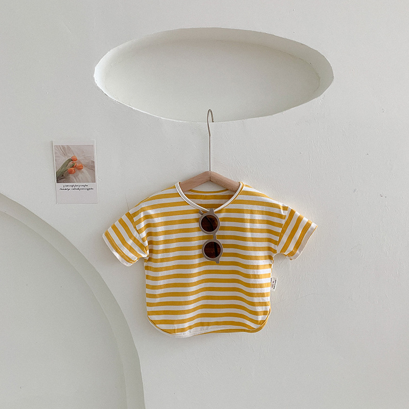 기본 아동 스트라이프 반팔 티셔츠 여아 라운드 넥 스플릿 배트 탑 코튼 한국 아동복 도매