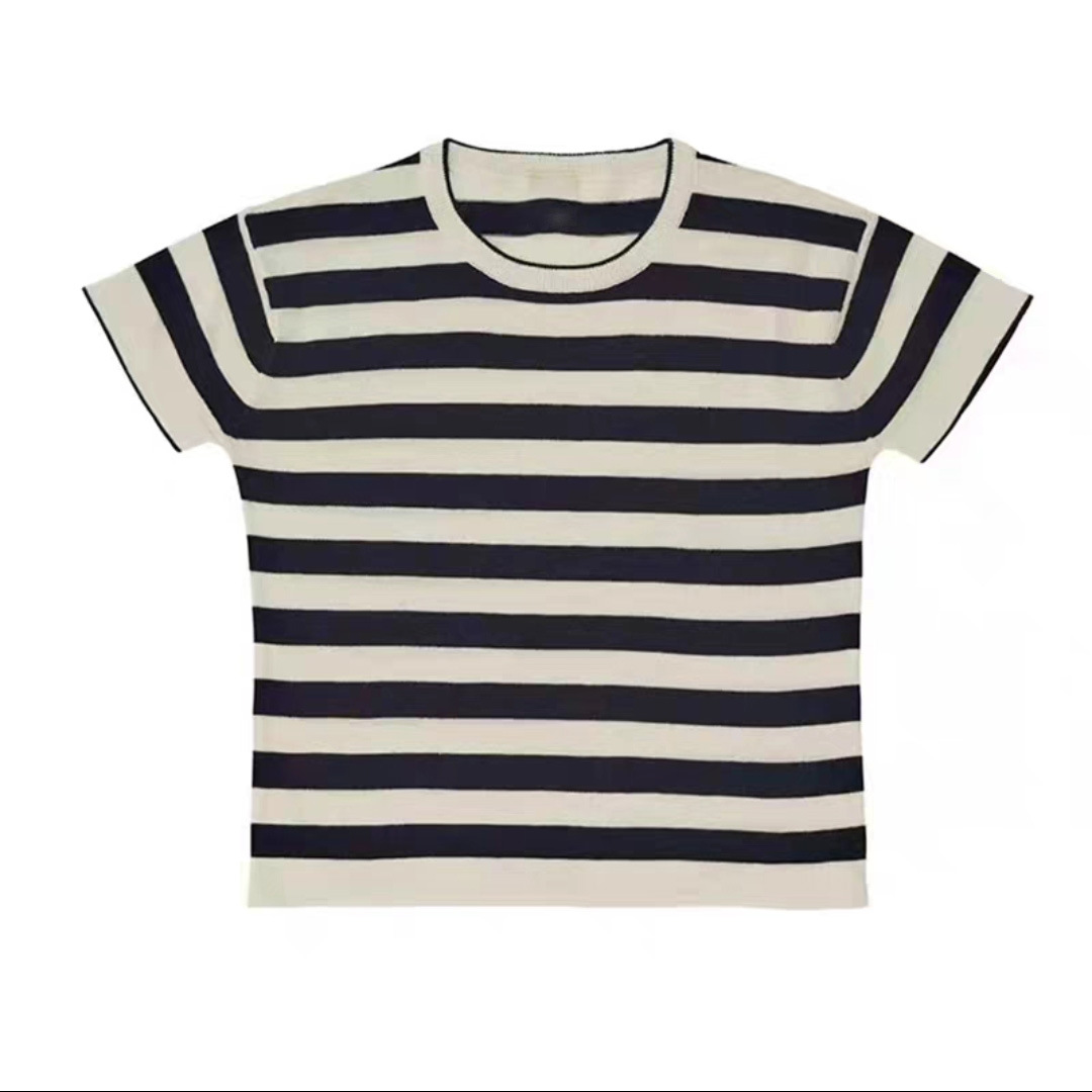 • 네이비 블루 두꺼운 스트라이프 니트 반소매