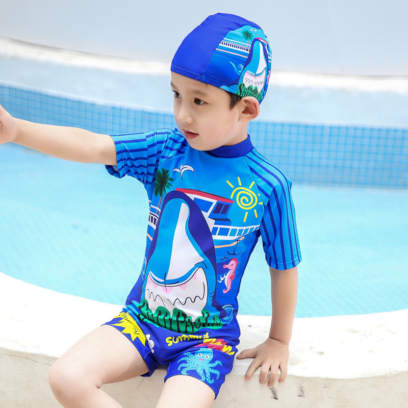 2025년 신형 아동 수영복 남아용 원피스 속건성 중년 남아용 만화 캐릭터 아기 자외선 차단 수영복 (수영모 포함)