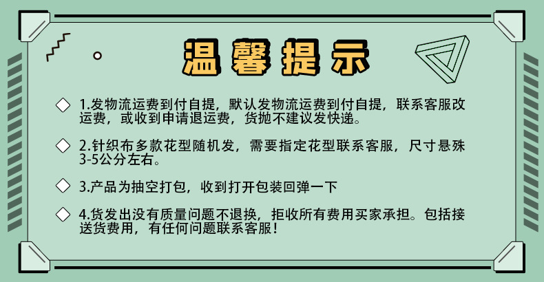 垫子属于抛货,统一发物流运费自提到付,。定做尺寸克重联系客服,需要军绿色备注,无备注默认发格子花布、因发货要抽空,货一旦发出不退换。标准下料成品稍微有点悬殊。联系客服改运费,不改运费不发货undefined