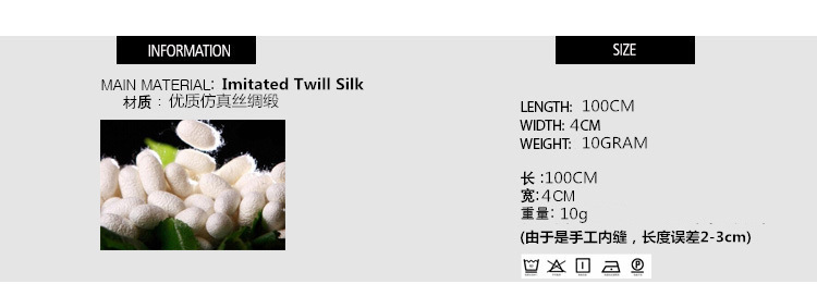 使用优质平纹仿真丝绸缎,手工制作,一条丝巾经过裁剪,手工缝制,手工整烫,包装等精心环节
