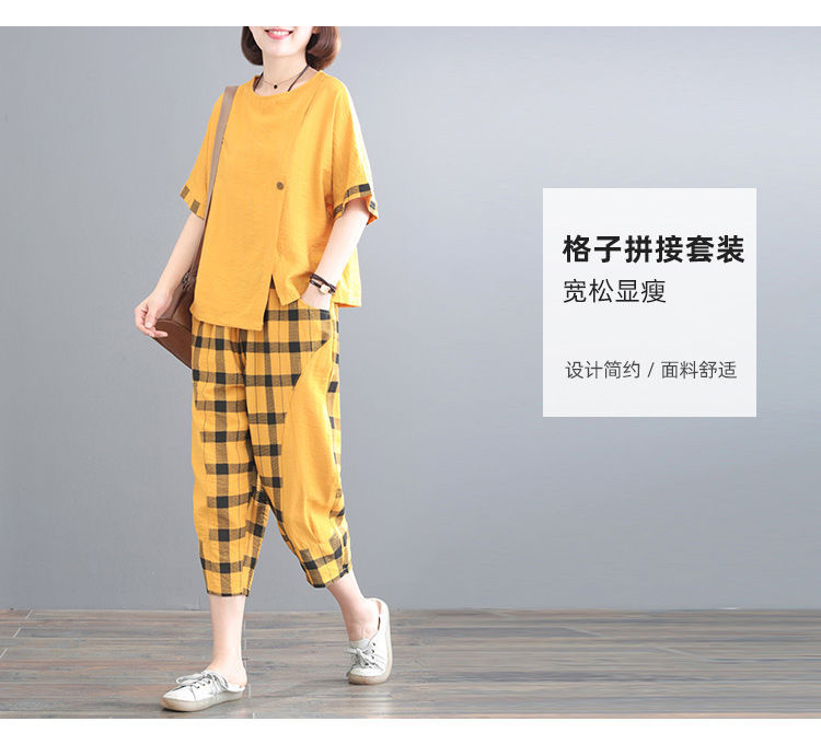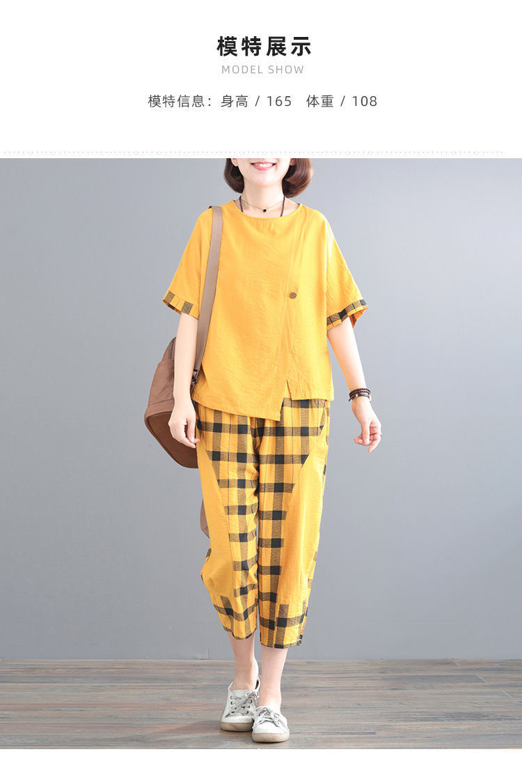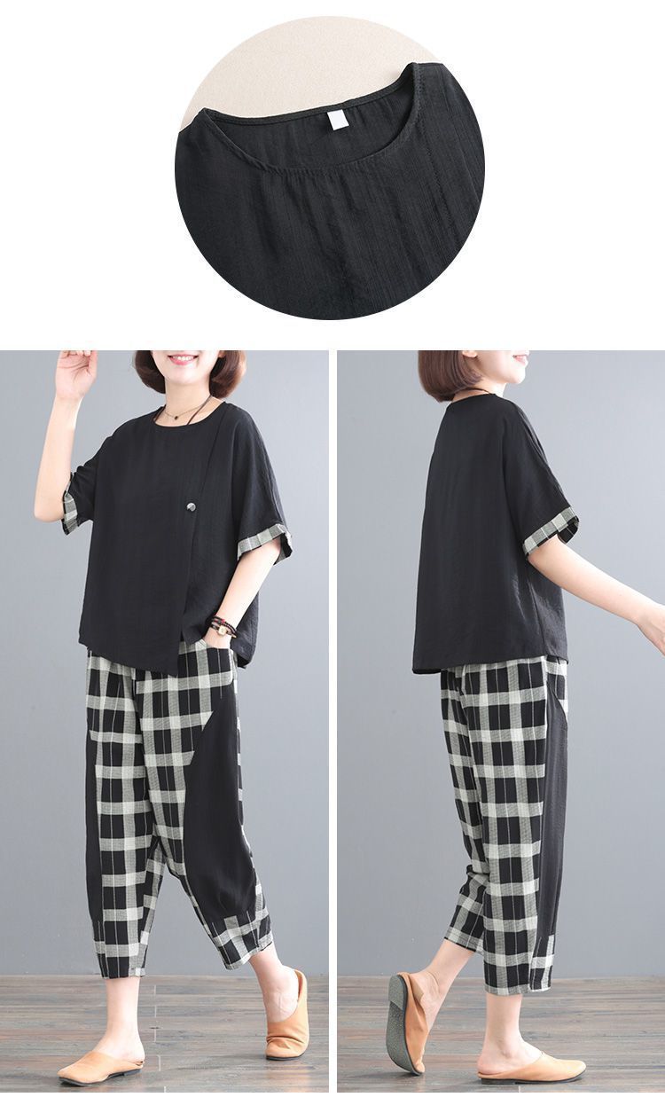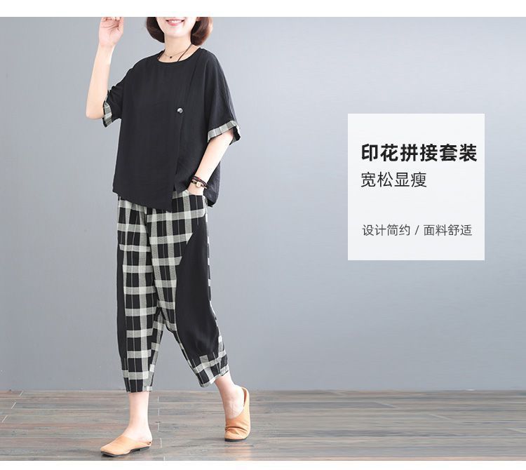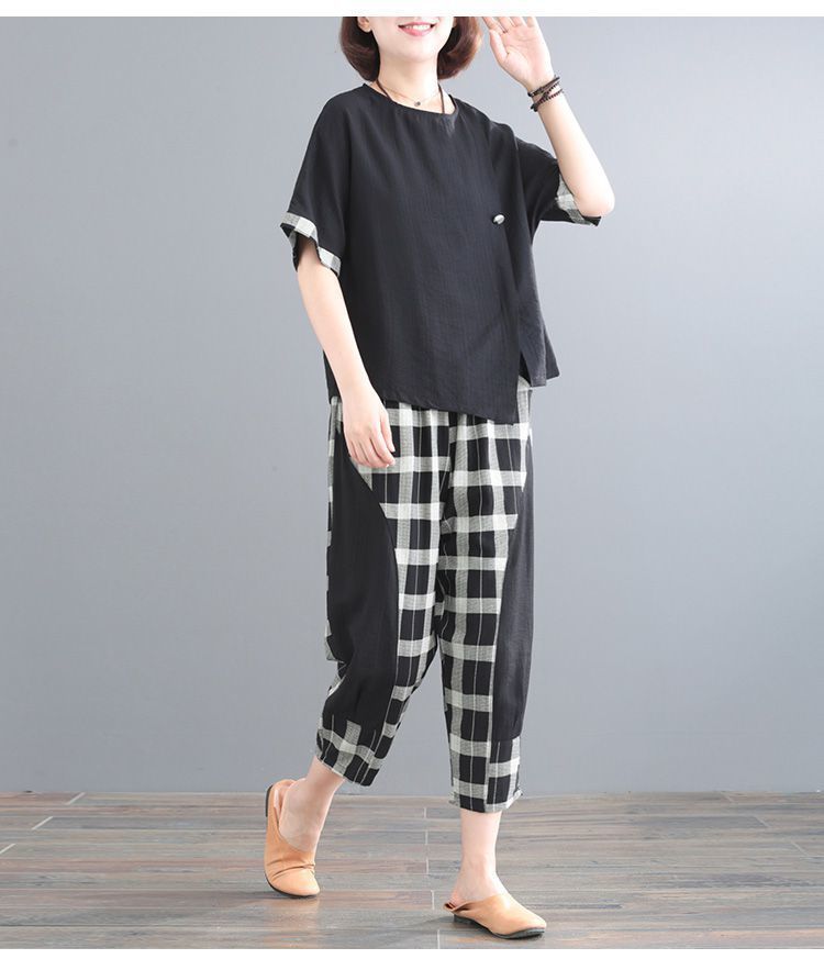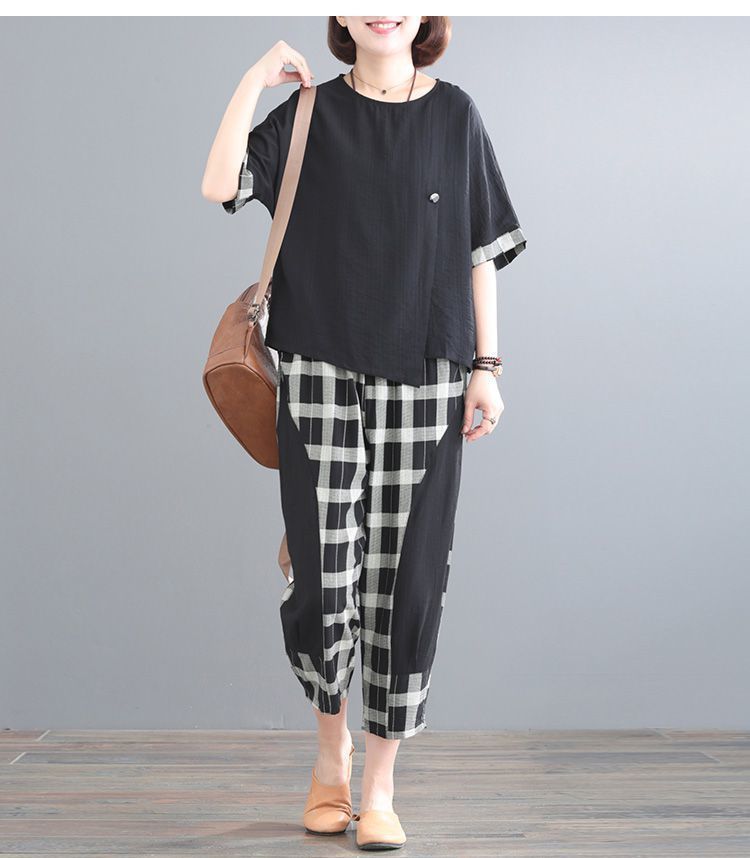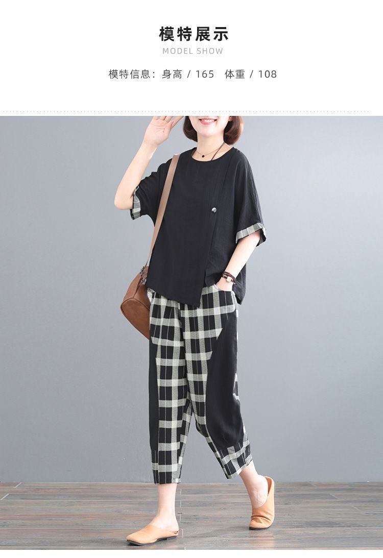 여성 정장 세트 2025 신상 패션 정장 여성복 큰 사이즈 스타일리쉬 체크무늬 패치워크 루즈핏 투피스 세트 여름 9부 팬츠스토어 가기