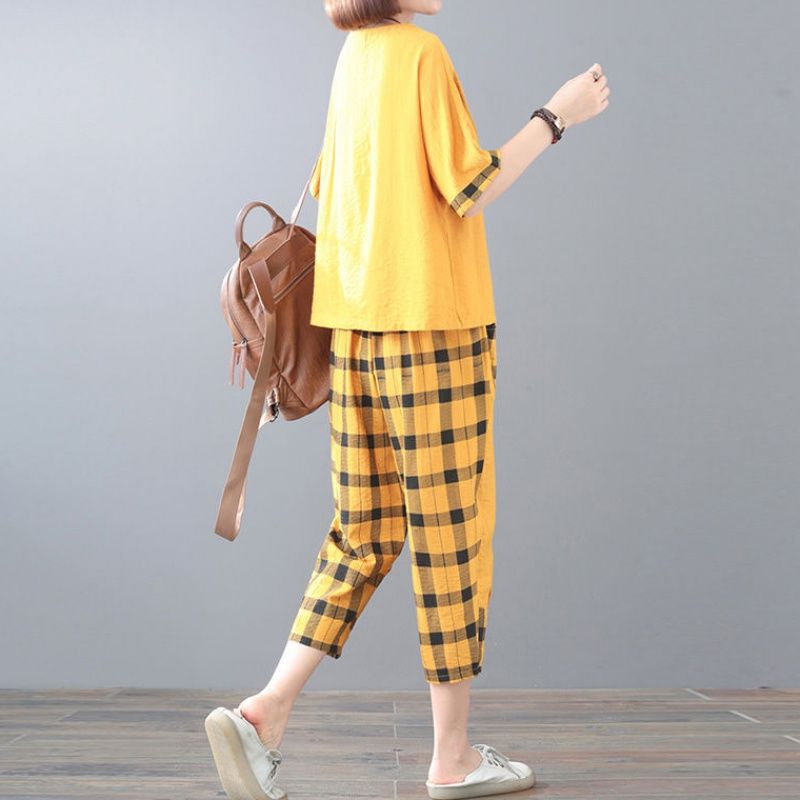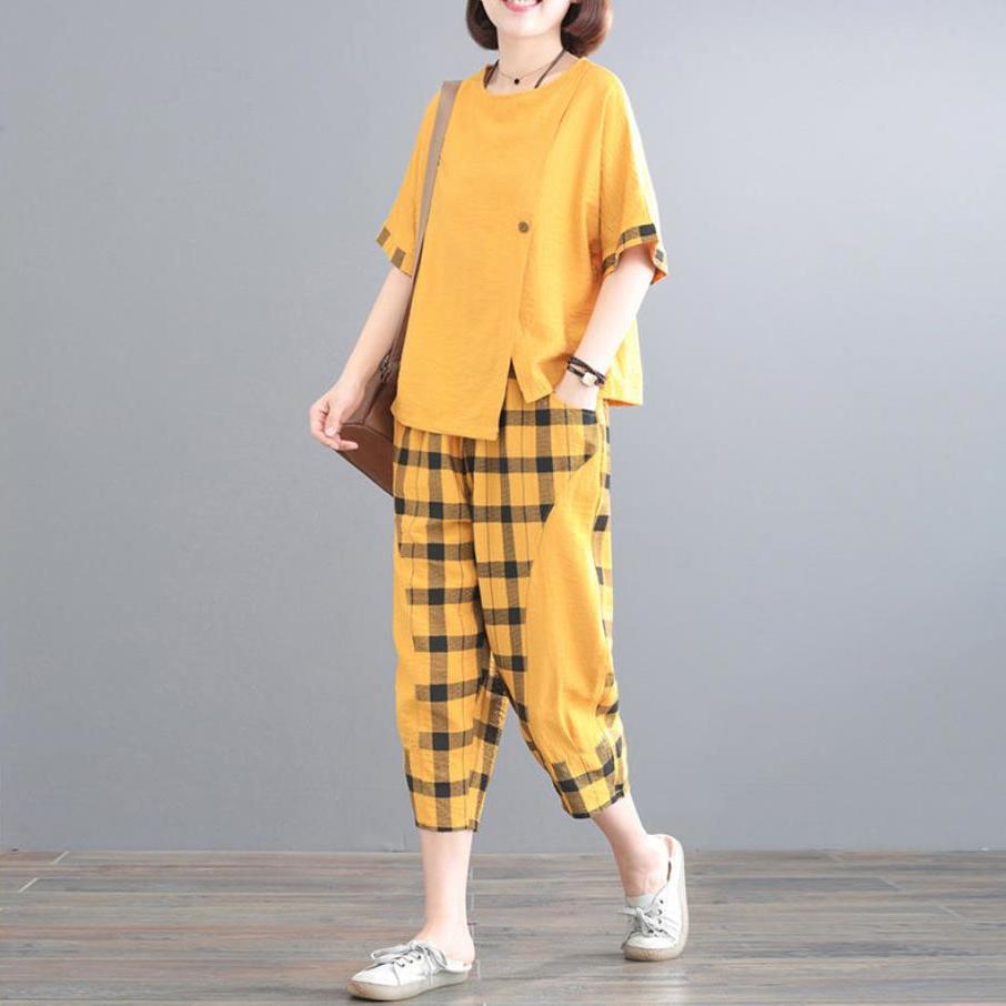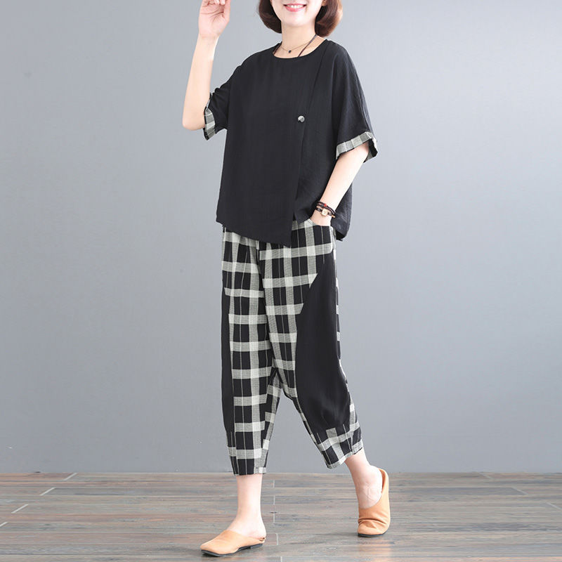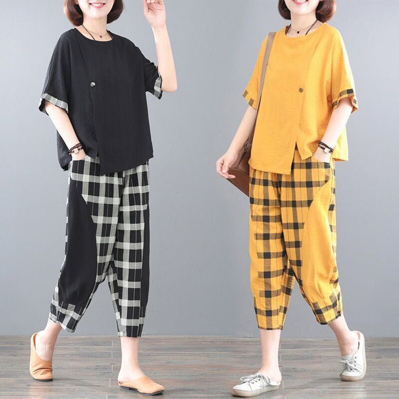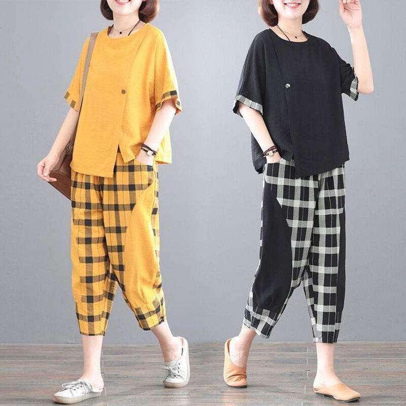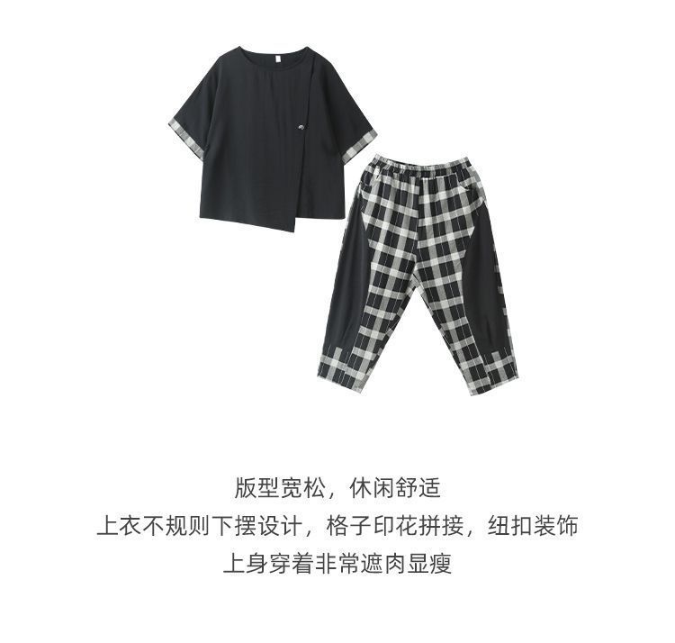 여성 정장 세트 2025 신상 패션 정장 여성복 큰 사이즈 스타일리쉬 체크무늬 패치워크 루즈핏 투피스 세트 여름 9부 팬츠