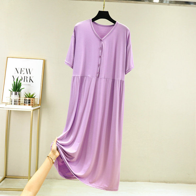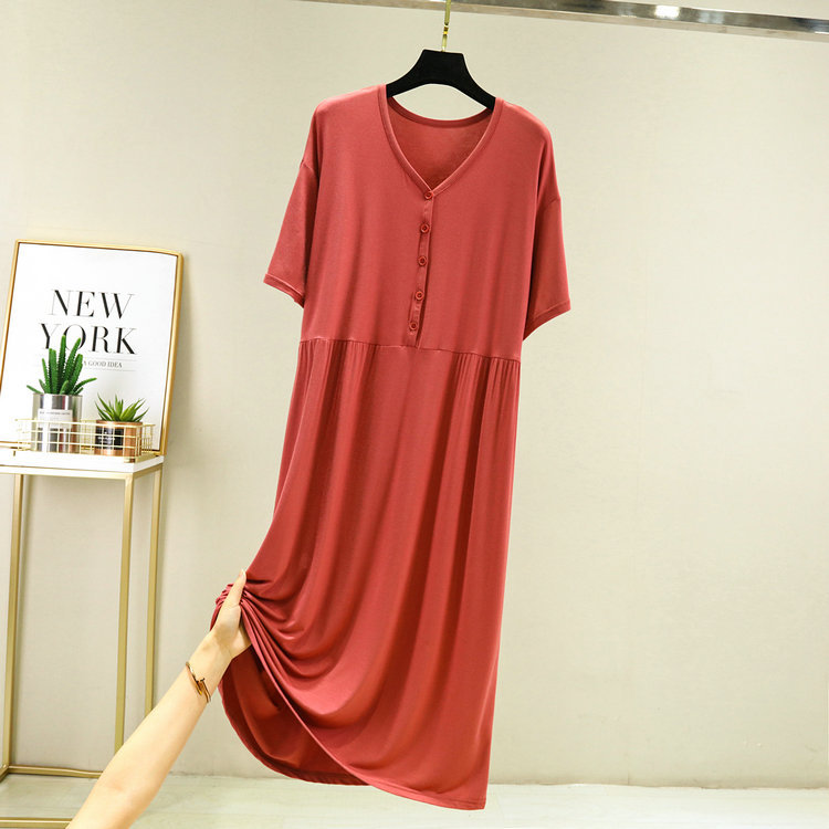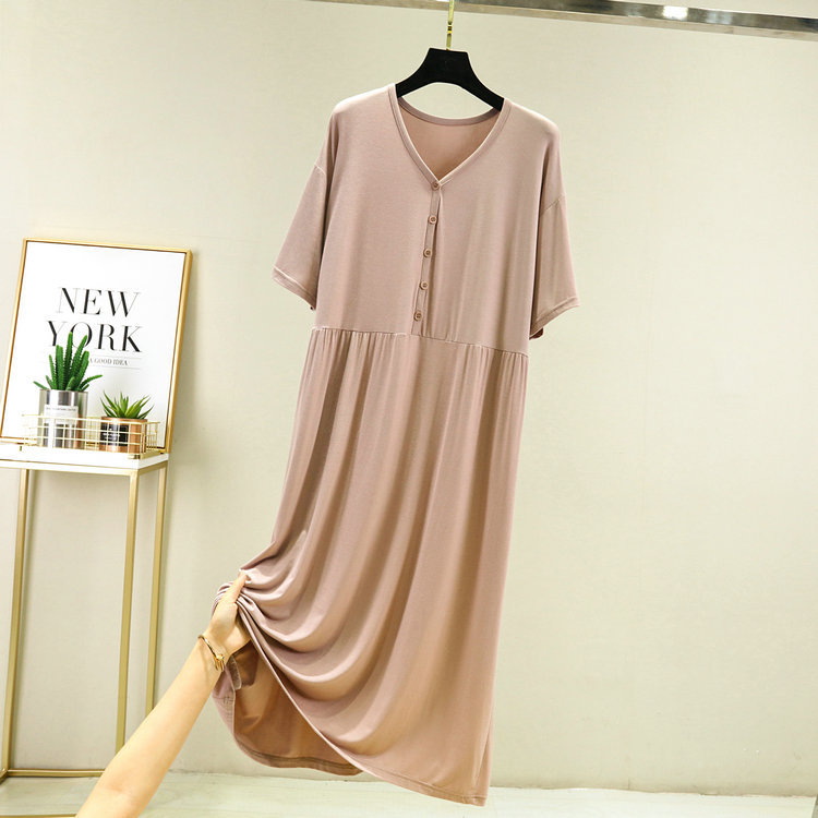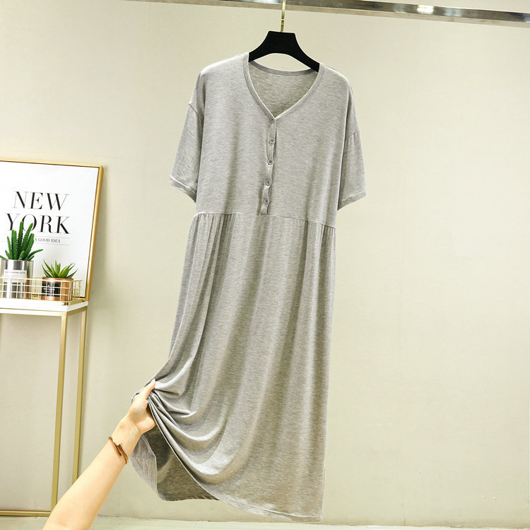 여름 복장 모달 반팔 원피스 여자의 느슨한 대형 스윙 스커트 버튼 V-넥 베이스 스커트 홈 캐주얼 스커트스토어 가기