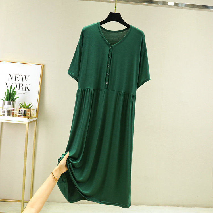 여름 복장 모달 반팔 원피스 여자의 느슨한 대형 스윙 스커트 버튼 V-넥 베이스 스커트 홈 캐주얼 스커트