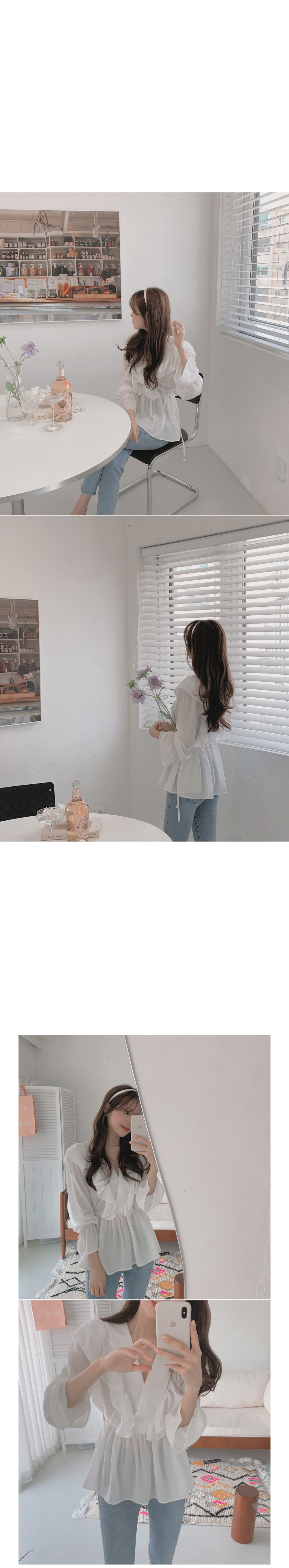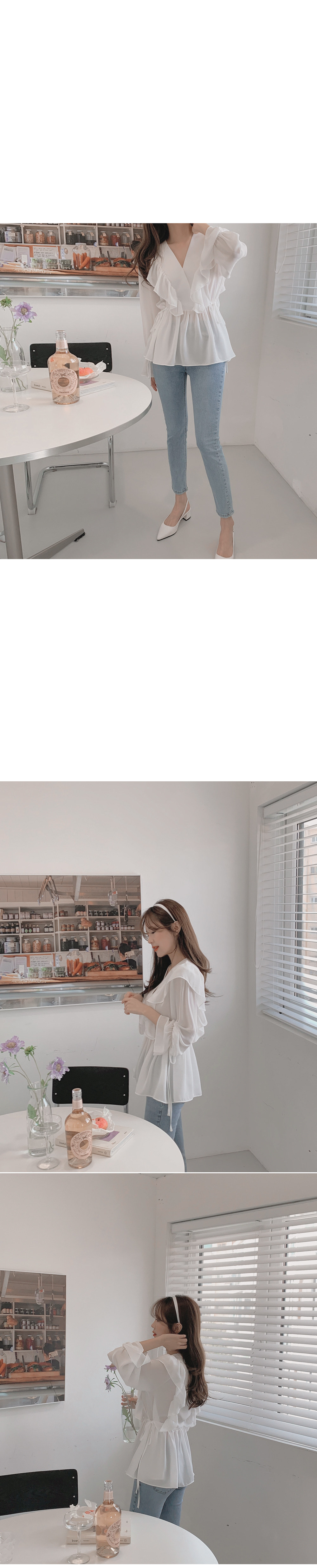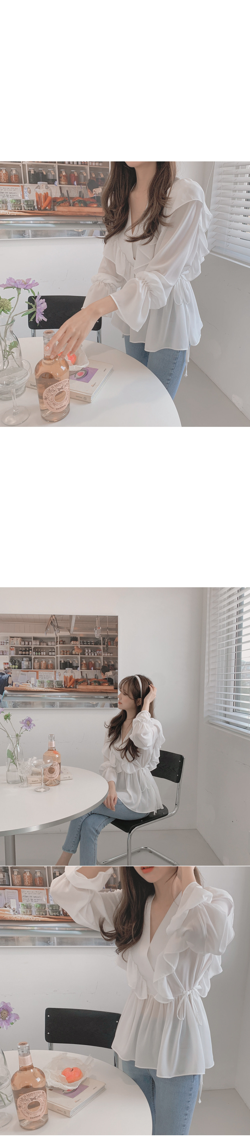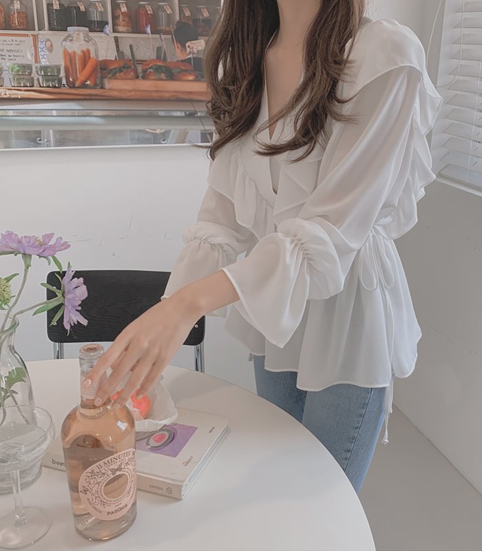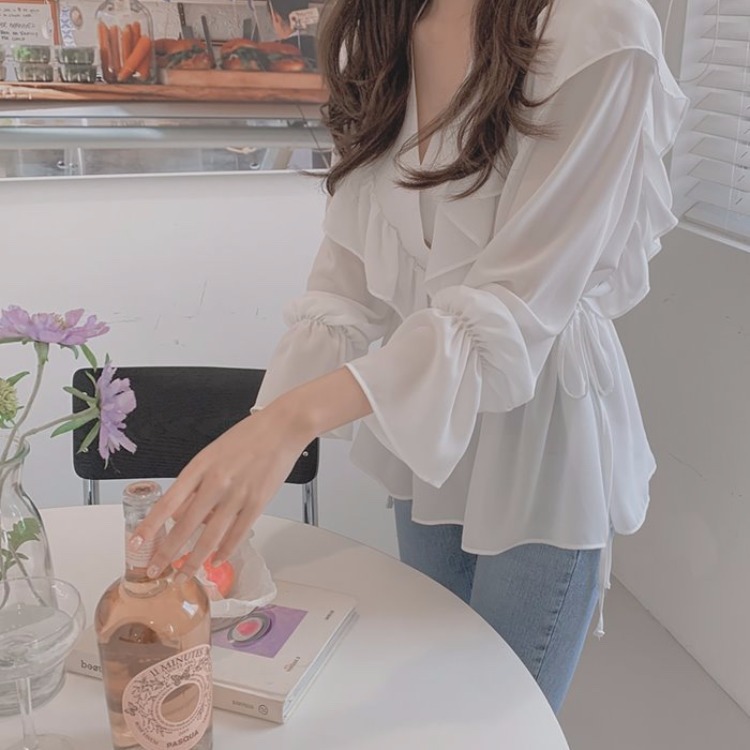 달콤한 러플 브이넥 레이스업 웨이스트 긴팔 셔츠 여성용 봄 우아한 슬림핏 화이트 쉬폰 탑스토어 가기