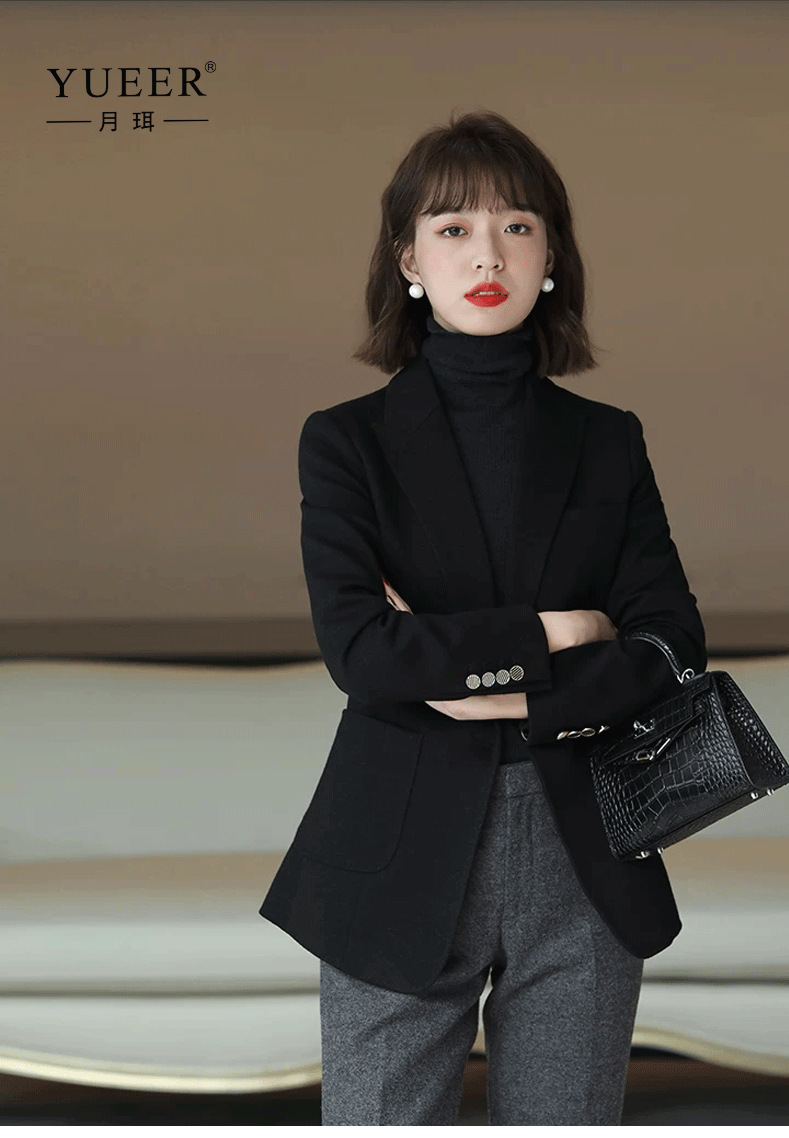 블랙 슬림핏 울 블레이저 여성 패션 우아한 원버튼 오피스 슬림핏 정장 재킷