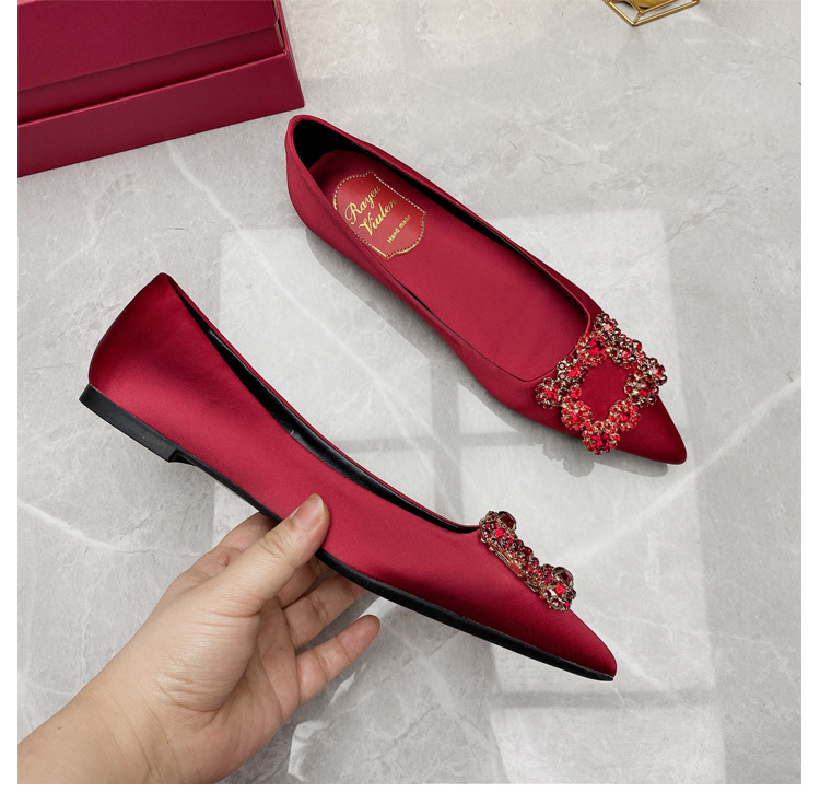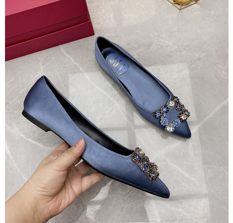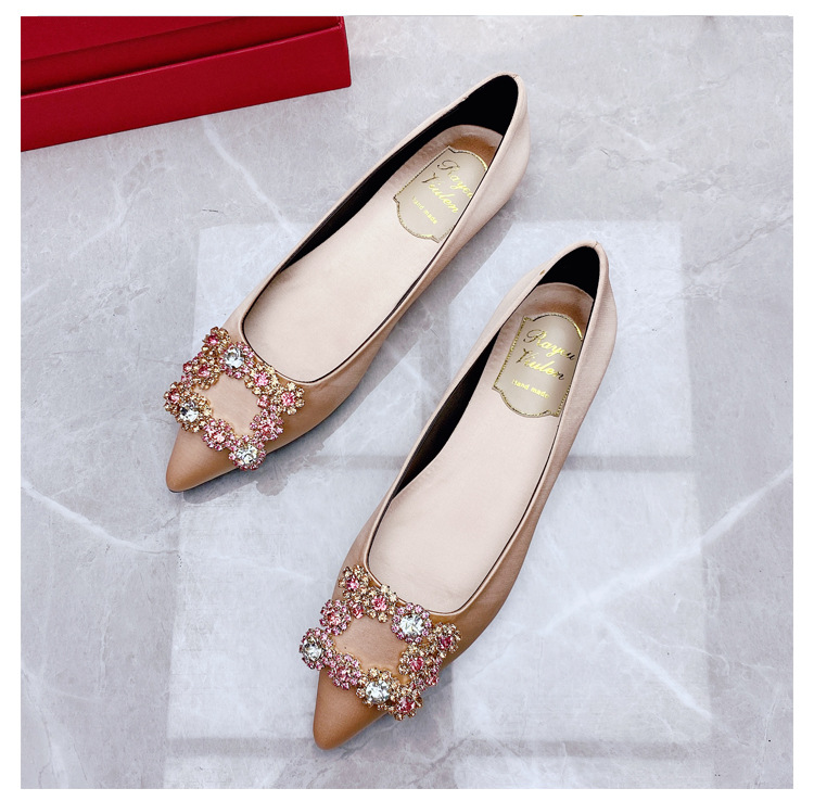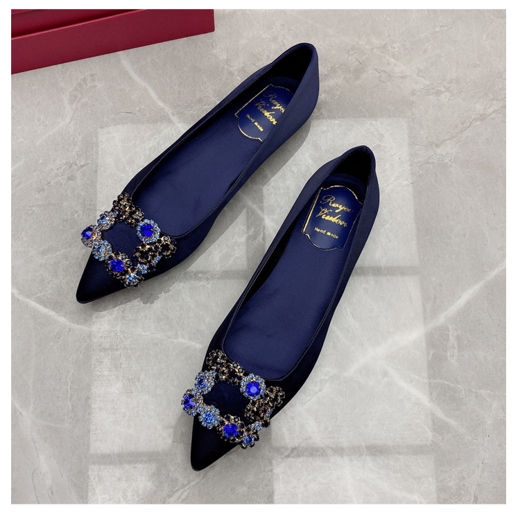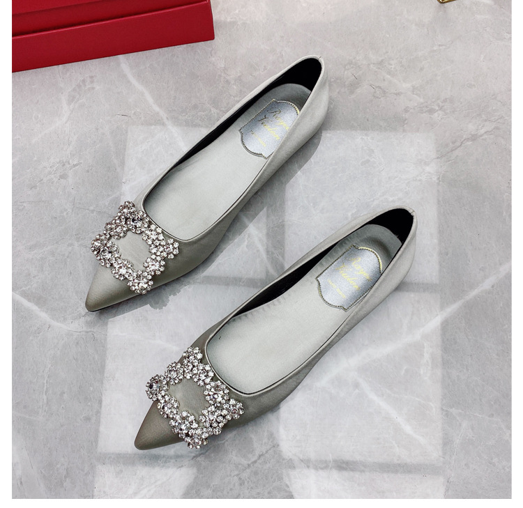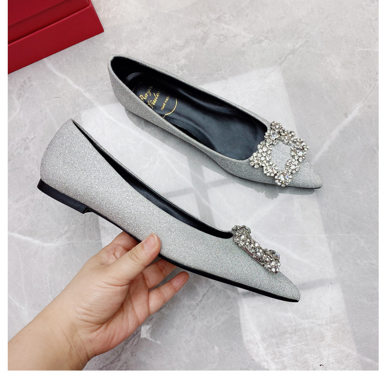 스톤 장식 사각 버클 플랫 슈즈 여성용 2025 봄 신상 실버 색상 얕은 굽 웨딩 슈즈 연회용 뾰족코 단화스토어 가기
