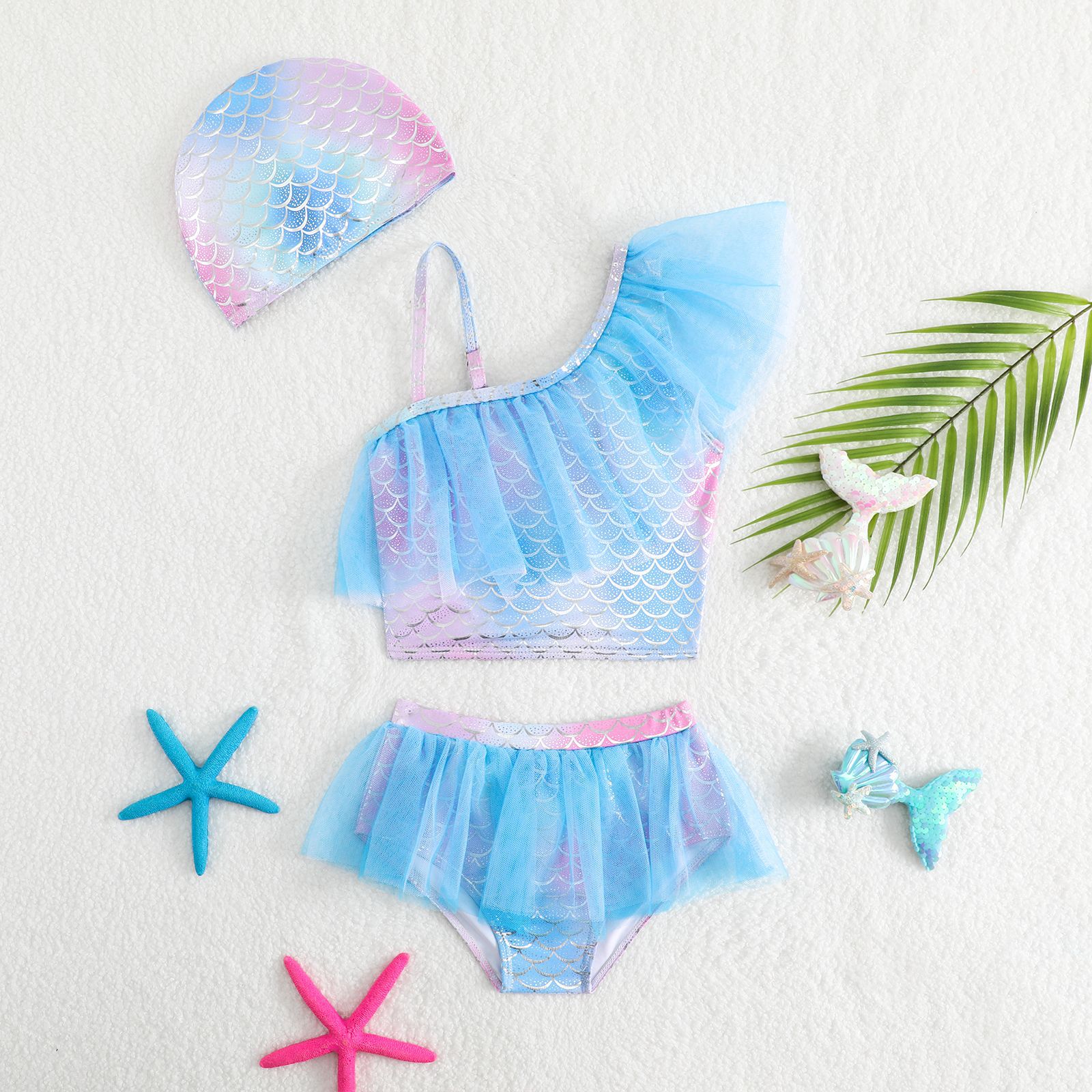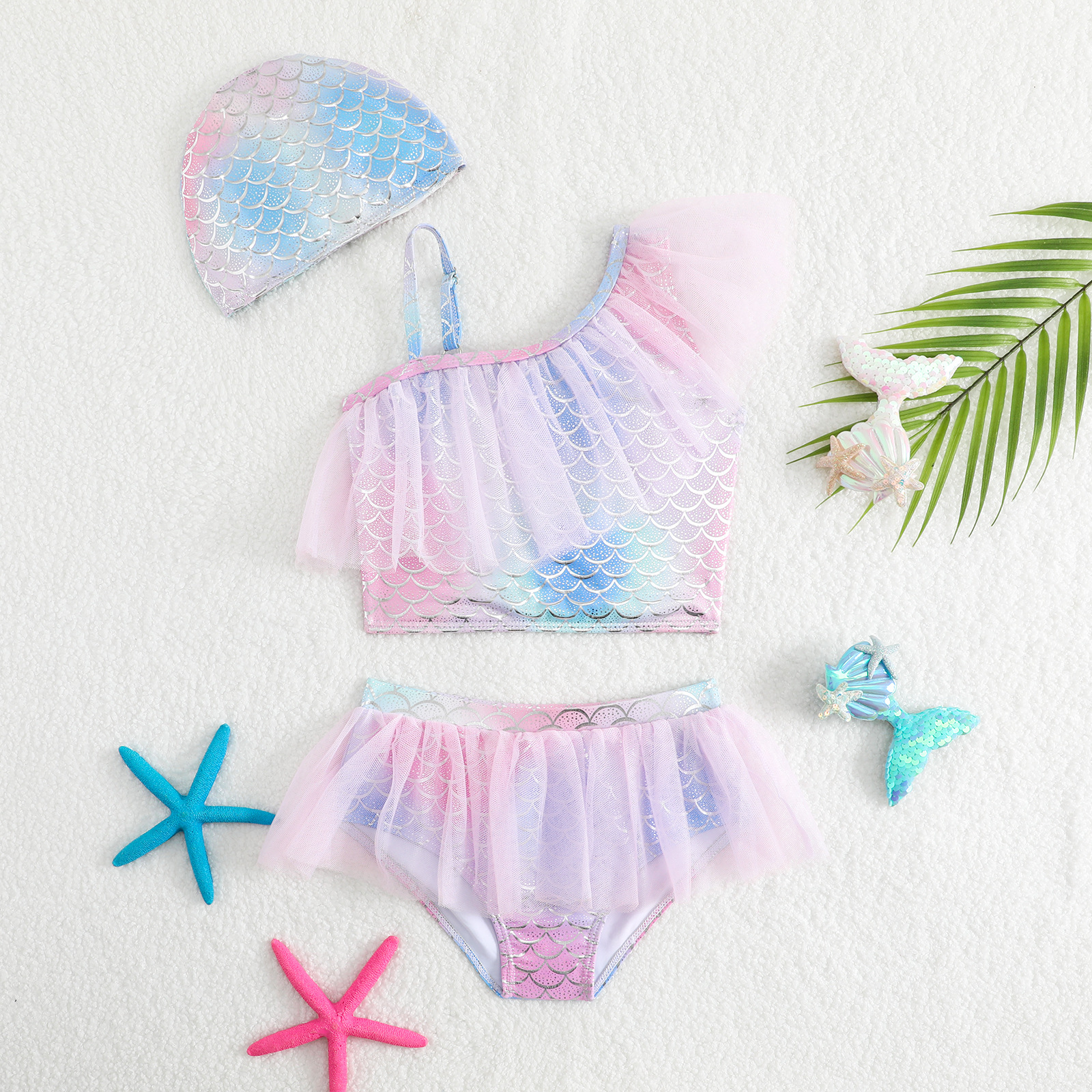 어린이 수영복 맞춤형 국경 간 2025 새로운 스타일 소녀 분할 원피스 인어 물고기 비늘 인쇄 수영복 수영