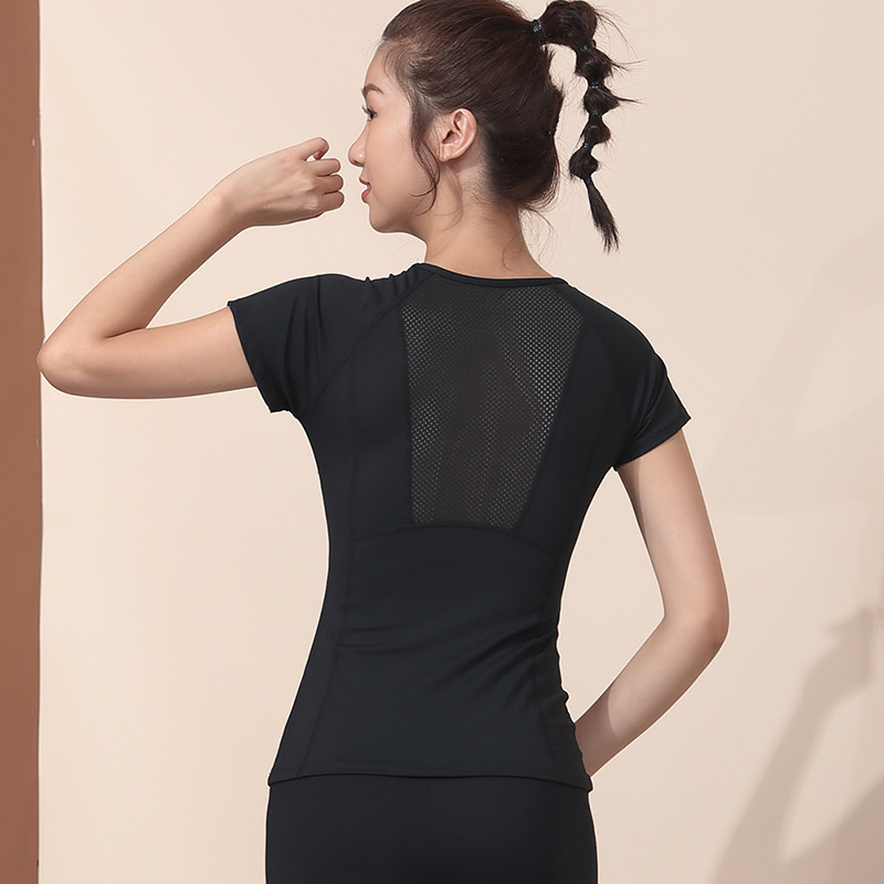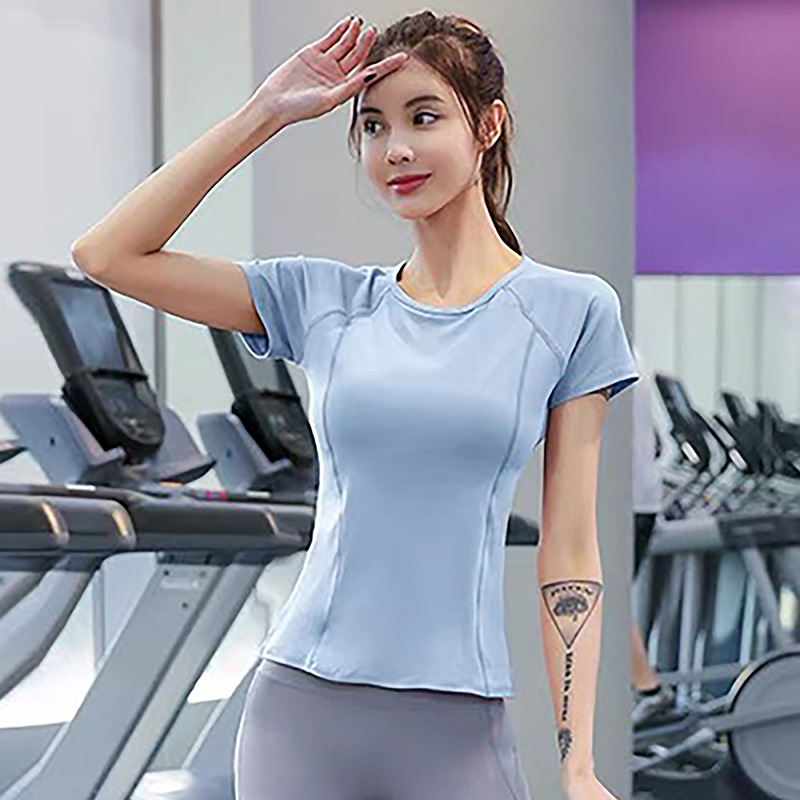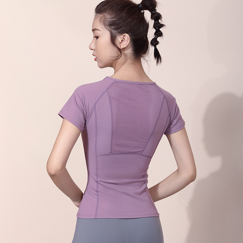 재고 러닝 스포츠 블라우스 탑 여성용 여름 정사이즈 보라색 반팔 하이 엔드 피트니스 요가 의류 가슴 패드스토어 가기