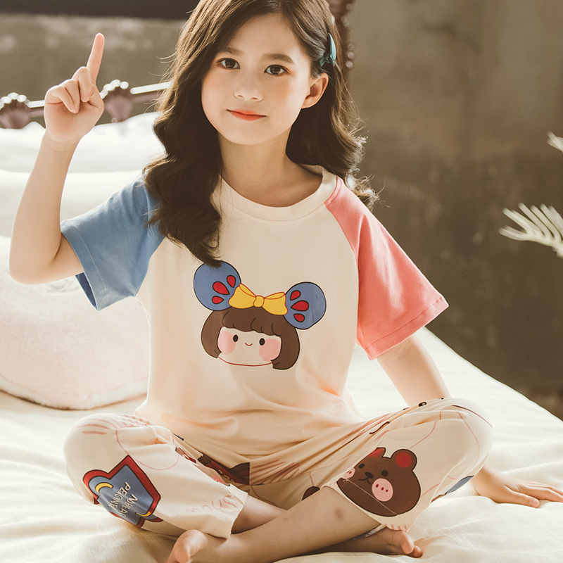 여름 얇은 여아 잠옷 반팔 세트 면 여아 가정복 어린이 유행 잠옷 세트스토어 가기