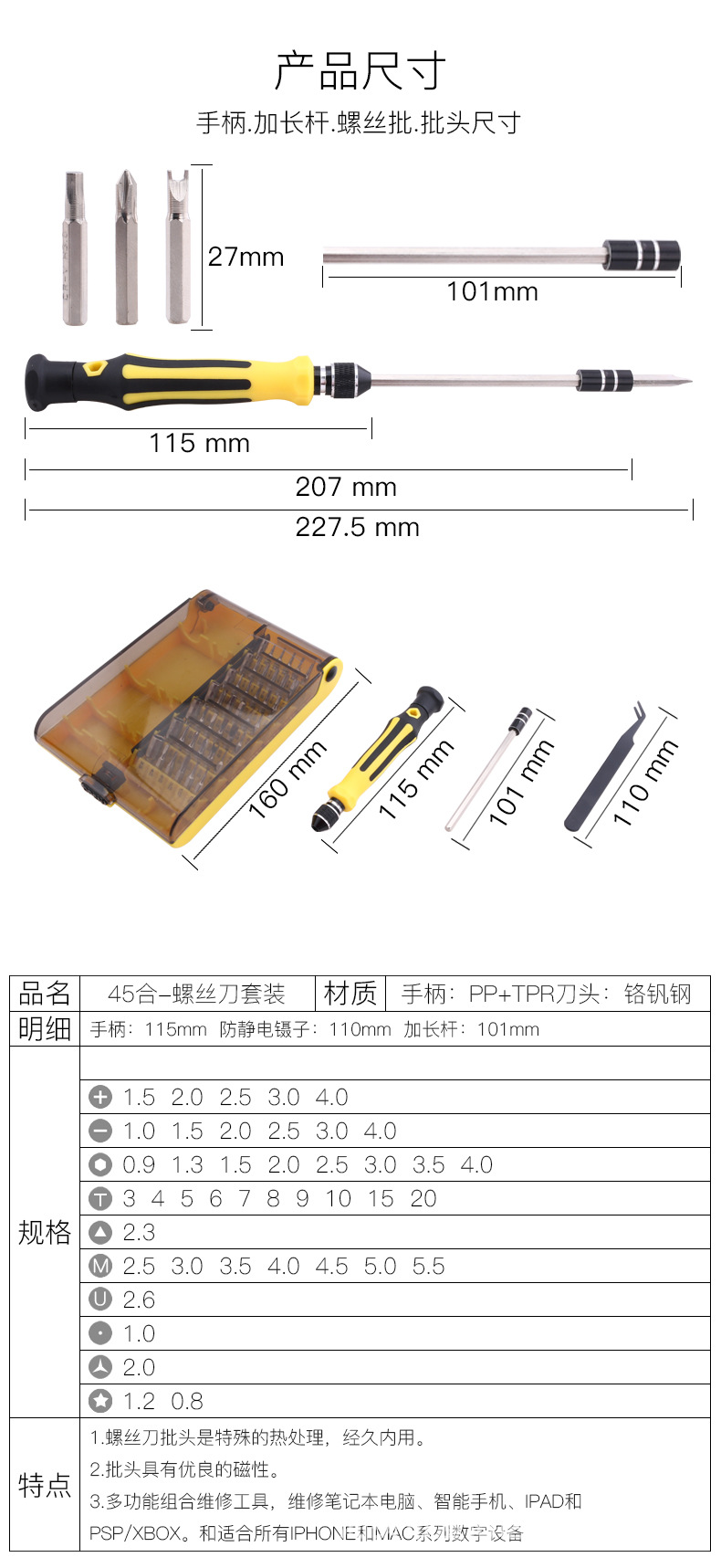 하나의 스크루 드라이버 세트 크로스 한 단어 육각 소켓 애플 안드로이드 휴대 전화 홈 분해 수리 도구 45