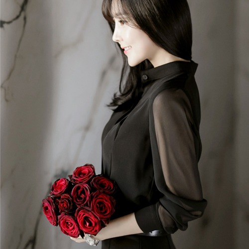 여성용 긴팔 섹시 OL 셔츠 2026 봄 여름 신상 한국 스타일 슬림핏 블랙 스탠드 칼라 셔츠 시폰 시스루스토어 가기