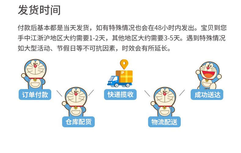 客户到本店铺选购需要的产品款式、数量后付款(如对产品信息有疑问 可联系客服咨询)。付款后,我们将按照客户拍下的清单把货配好(配货过程如遇产品缺货 客服会联系客户, 征询客户换发或者单项产品退款)。货物核对好封箱完毕,按客户选的发货方式发货,正常2个工作日左右发货(如遇节假日,活动等特殊情况将延迟几个工作日发货 客服会联系客户说明)。发出货物后,会在旺旺留言,告知客户发货单号。客户收到货后,请及时核对清单和货物。