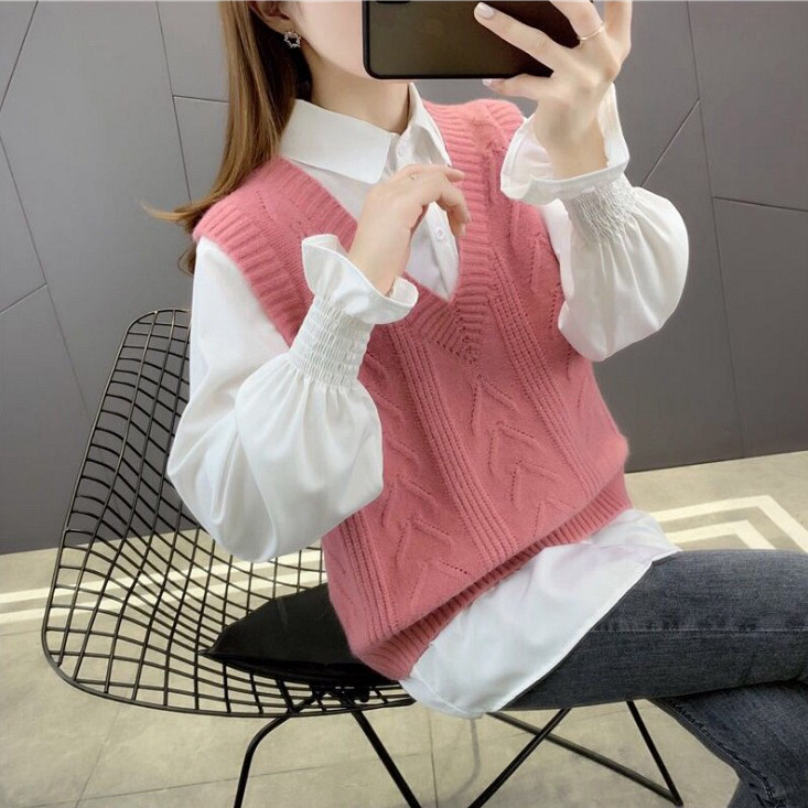 스웨터 조끼 니트 여성 상의 신상 봄 가을 한국 스타일 아우터 조끼 루즈핏 다용도 브이넥 풀오버 조끼