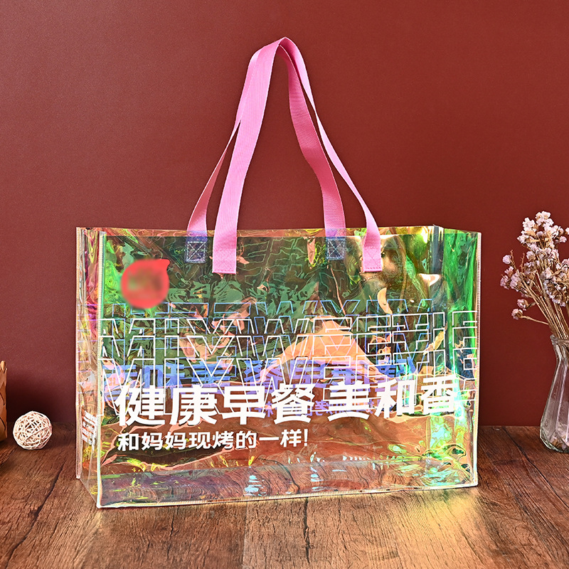 레이저 토트 백 주문 인쇄 로고 대용량 PVC 투명 플라스틱 쇼핑백 다채로운 레이저 백 여성스토어 가기