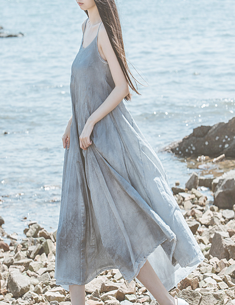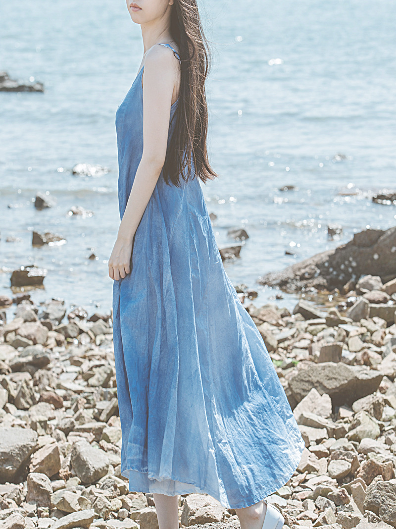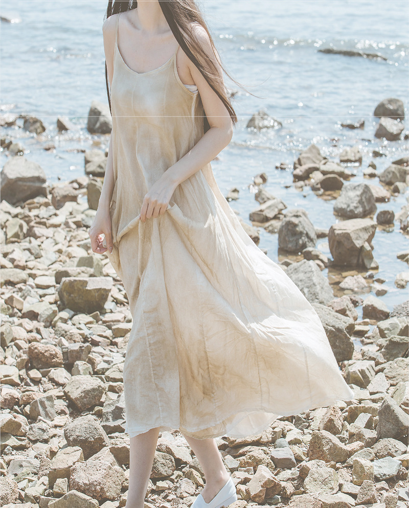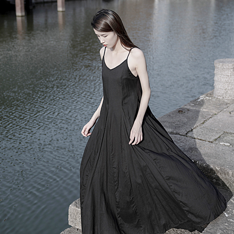 24 여름 다크 스타일 홈 메이드 긴 스테이플 코튼 대형 스윙 더블 레이어 윌로우 리프 스티칭 슬립 스커트 원피스 2 색스토어 가기