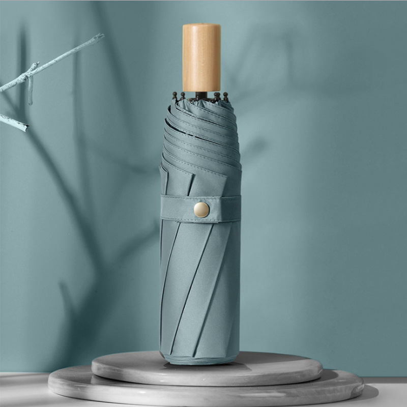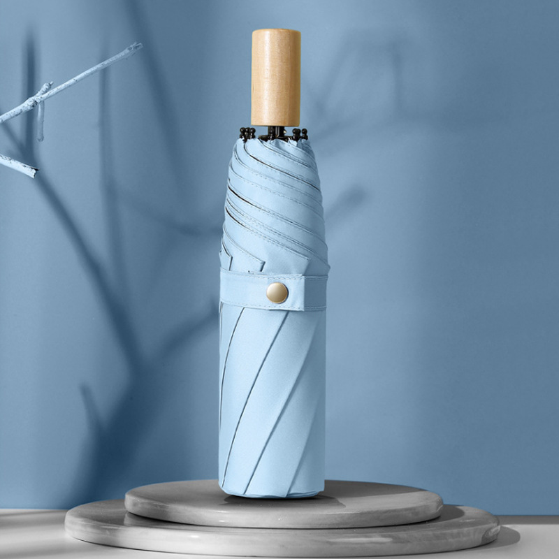 • 두꺼운 검은 고무 선 스크린 나무 손잡이 접는 우산-스카이 블루