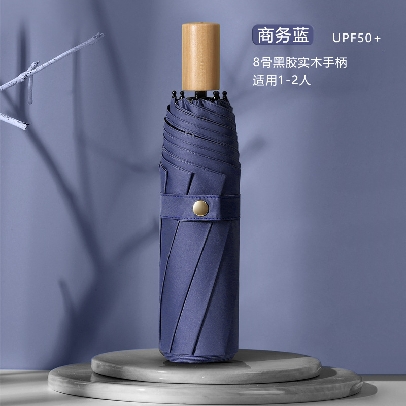 • 두꺼운 검은 고무 선 스크린 나무 손잡이 접는 우산-네이비