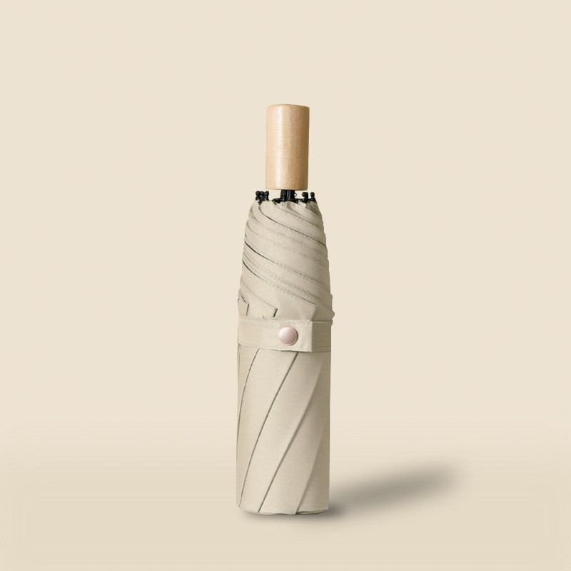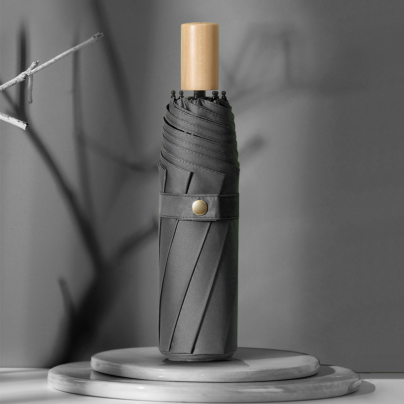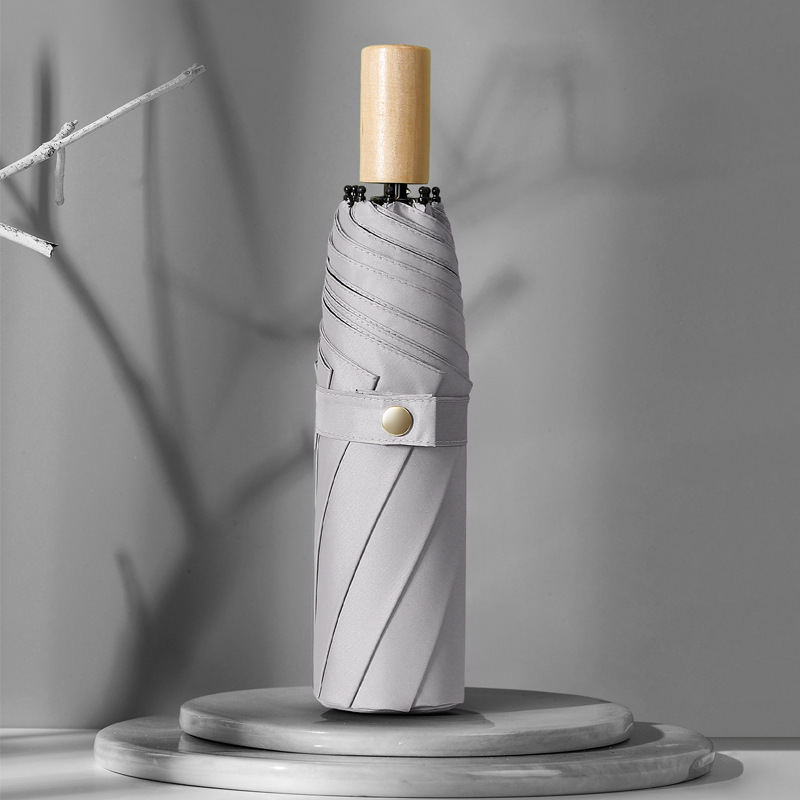 • 두꺼운 검은 고무 선 스크린 나무 손잡이 접는 우산-라이트 그레이