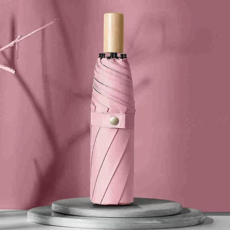 • 두꺼운 검은 고무 선 스크린 나무 손잡이 접는 우산-체리 가루