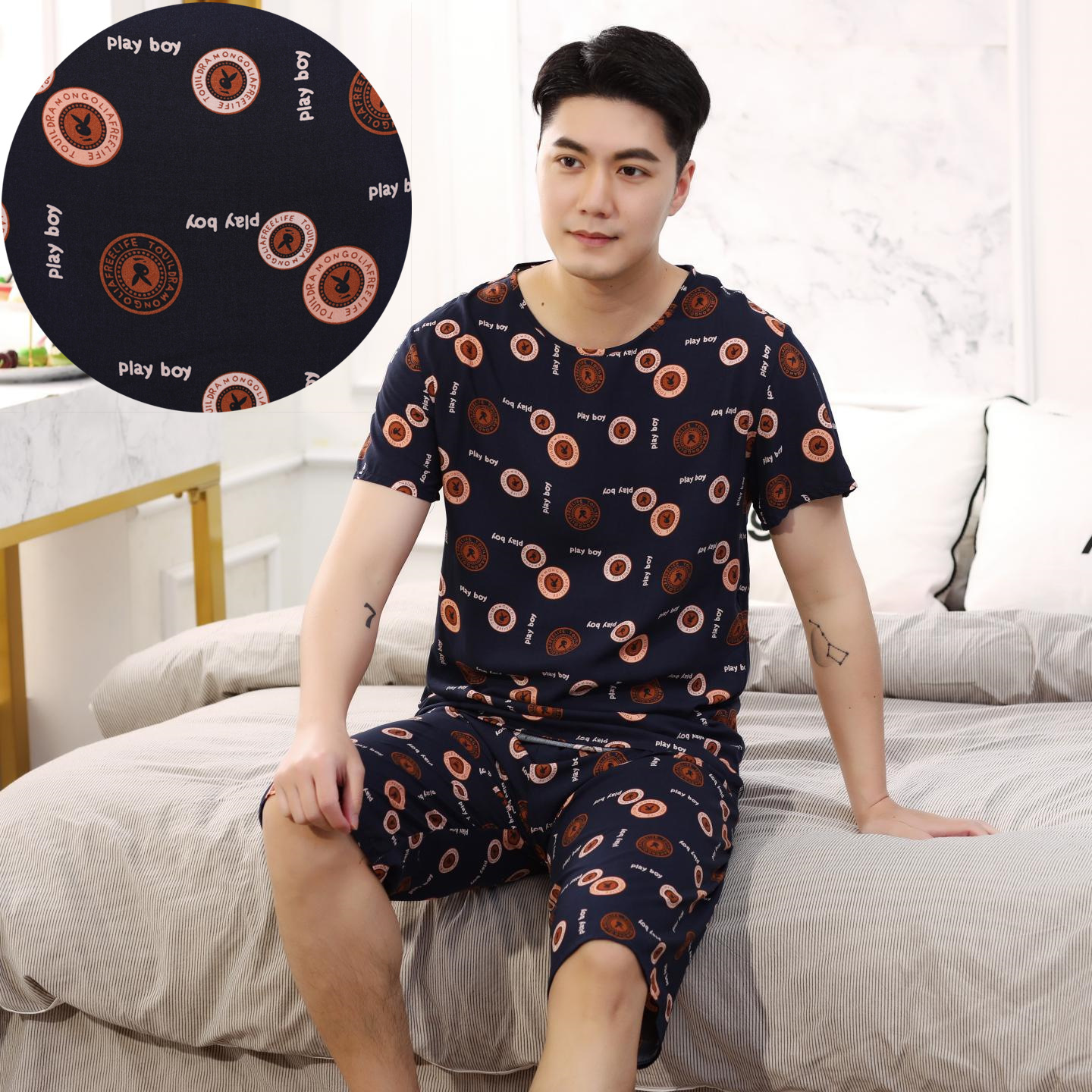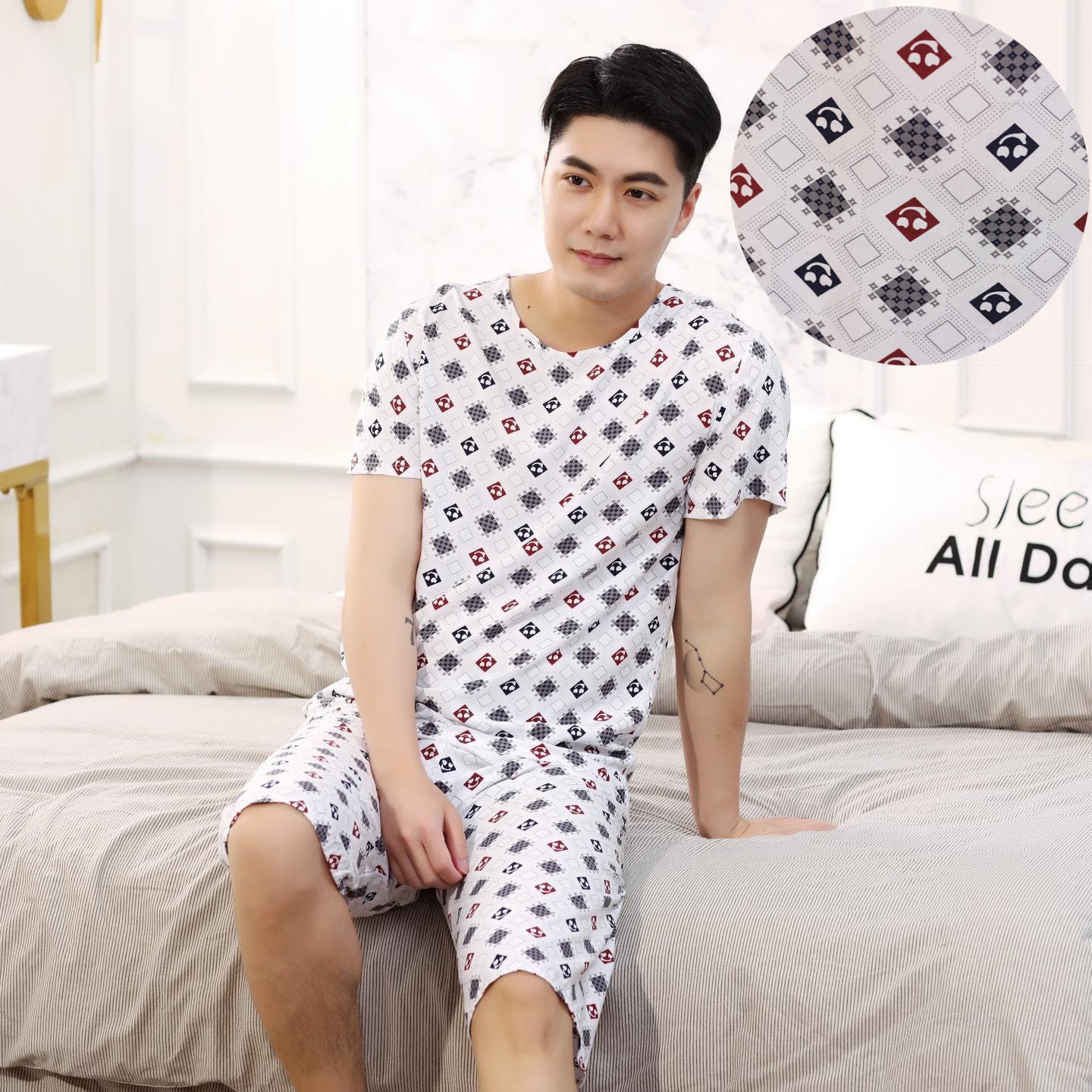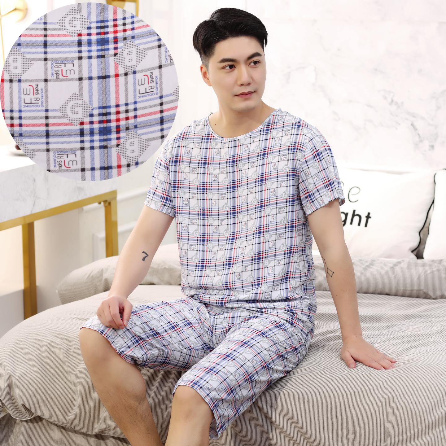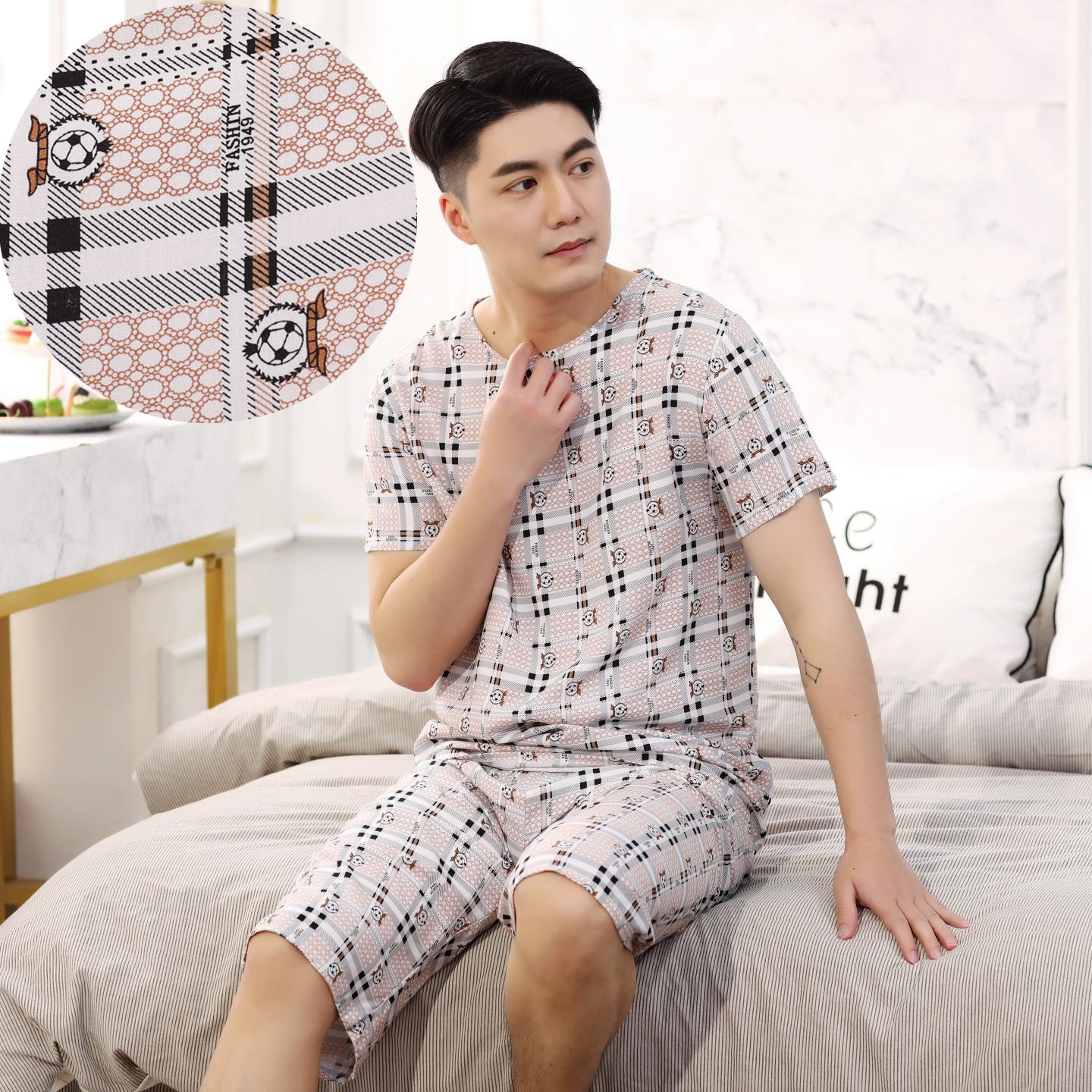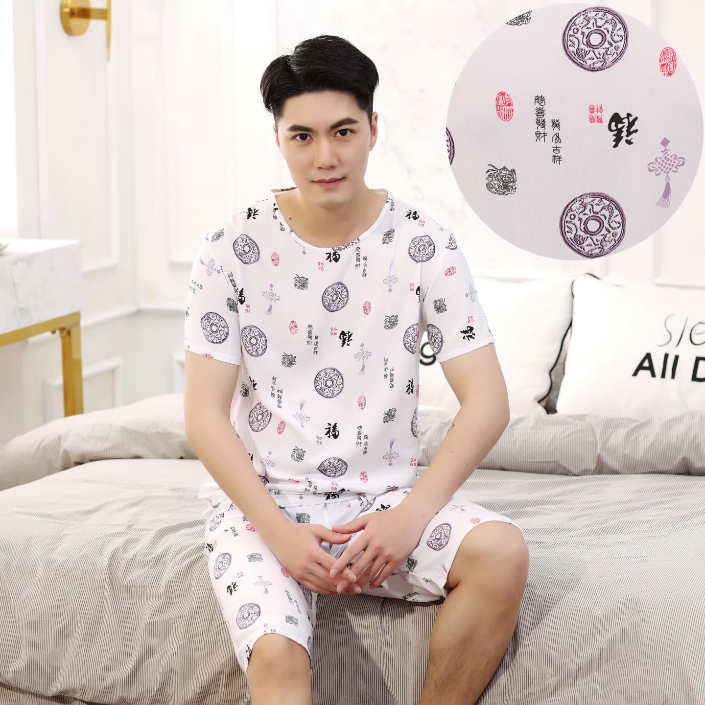아빠를위한 여름 중년 및 노인 남성용 면 실크 잠옷 중년 및 노인 반팔 가정 의류 인공 얇은 면 세트스토어 가기