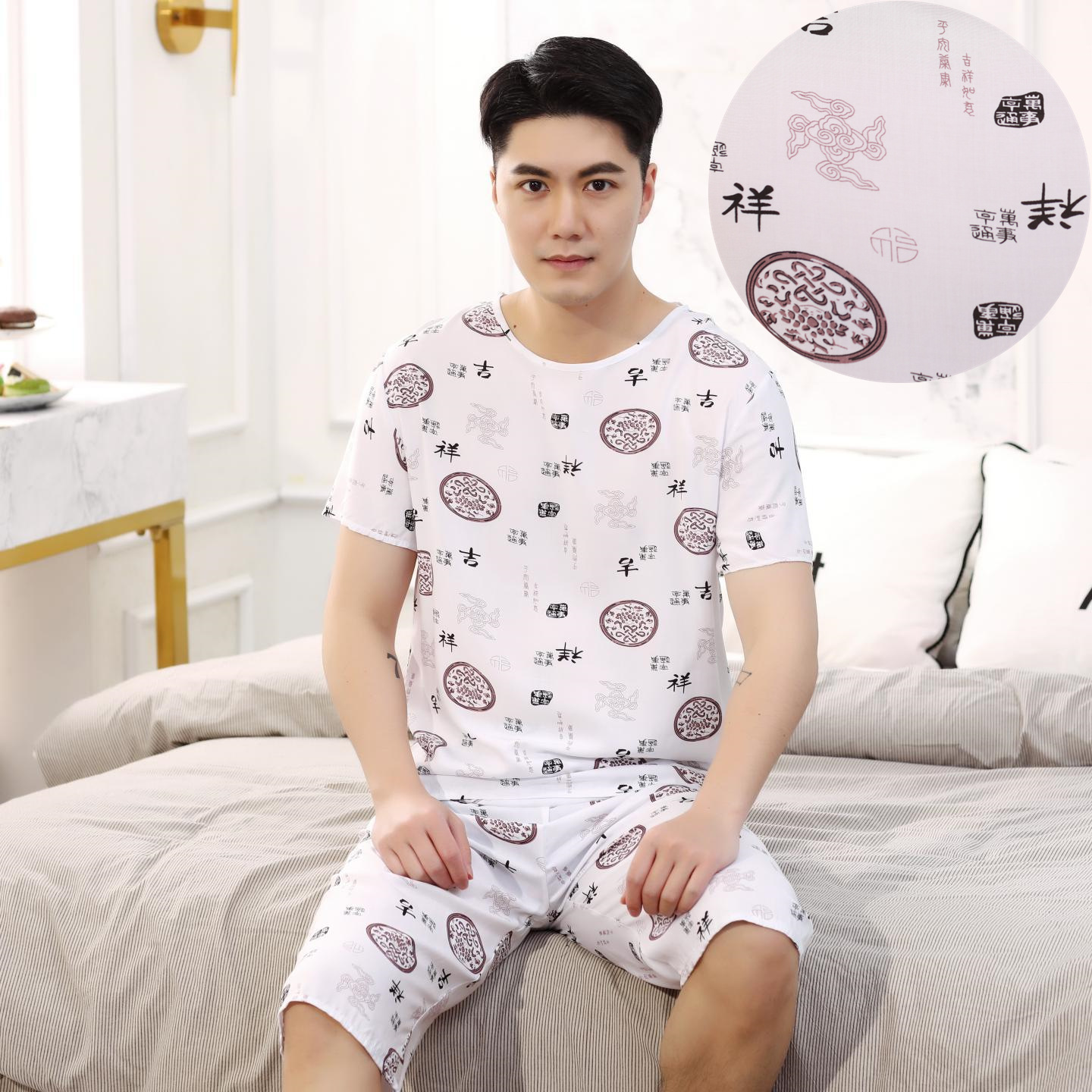 아빠를위한 여름 중년 및 노인 남성용 면 실크 잠옷 중년 및 노인 반팔 가정 의류 인공 얇은 면 세트