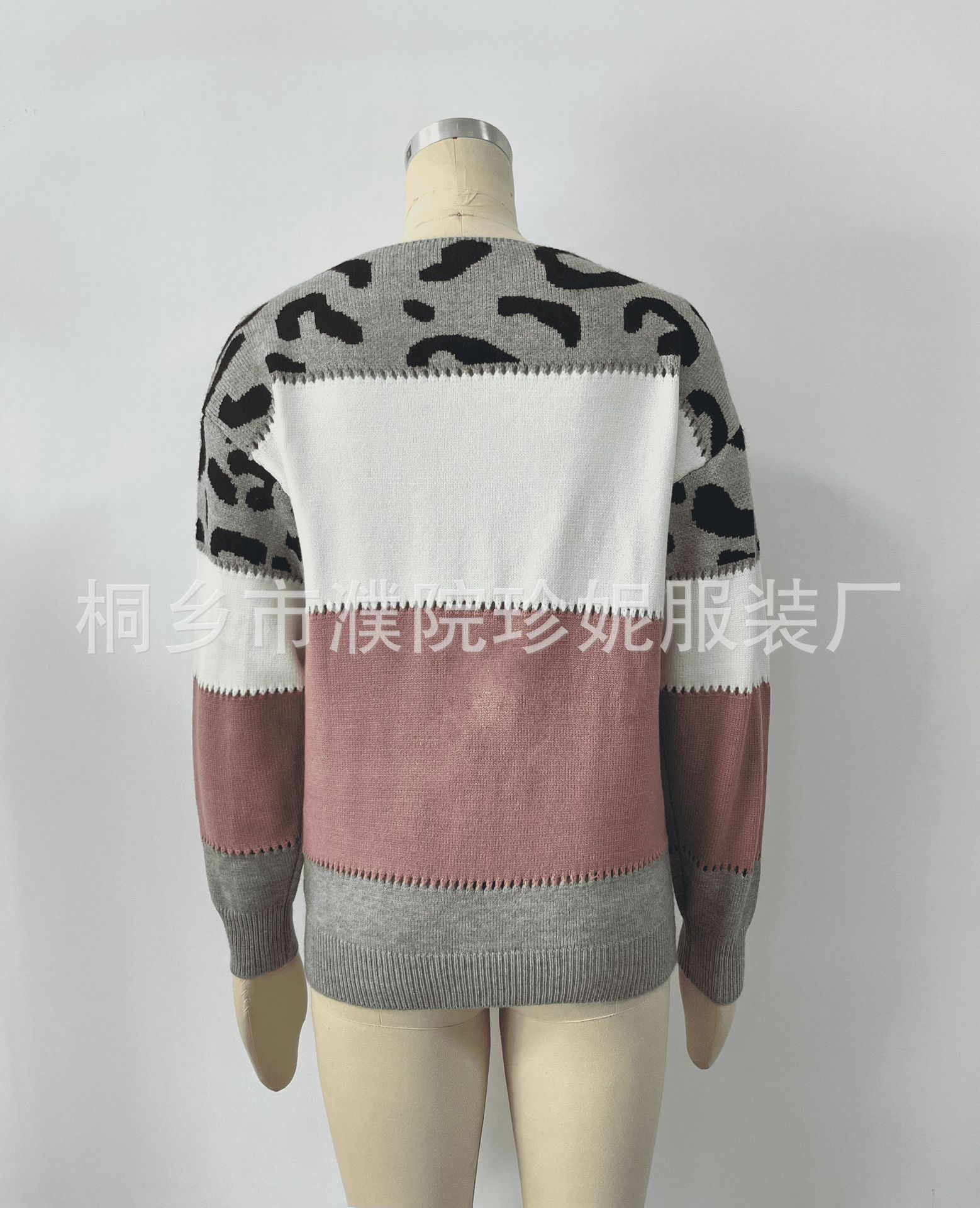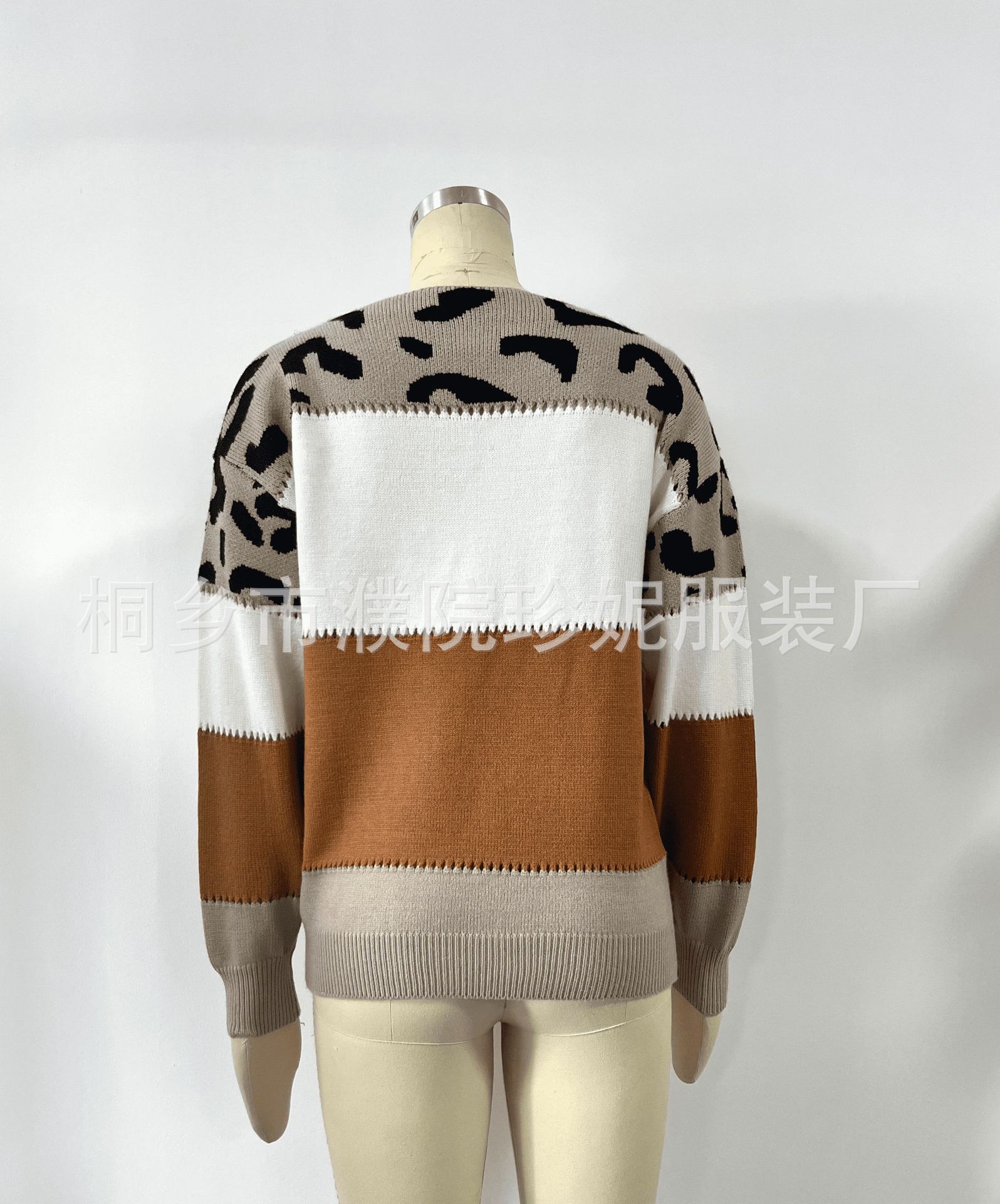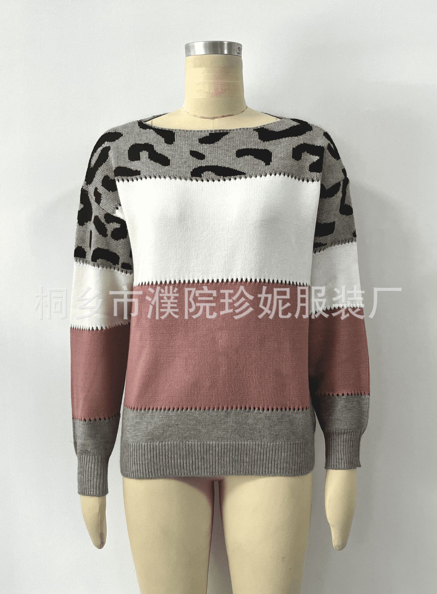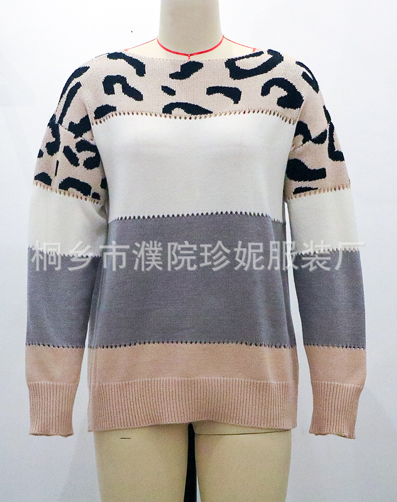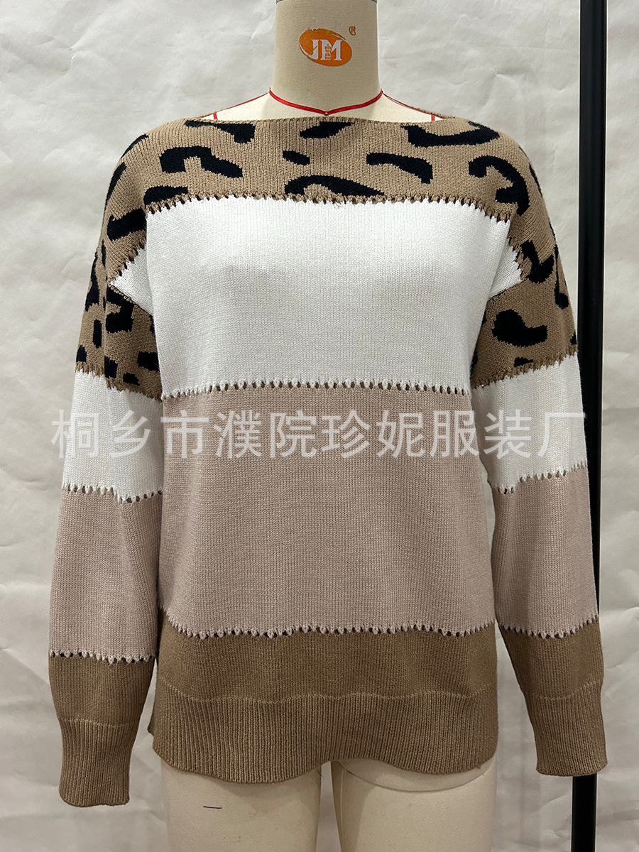 레오파드 컬러 매칭 라운드 넥 캐주얼 스웨터 가을과 겨울 새로운 크로스 보더 여성용 스웨터 여성용 긴팔 베이스 셔츠