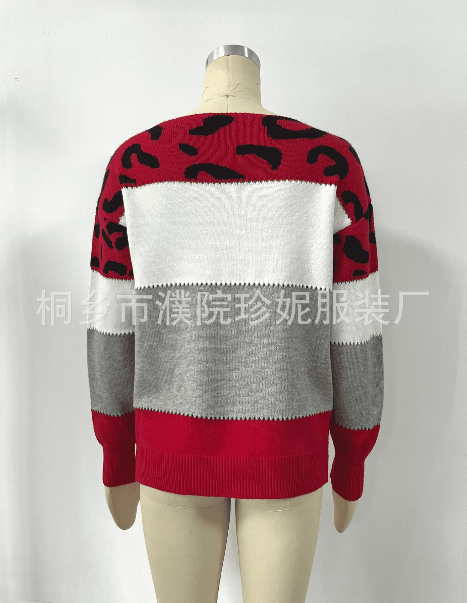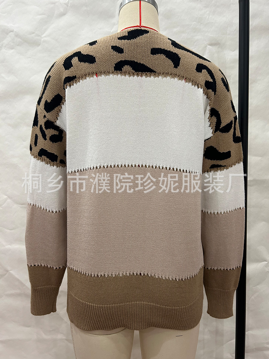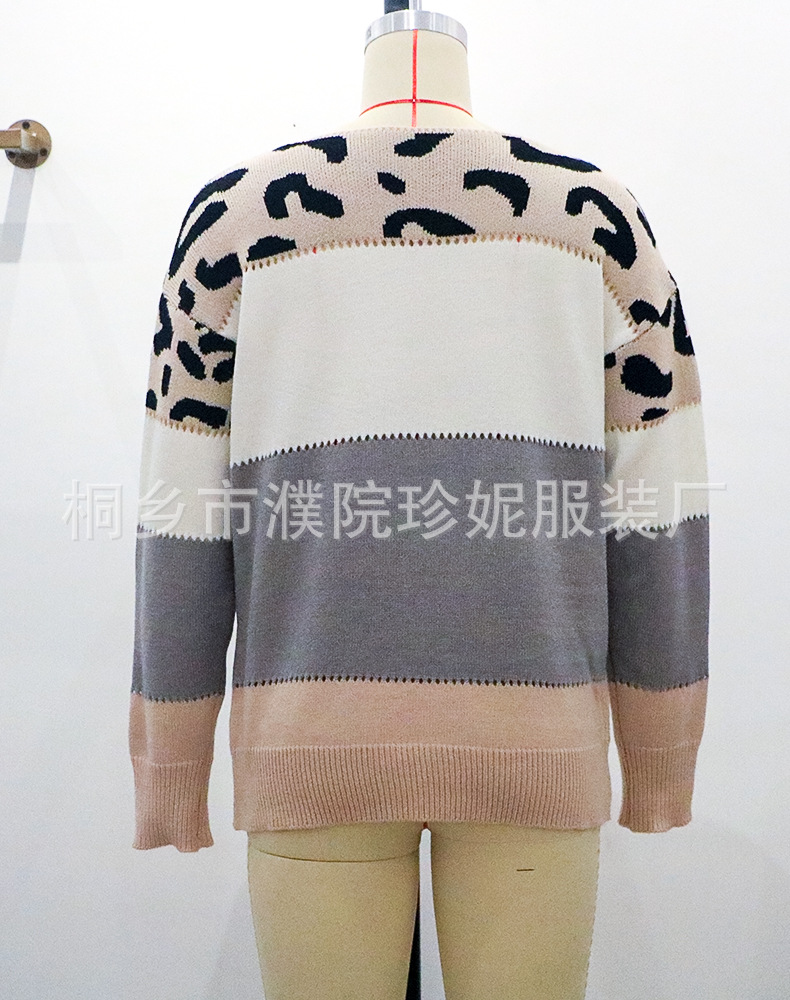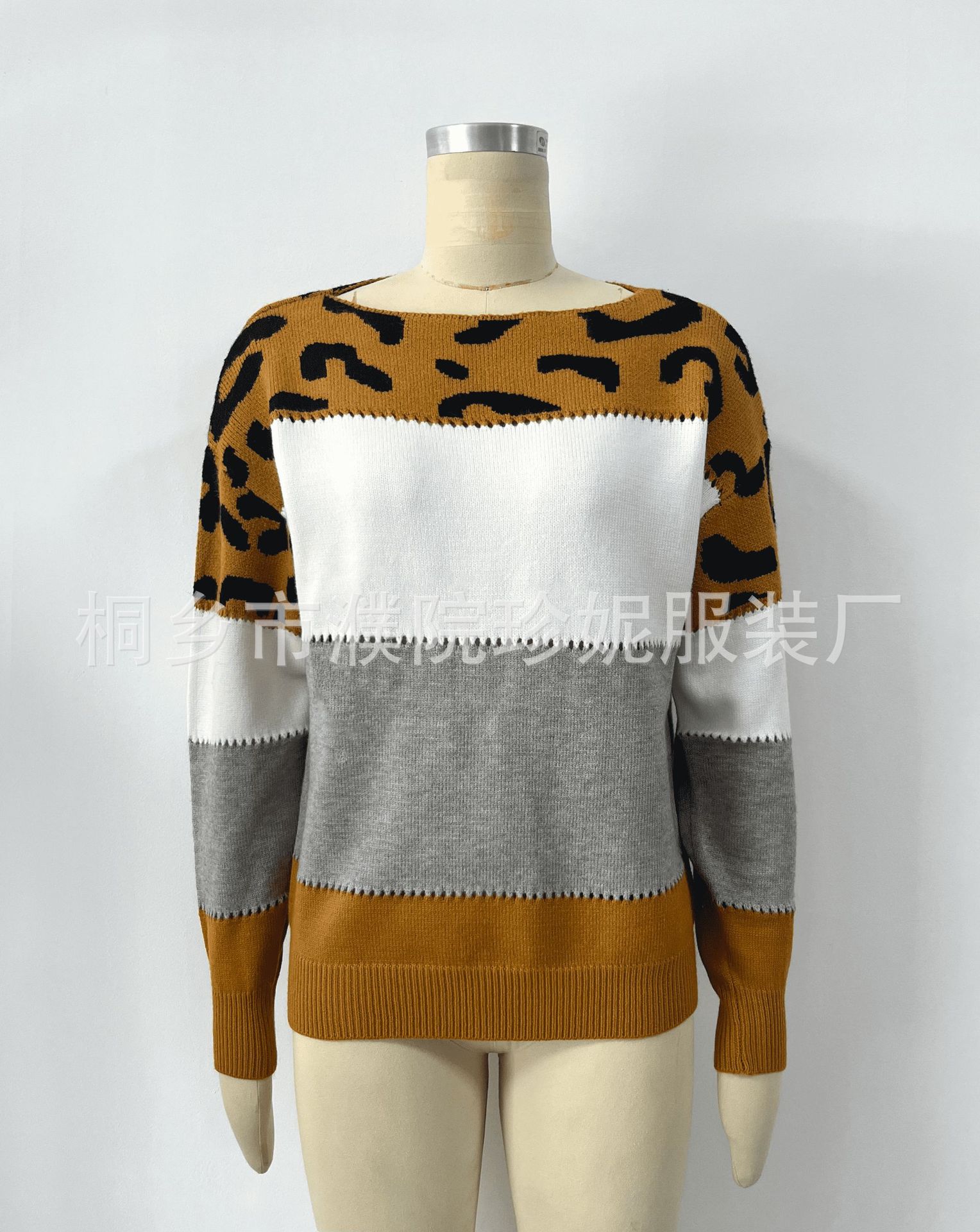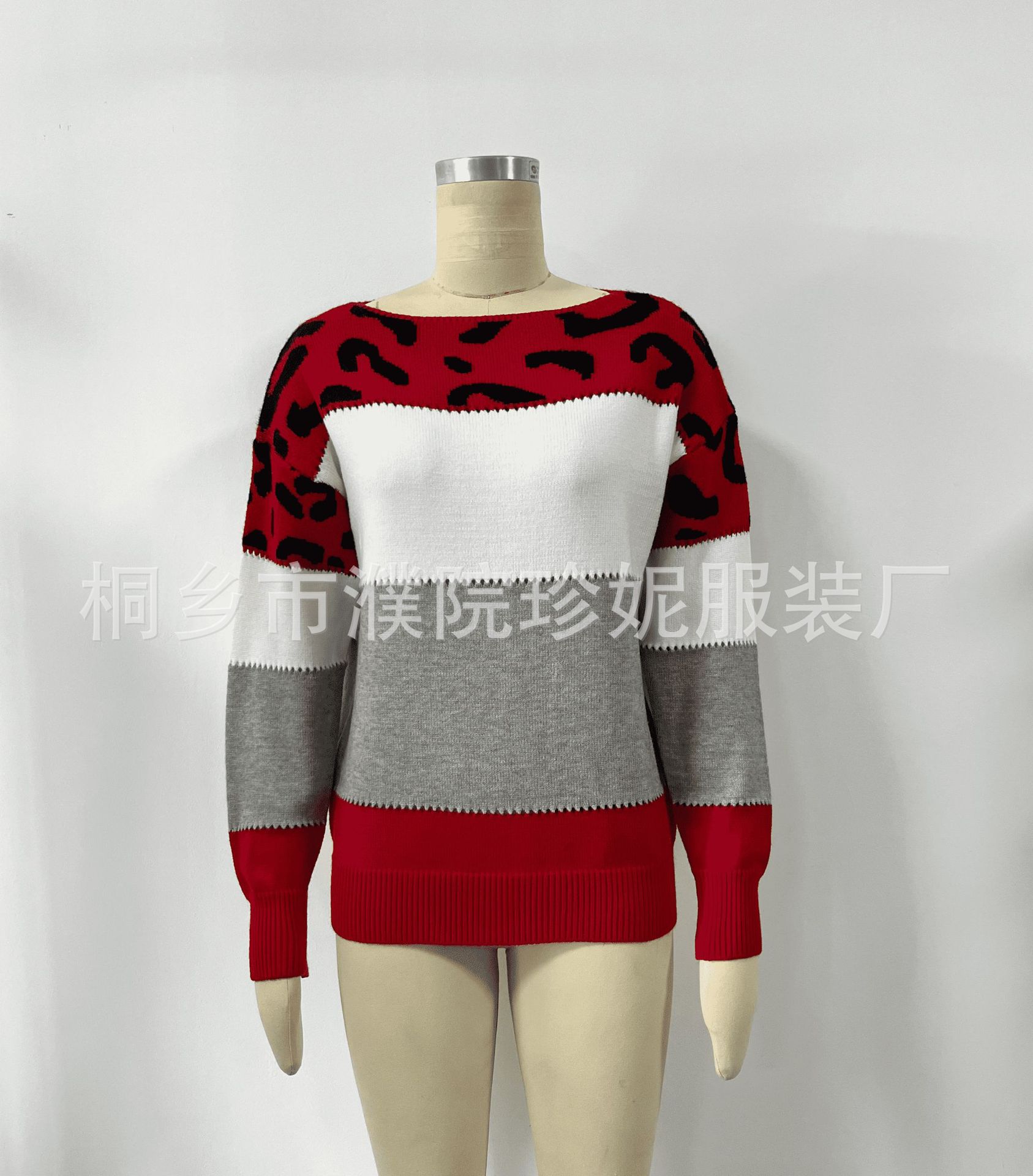 레오파드 컬러 매칭 라운드 넥 캐주얼 스웨터 가을과 겨울 새로운 크로스 보더 여성용 스웨터 여성용 긴팔 베이스 셔츠