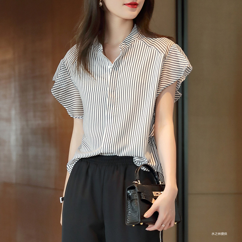 스트라이프 화이트 반팔 셔츠 여성용 새로운 2022 쉬폰 셔츠 셔츠 여름 러플 탑 디자인 감각 틈새스토어 가기