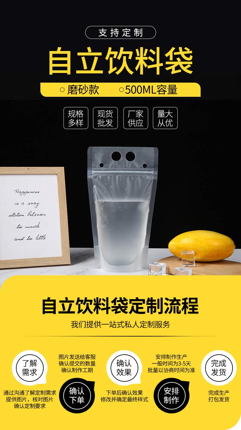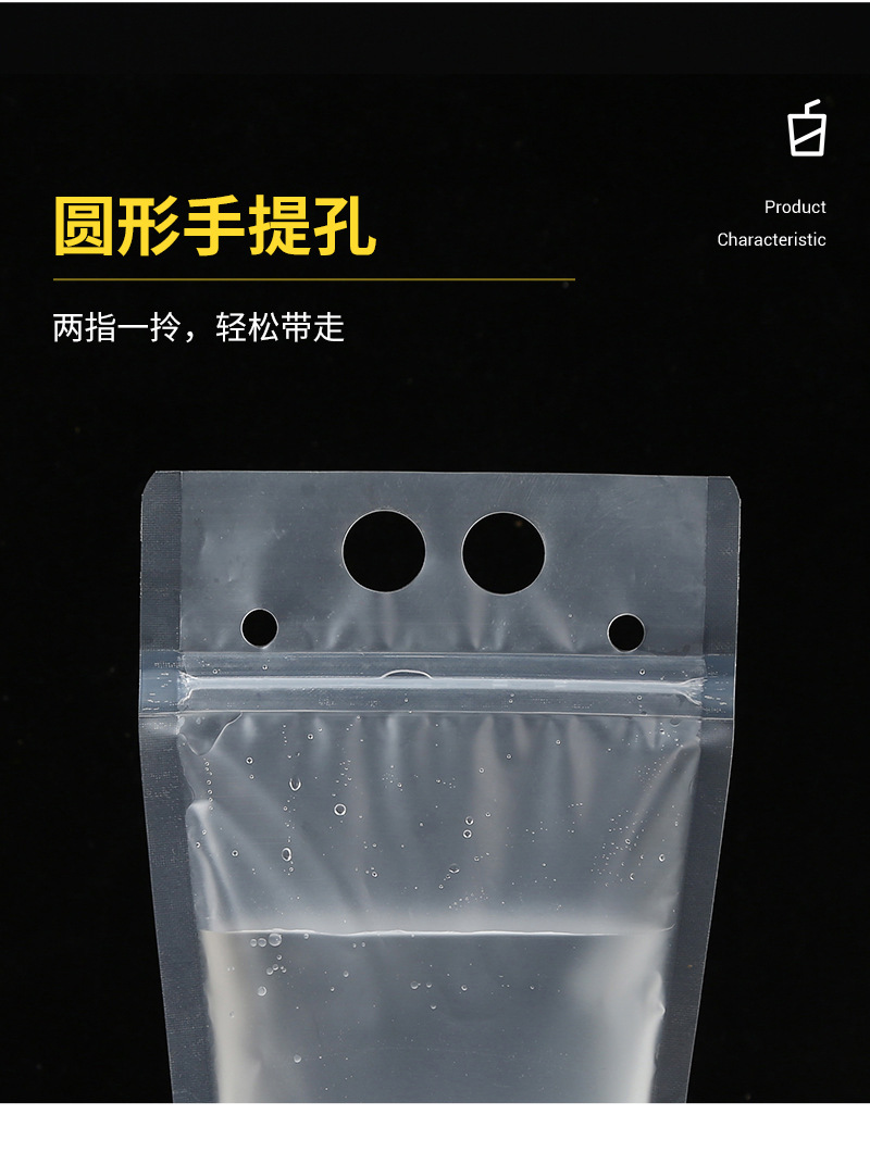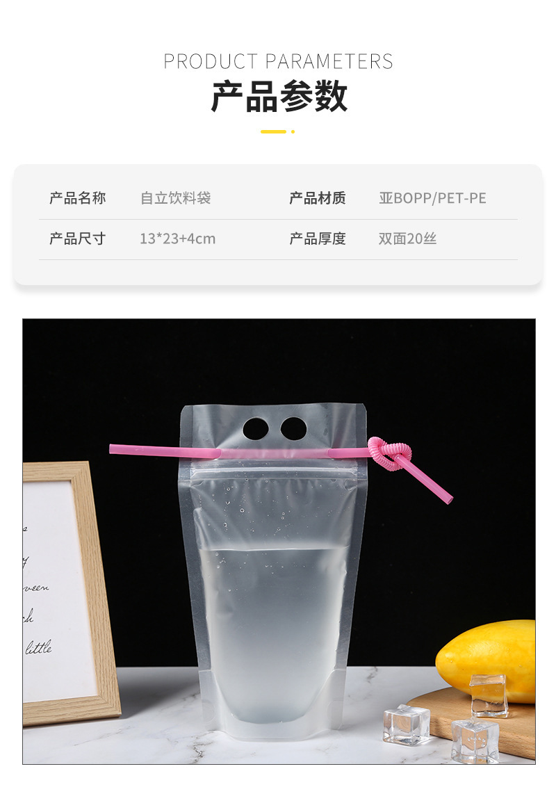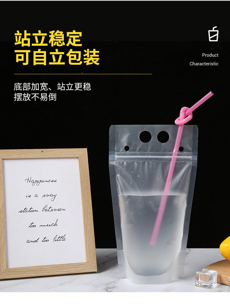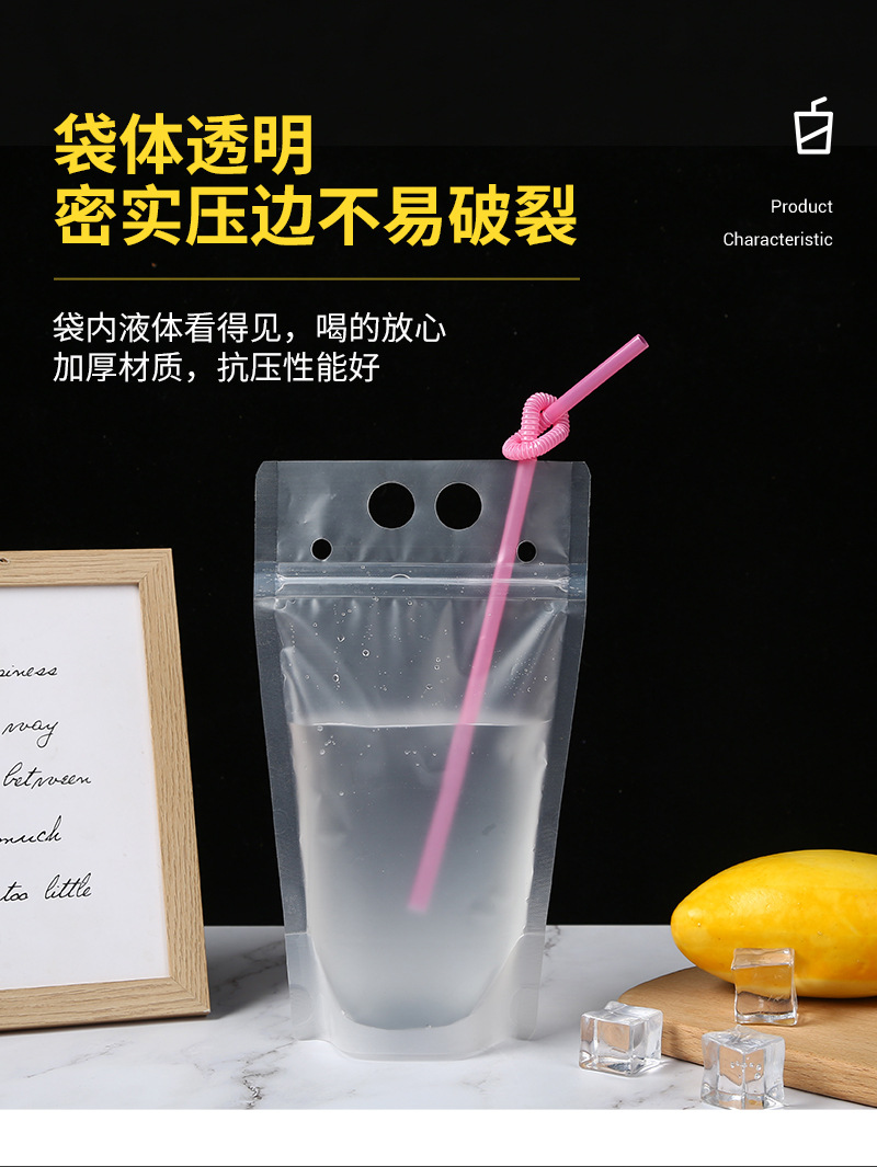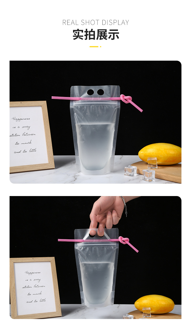 注意:饮料袋只能现喝现用,放店里用(如:奶茶店),不能用来运输和倒着放,产品会漏。 而且只能放温的和冷的,不可以放热!