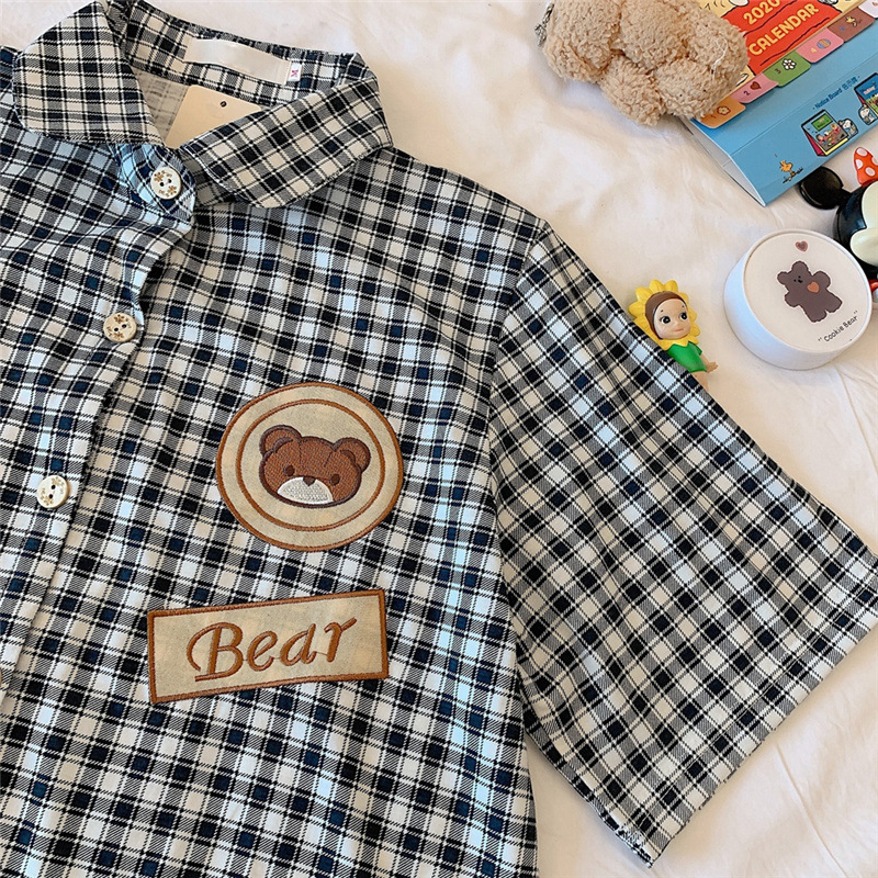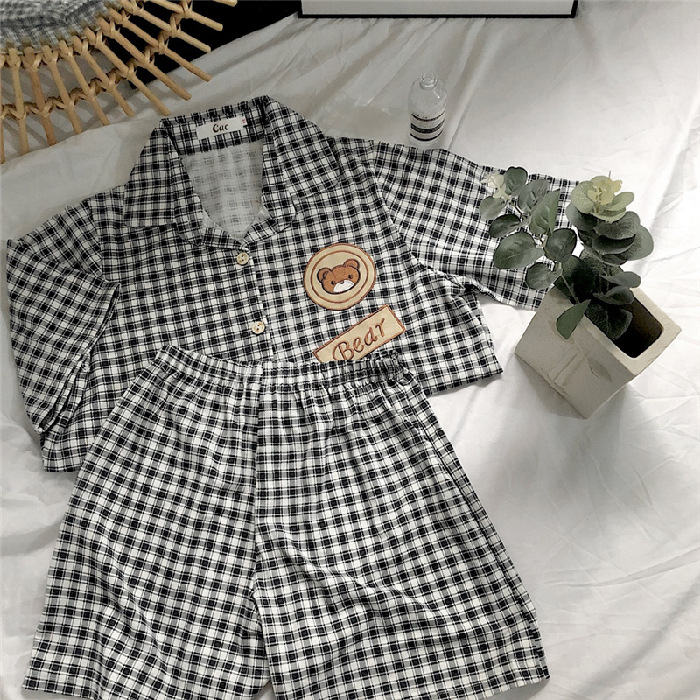 동남 아시아 여름 짧은 소매 반바지 카디건 잠옷 여성 귀여운 만화 Homewear 정장 여성 격자 무늬 곰 잠옷