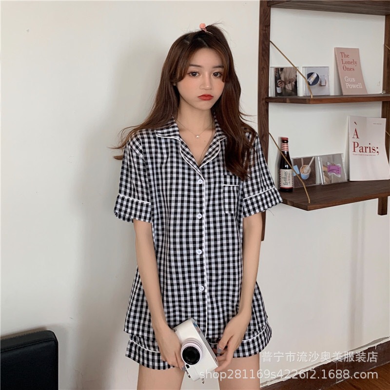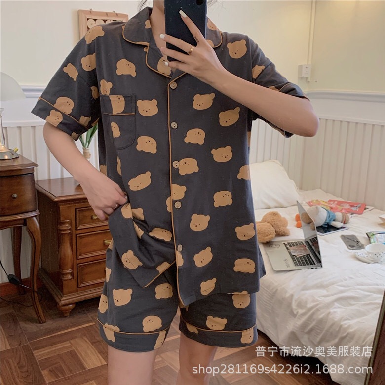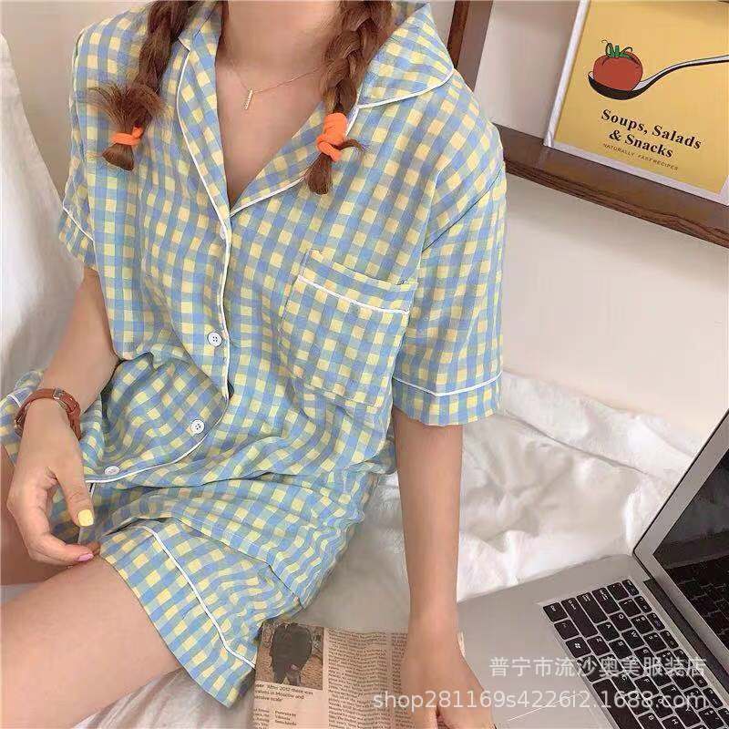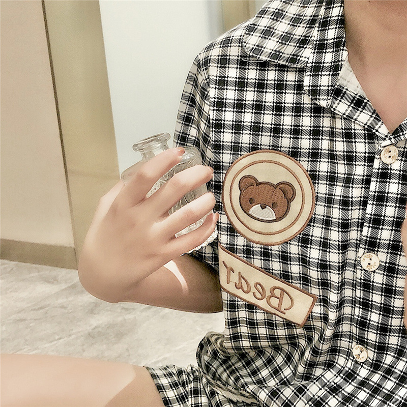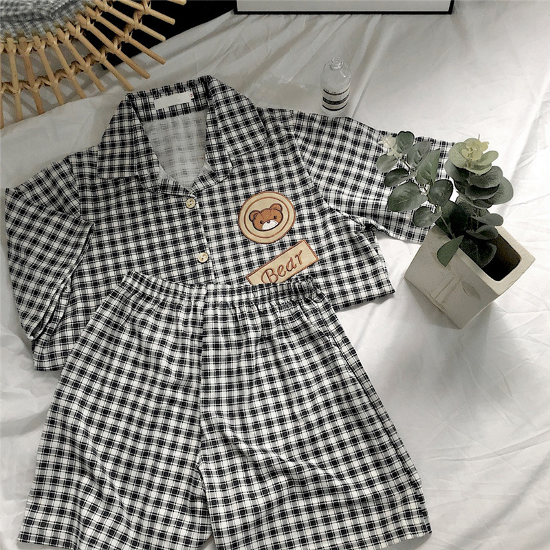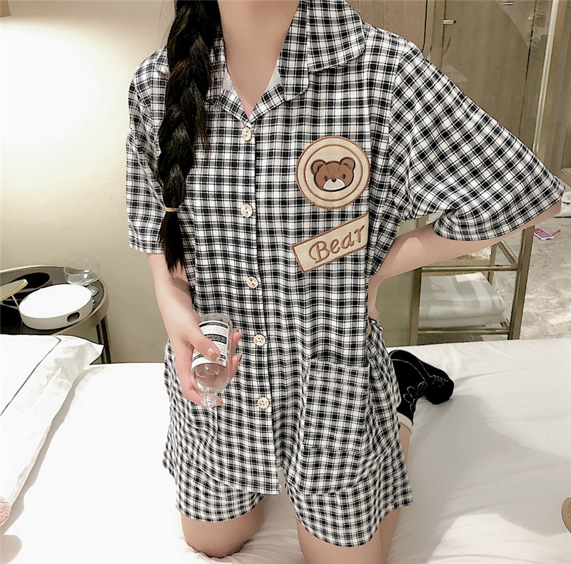 동남 아시아 여름 짧은 소매 반바지 카디건 잠옷 여성 귀여운 만화 Homewear 정장 여성 격자 무늬 곰 잠옷스토어 가기